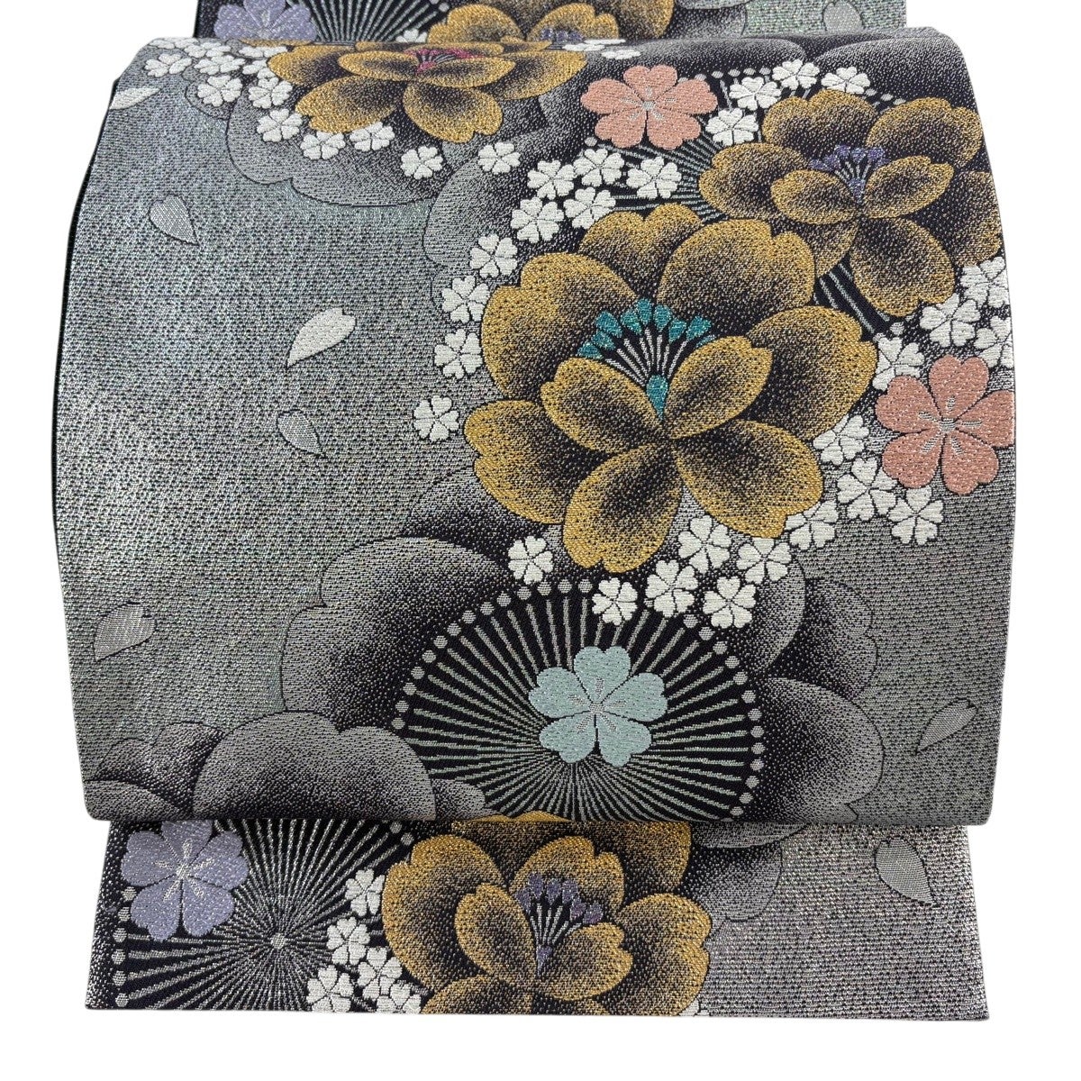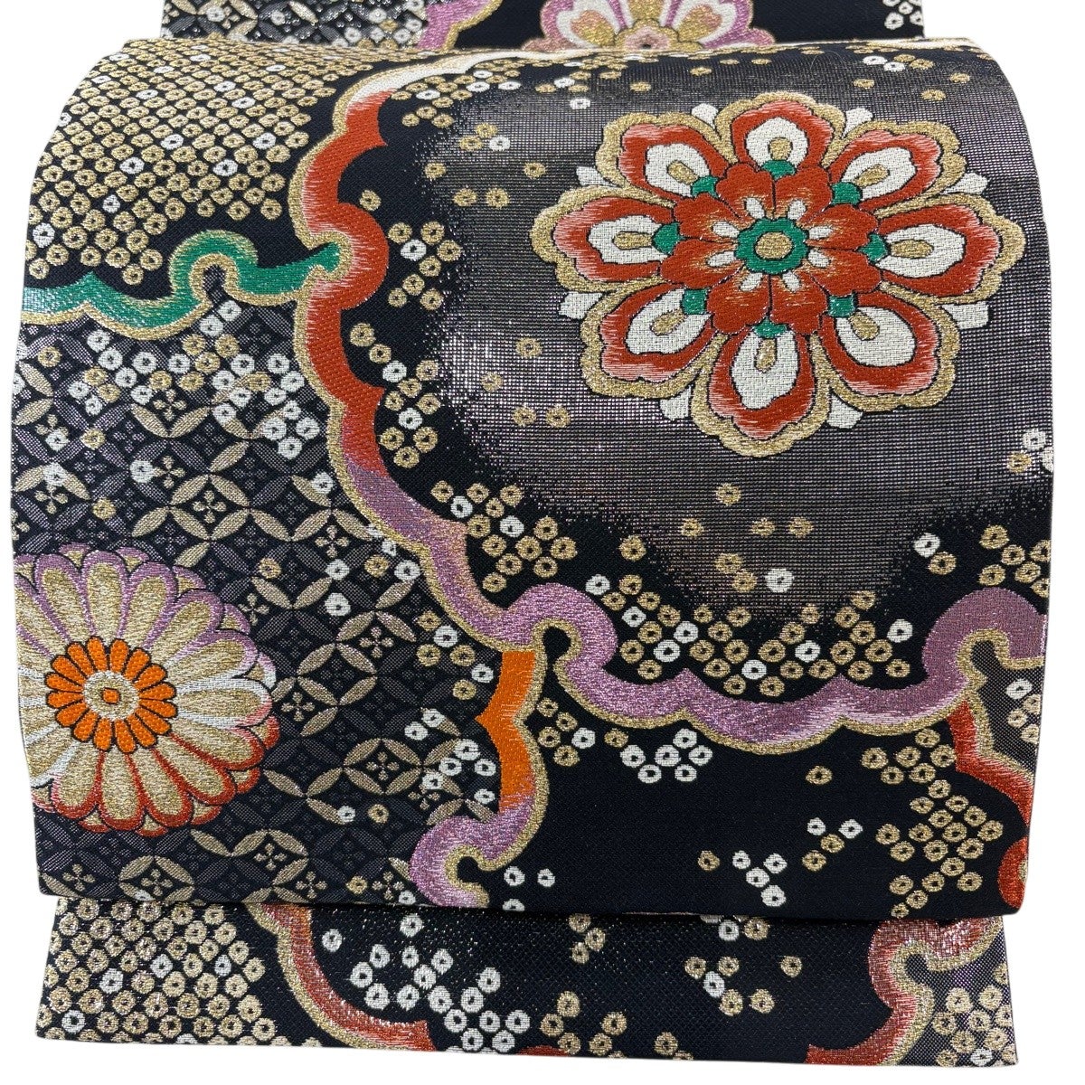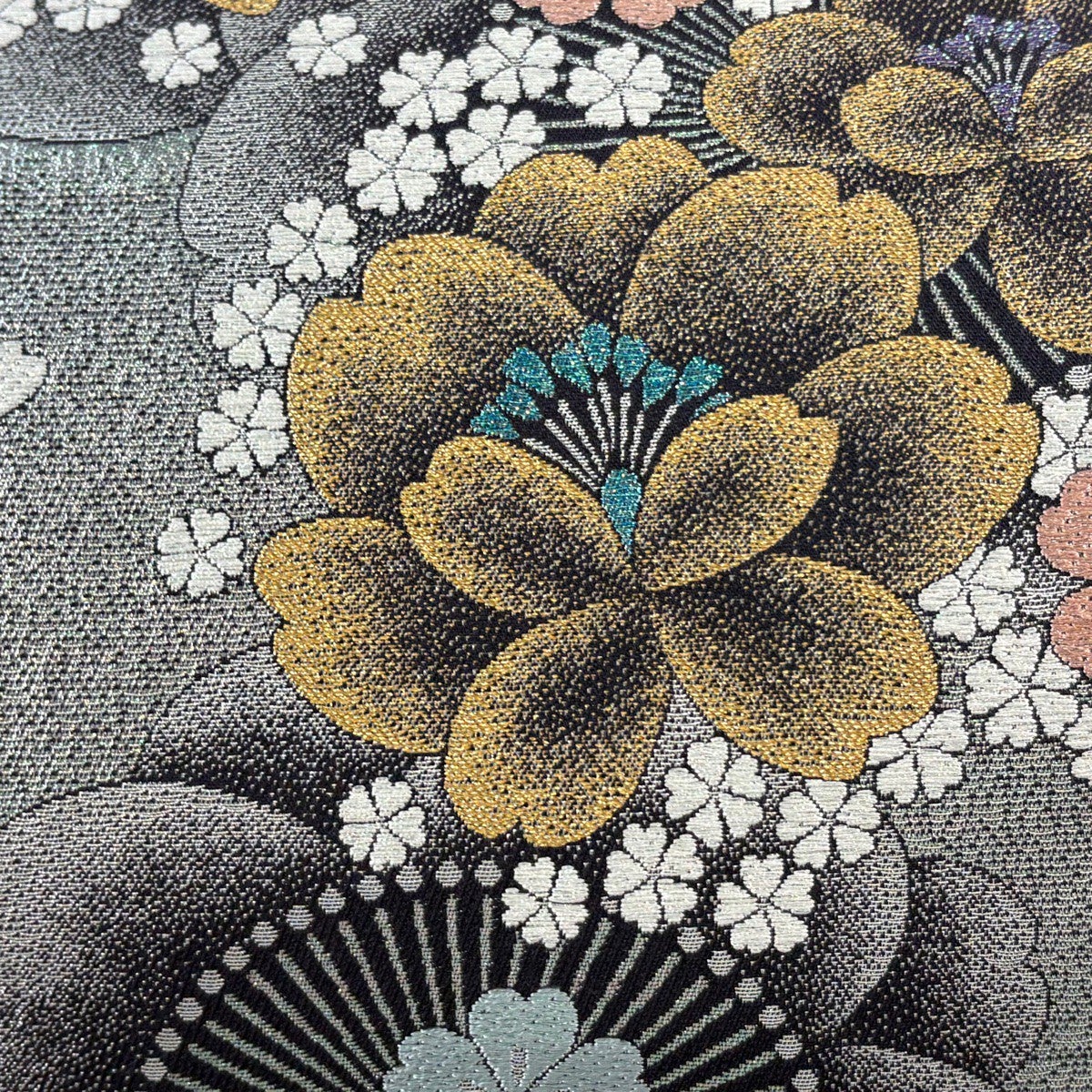 【美品】 袋帯 秀品 花 菊 箔 金糸 黒灰 六通 正絹