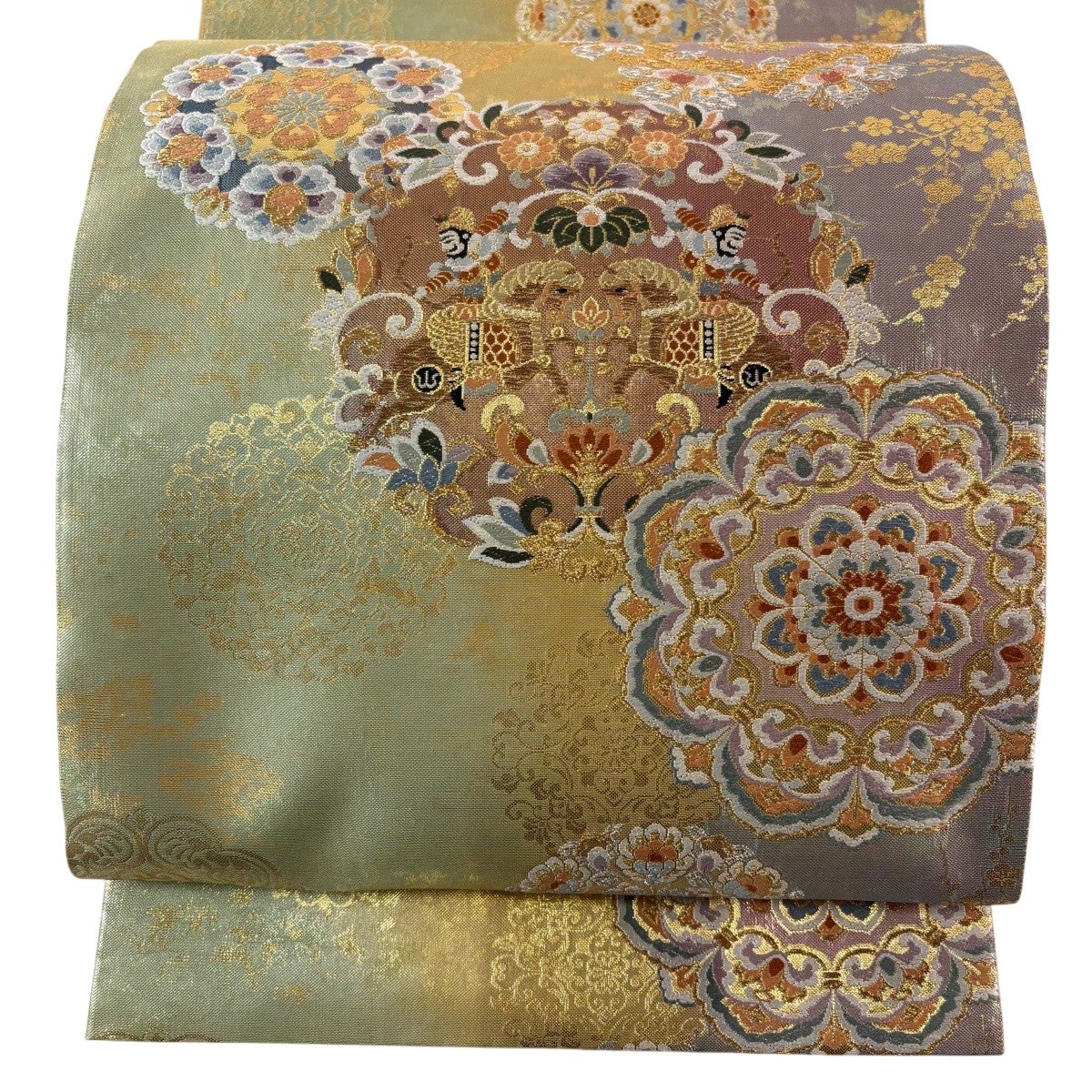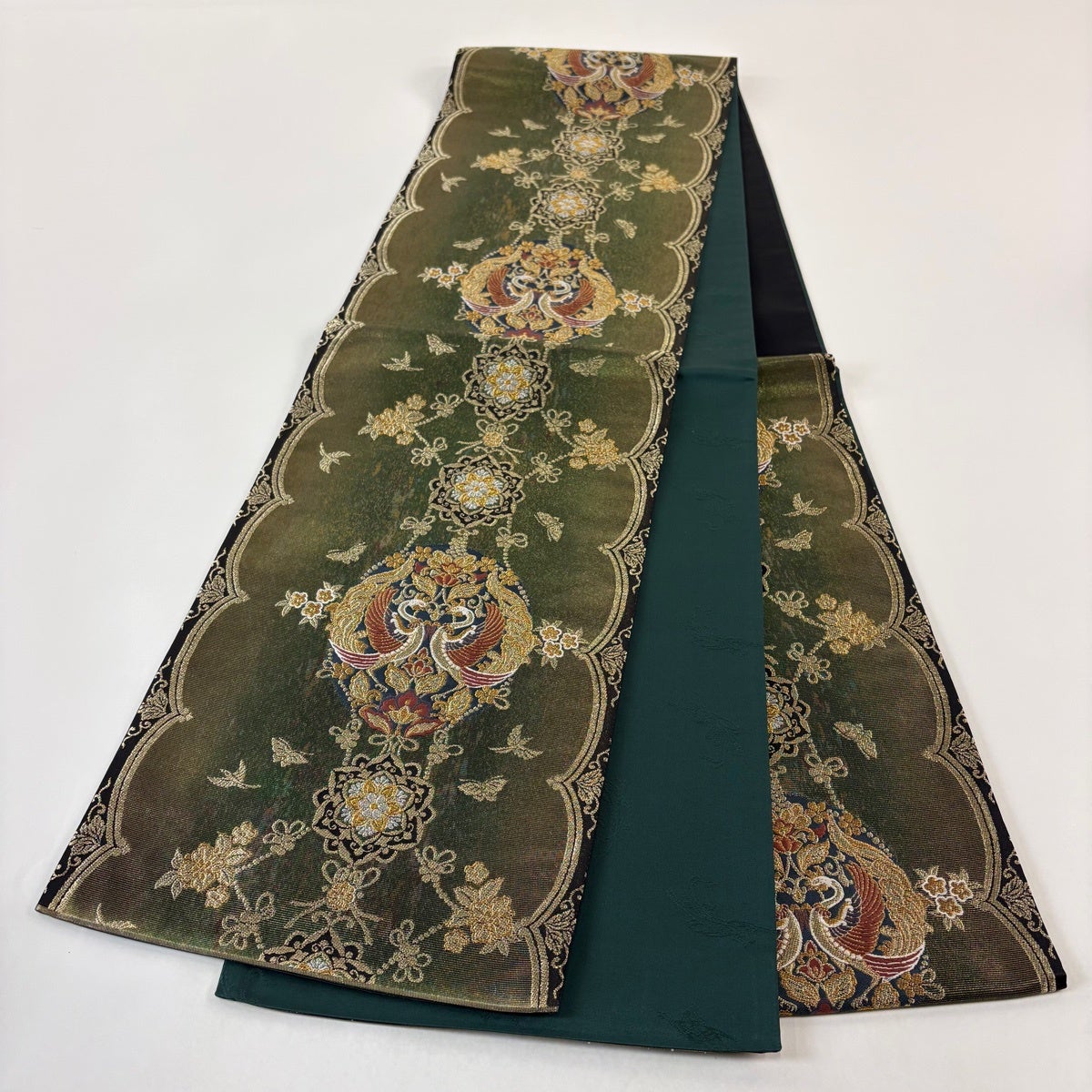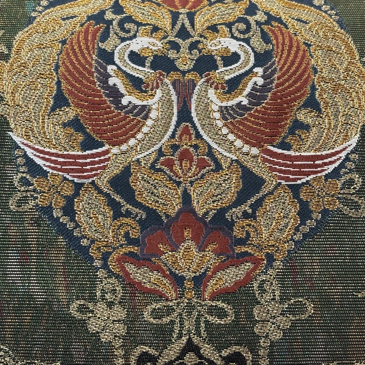 【美品】 袋帯 秀品 華文 向かい鳥 唐織 箔 金色 六通 正絹