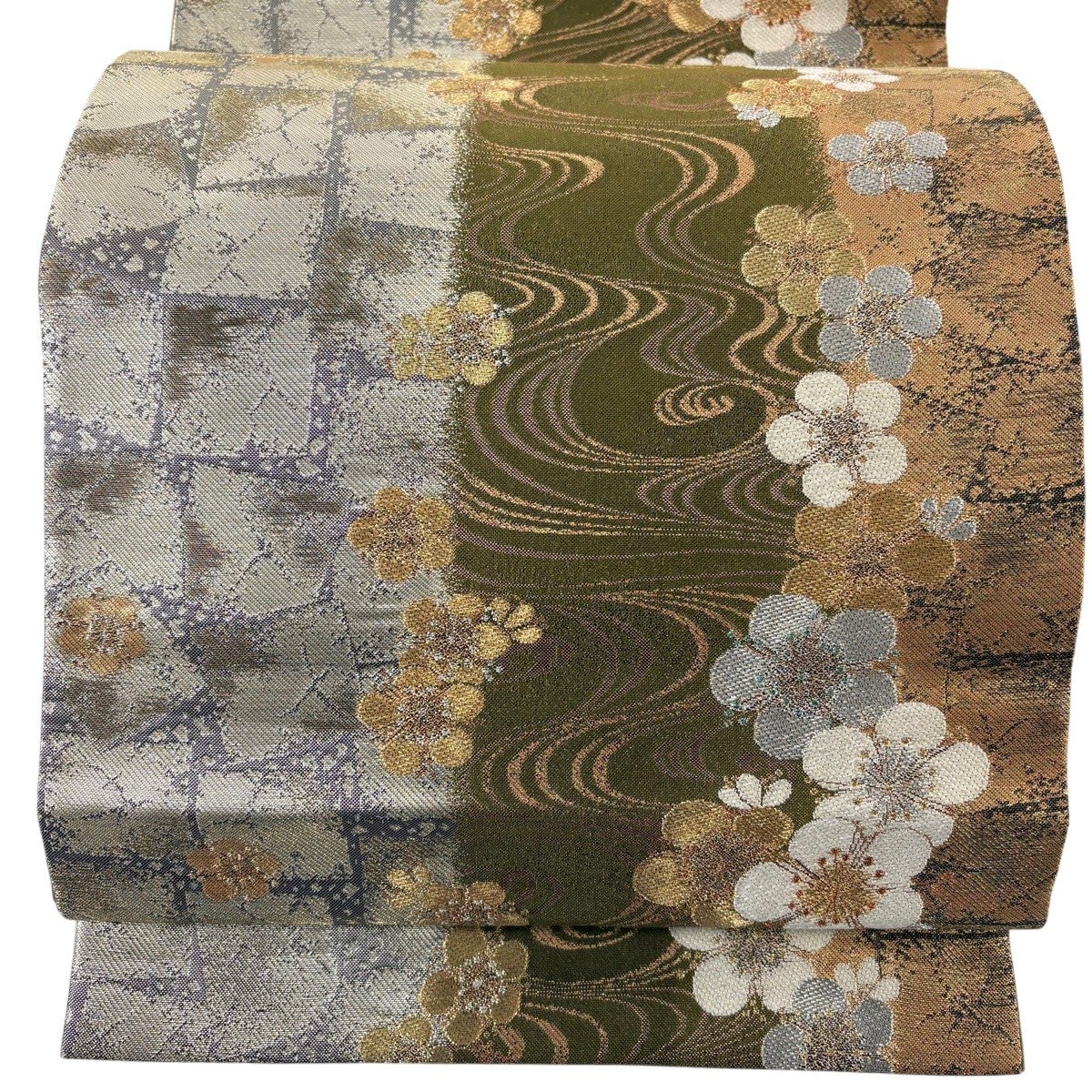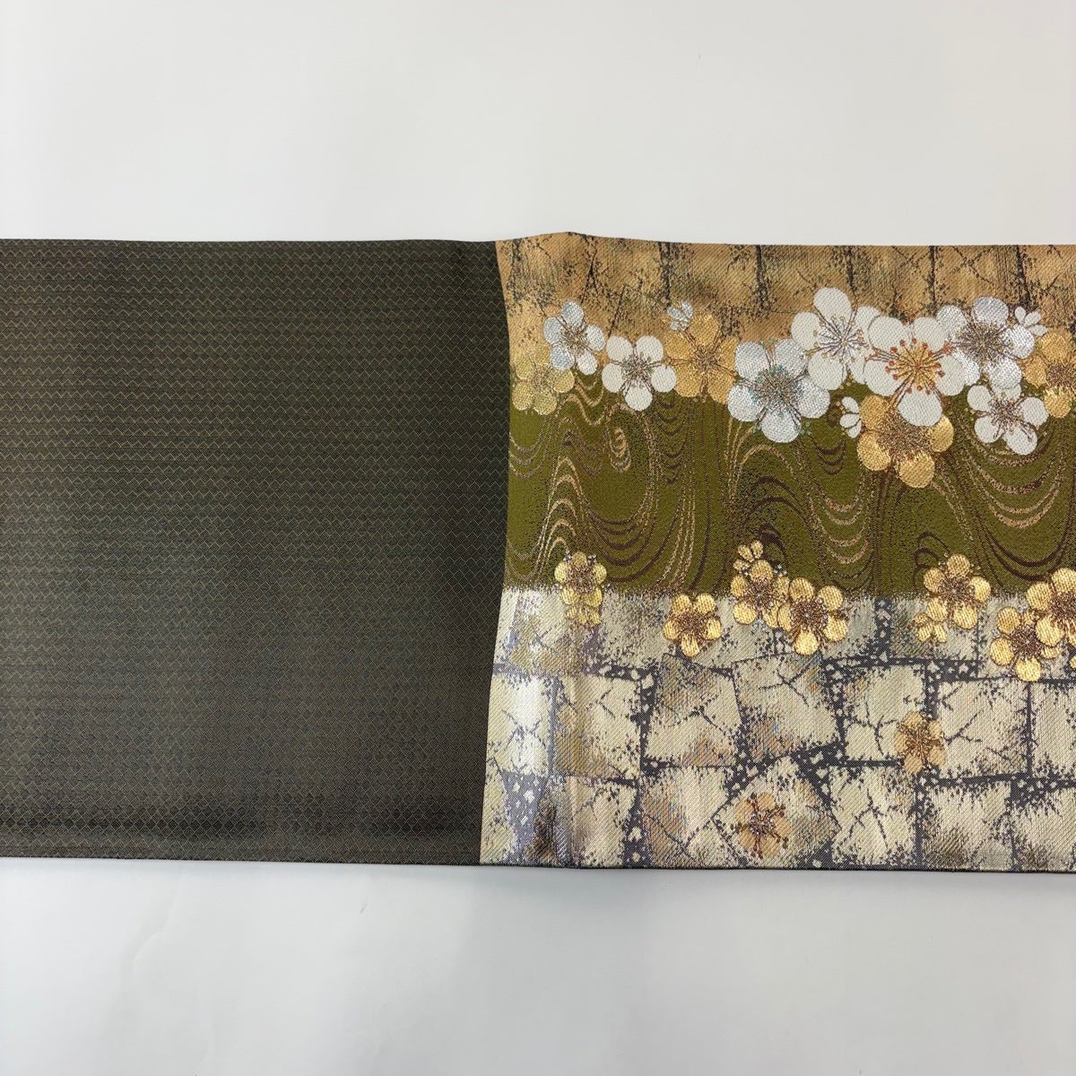 【美品】 袋帯 秀品 振袖向き 梅 箔 金糸 灰緑 六通 正絹