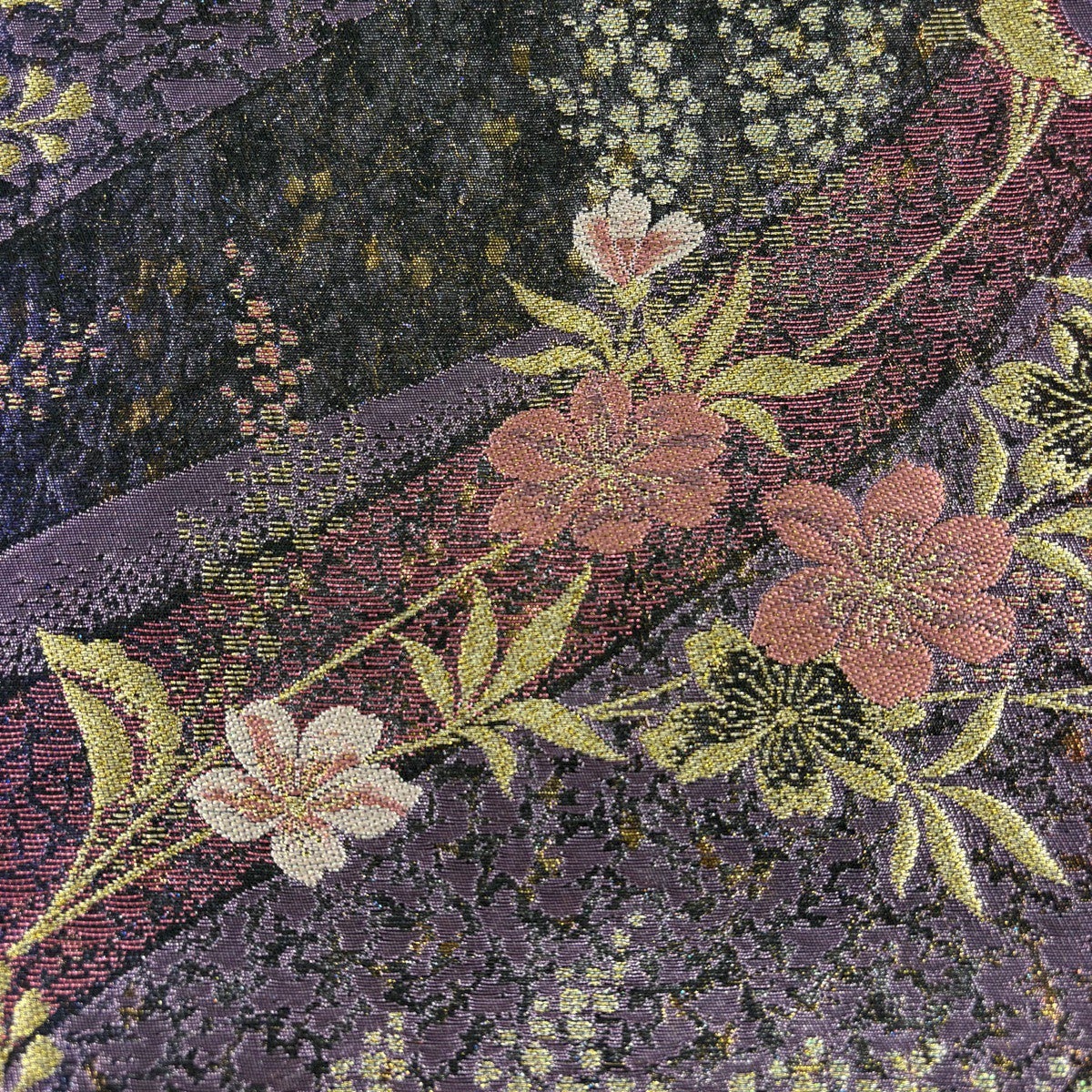 【美品】 袋帯 秀品 鈴乃屋 流水 花びら 金糸 刺繍 濃紫 六通 正絹