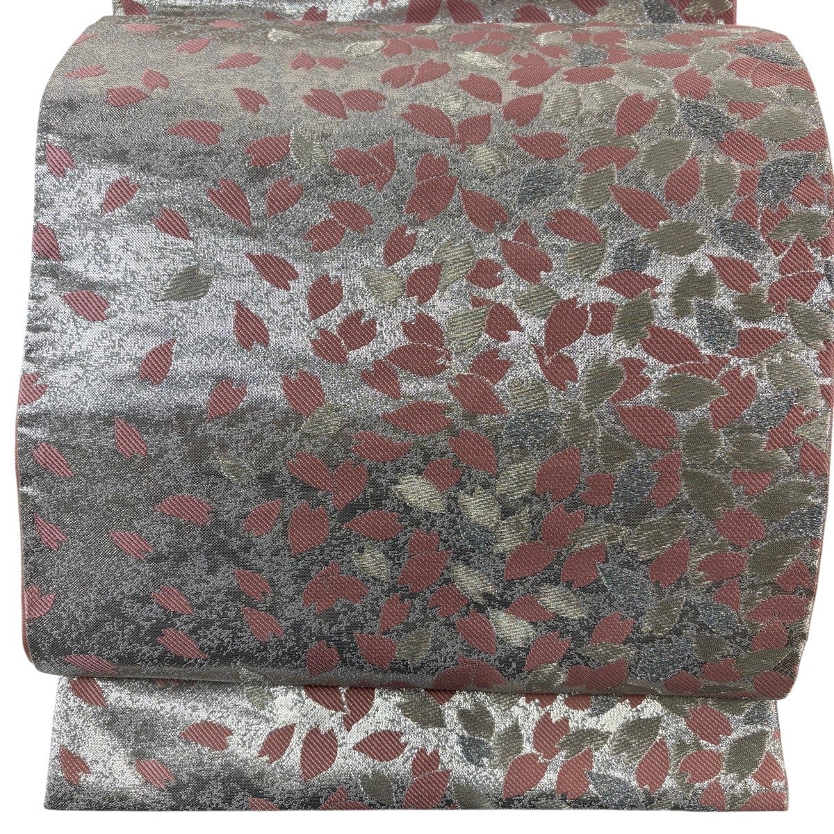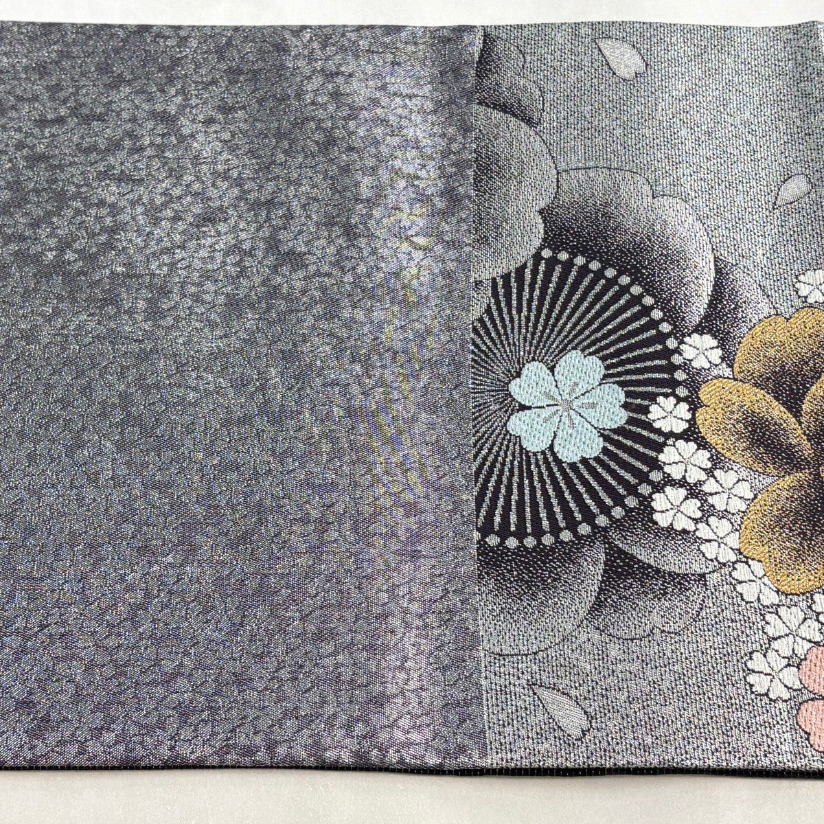 【美品】 袋帯 秀品 やまと 桜 草花 金銀糸 箔 青灰色 六通 正絹