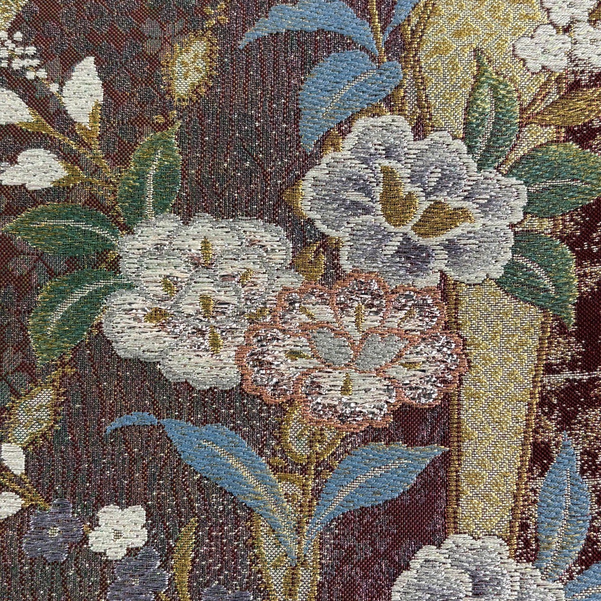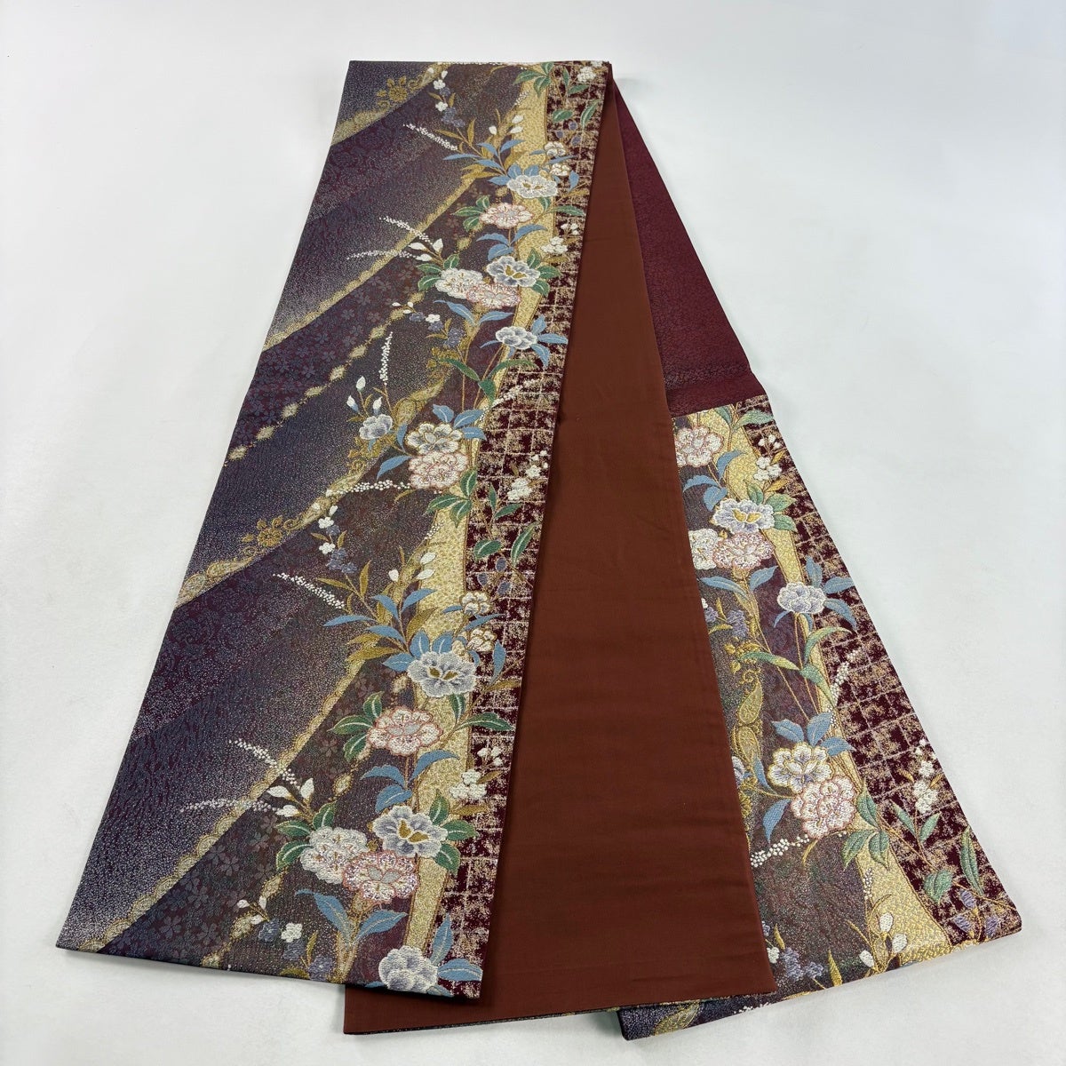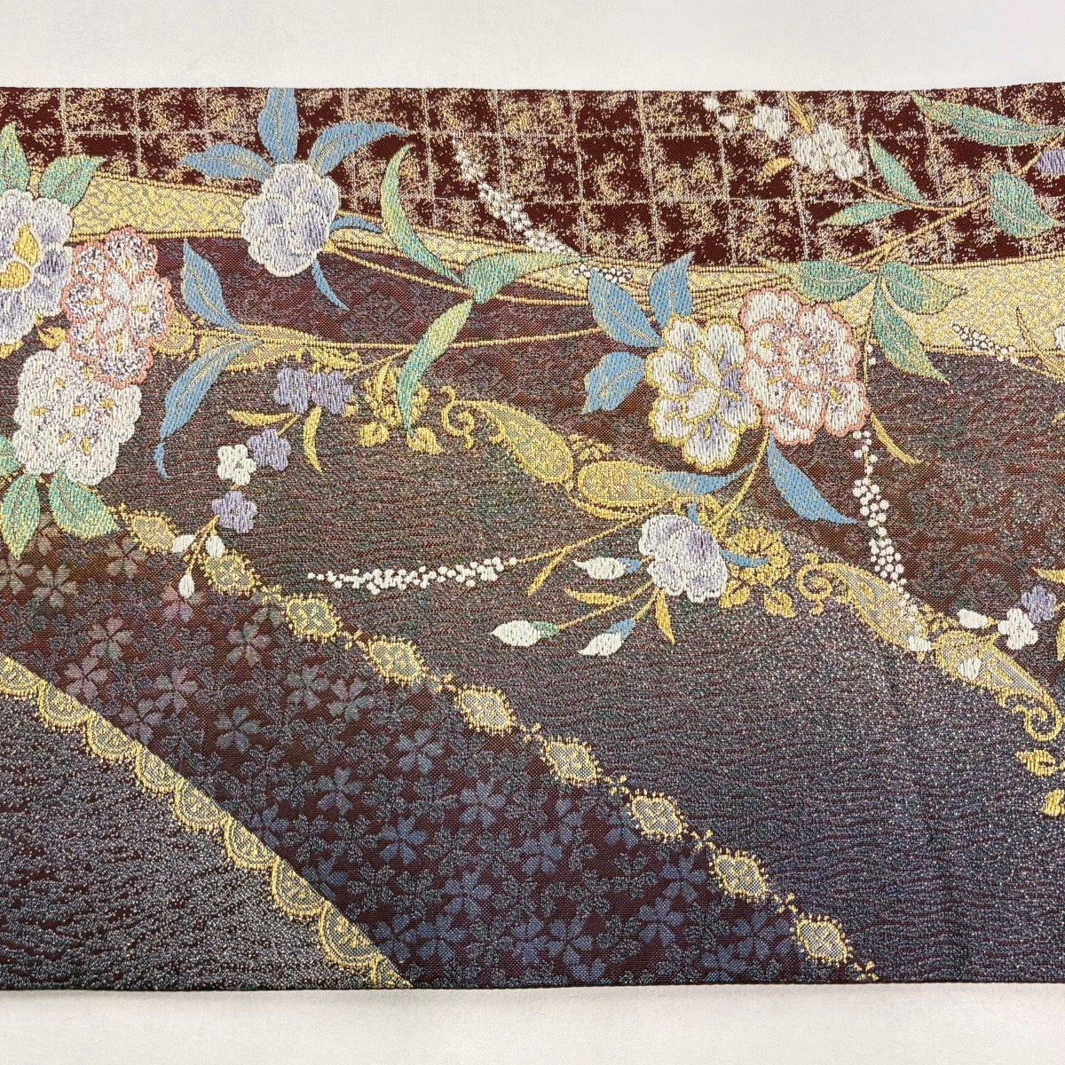 【美品】 袋帯 秀品 草花 金銀糸 唐織 茶紫 全通 正絹