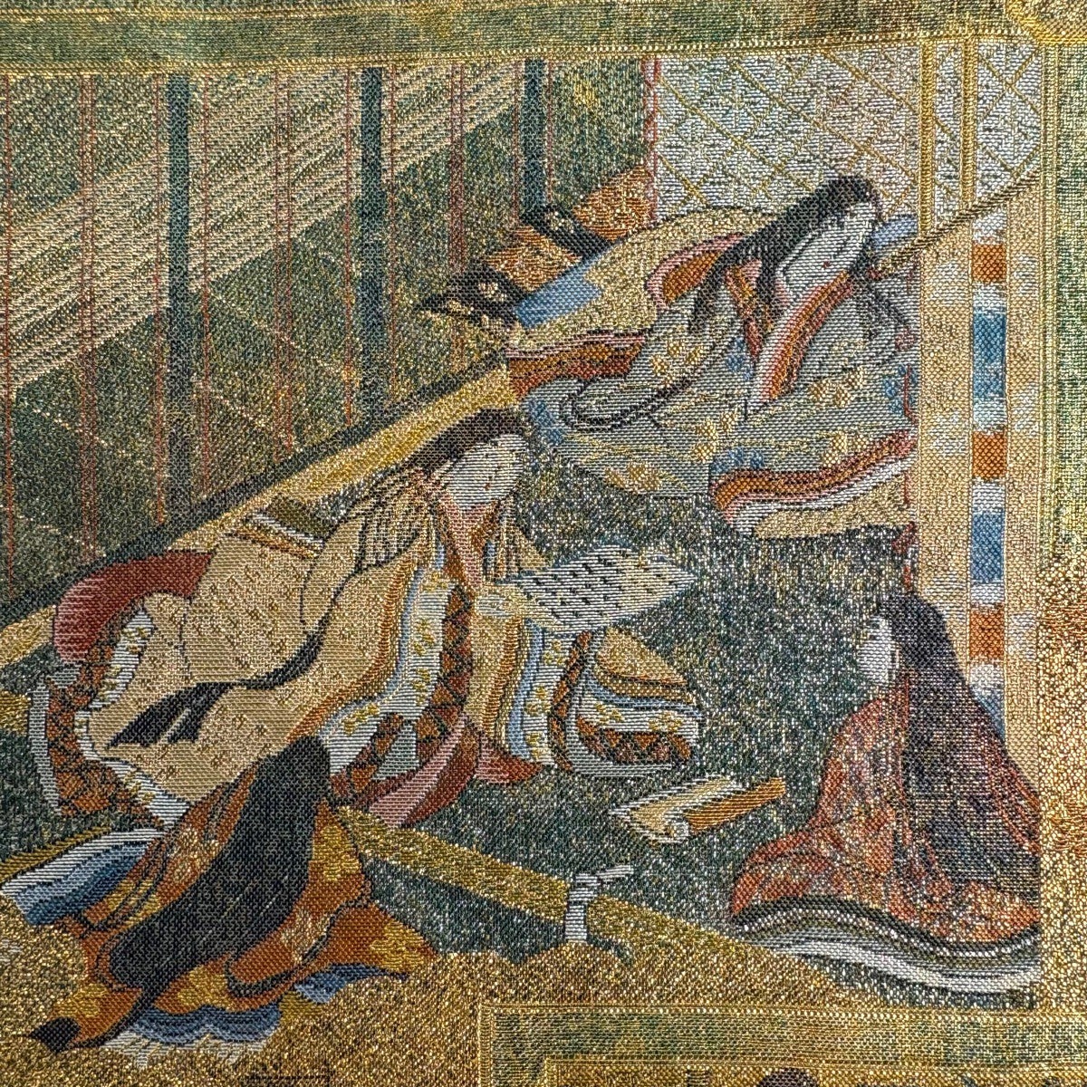 【美品】 袋帯 逸品 夏帯 雷紋 草花 金糸 金色 お太鼓柄 正絹