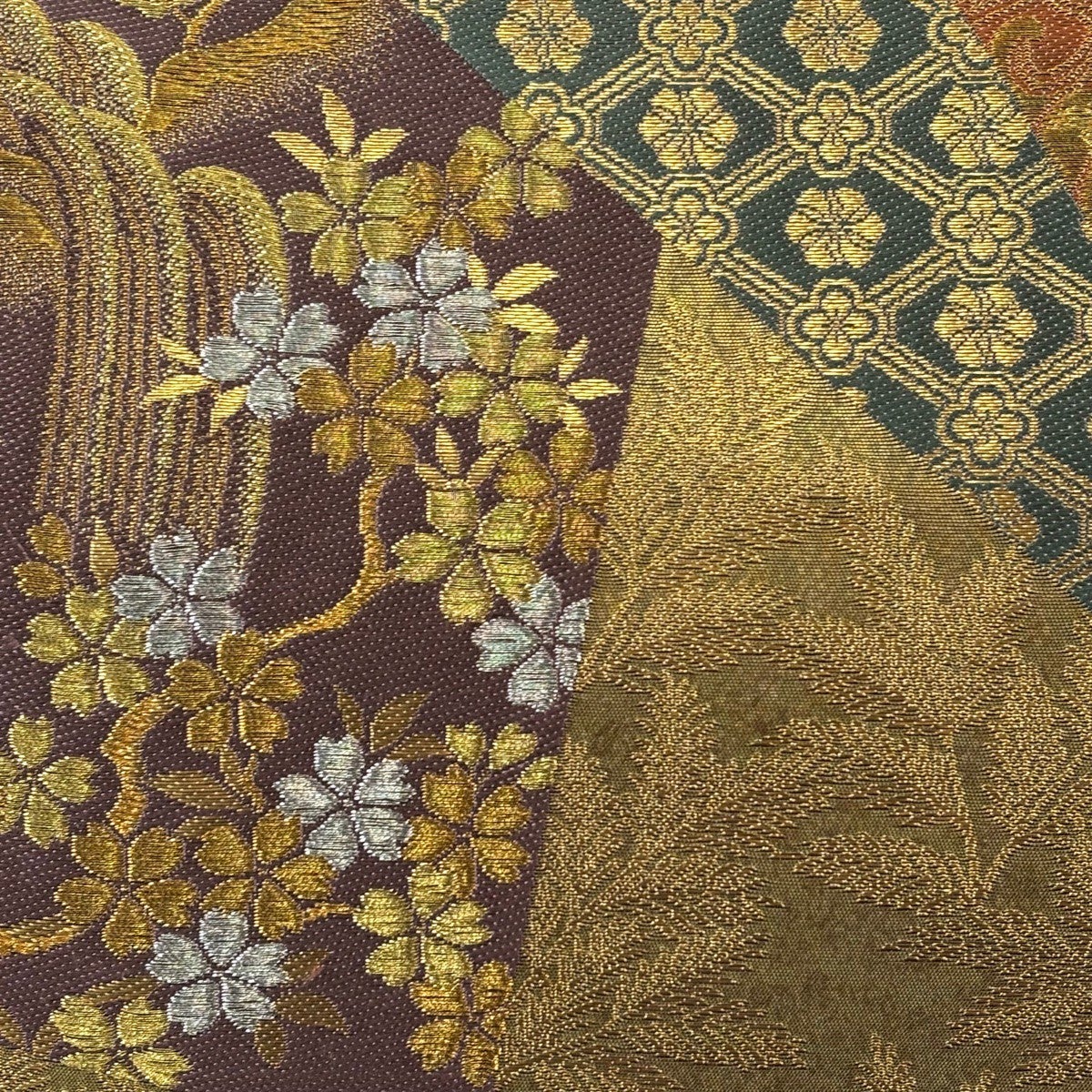 【美品】 袋帯 秀品 夢浪漫 枝垂れ桜 市松 金糸 唐織 えんじ色 六通 正絹