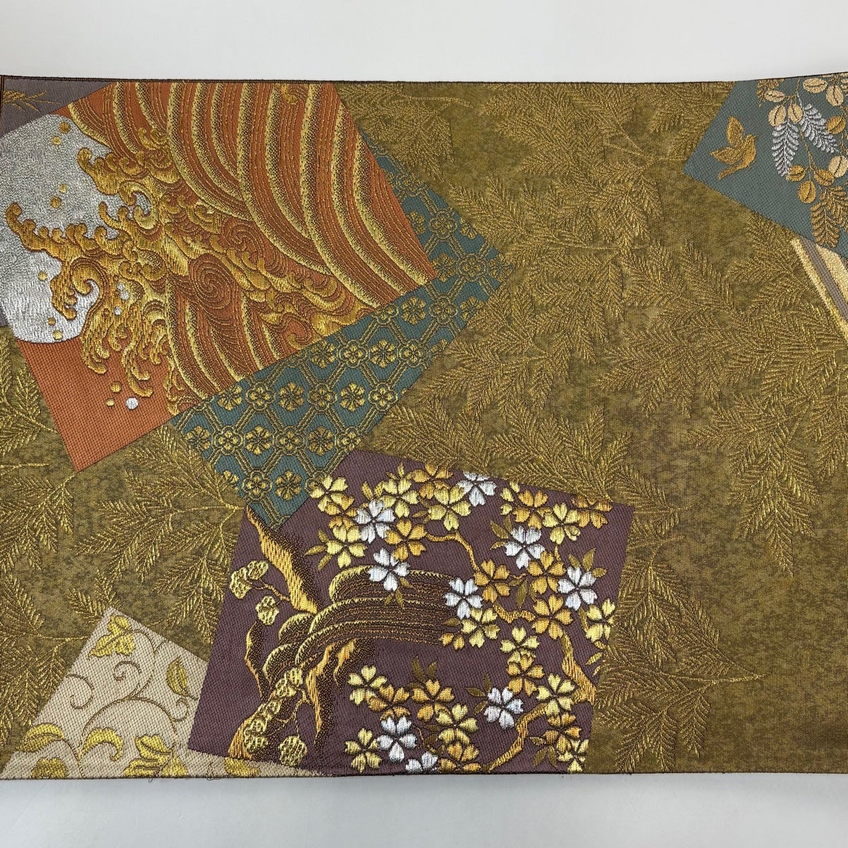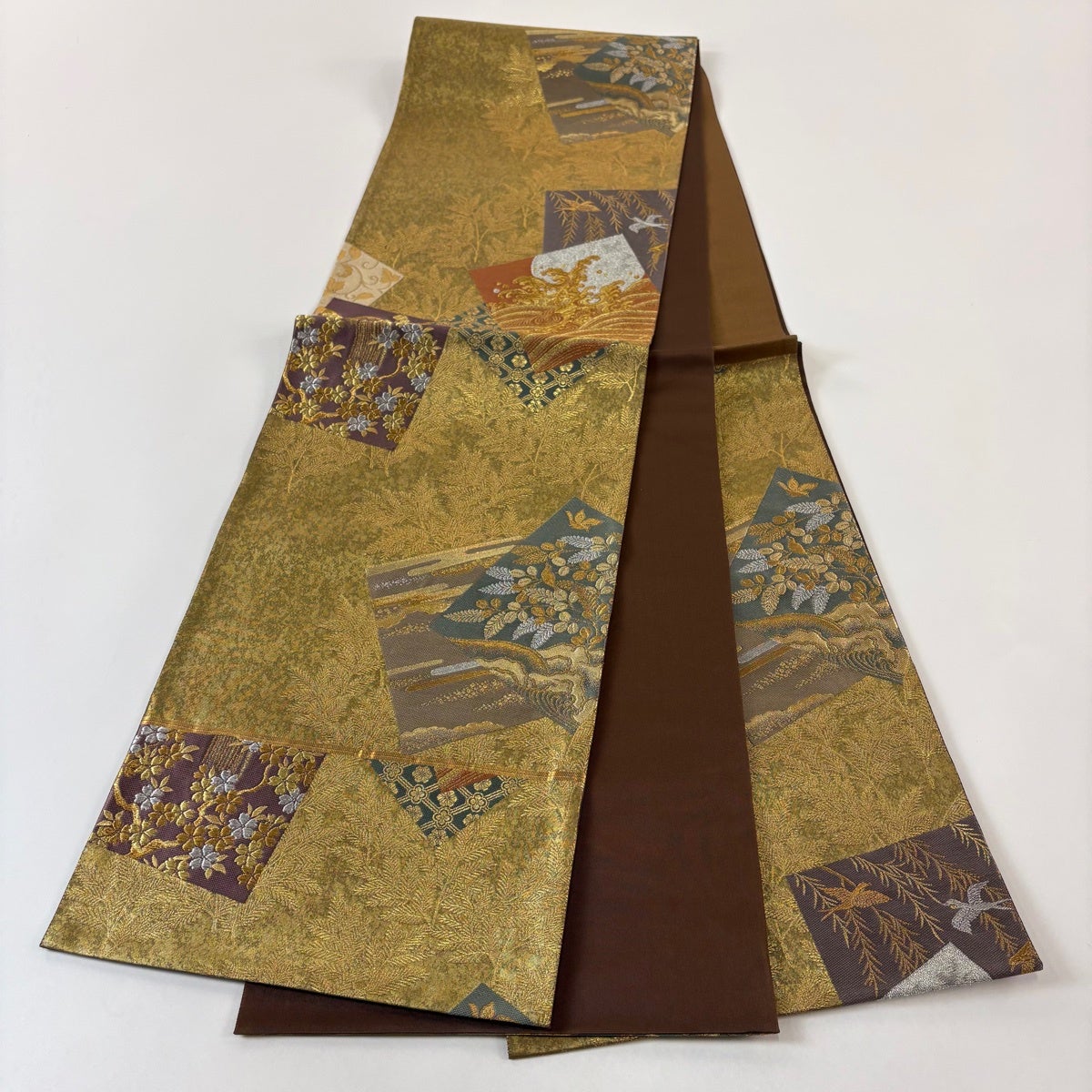 【美品】 袋帯 秀品 屏貼花鳥紋 古銘錦箔 金銀糸 金色 六通 正絹