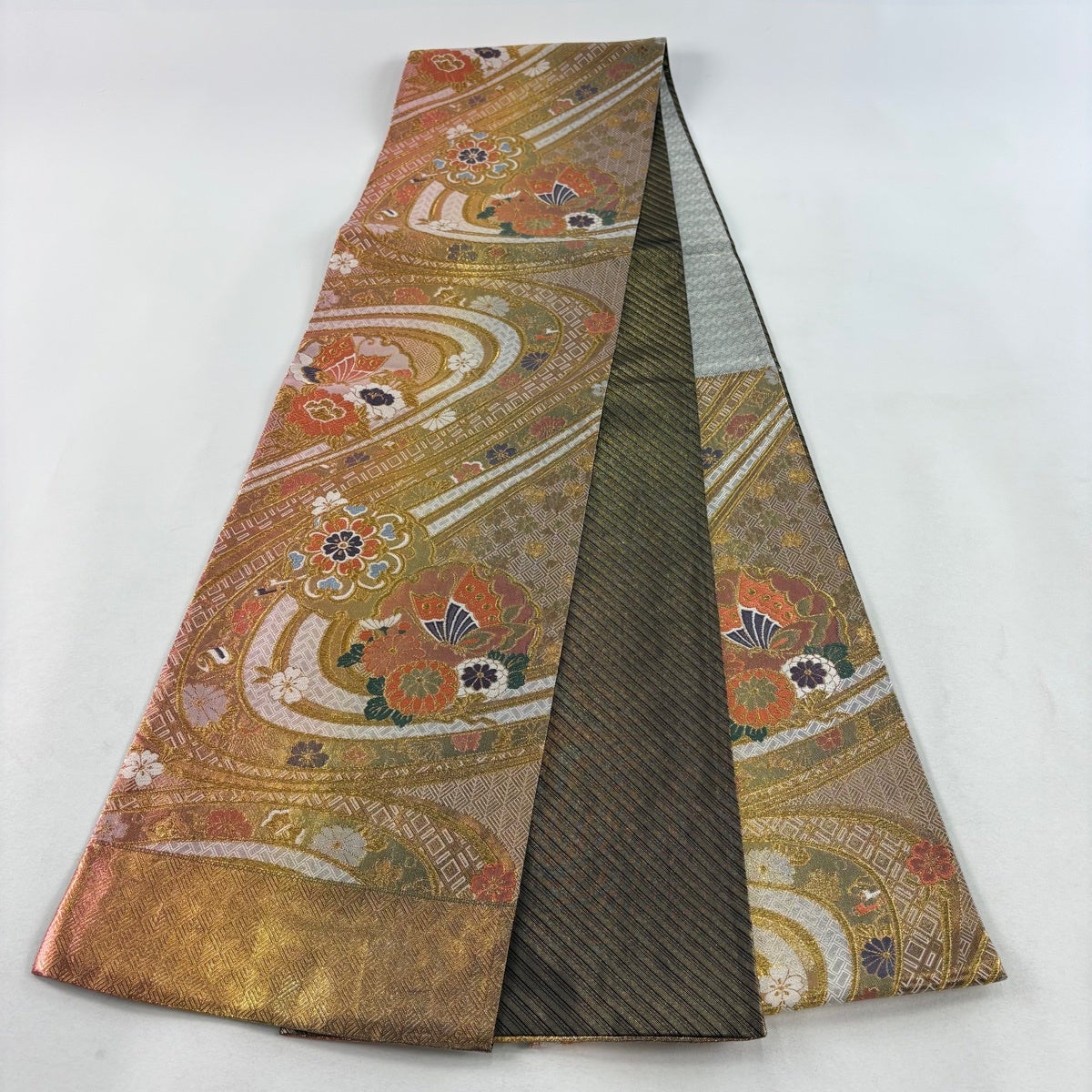 【美品】 袋帯 秀品 牡丹 金糸 箔 灰緑 お太鼓柄 正絹