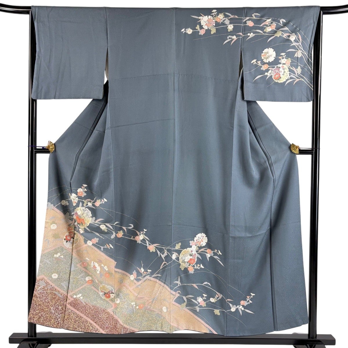 訪問着 身丈163cm 裄丈66cm M 袷 秋草 鴛鴦 刺繍 金彩 灰色 正絹 秀品
