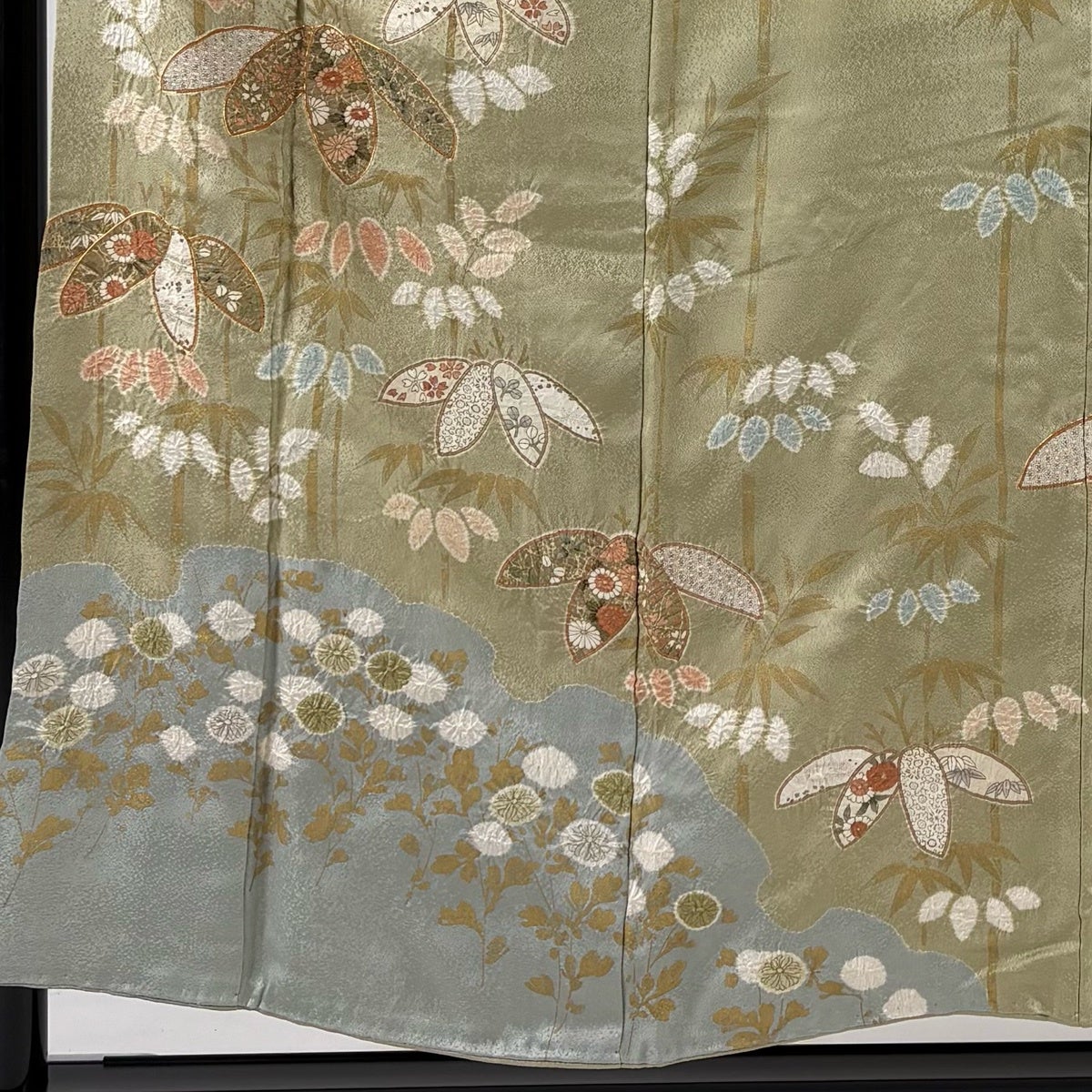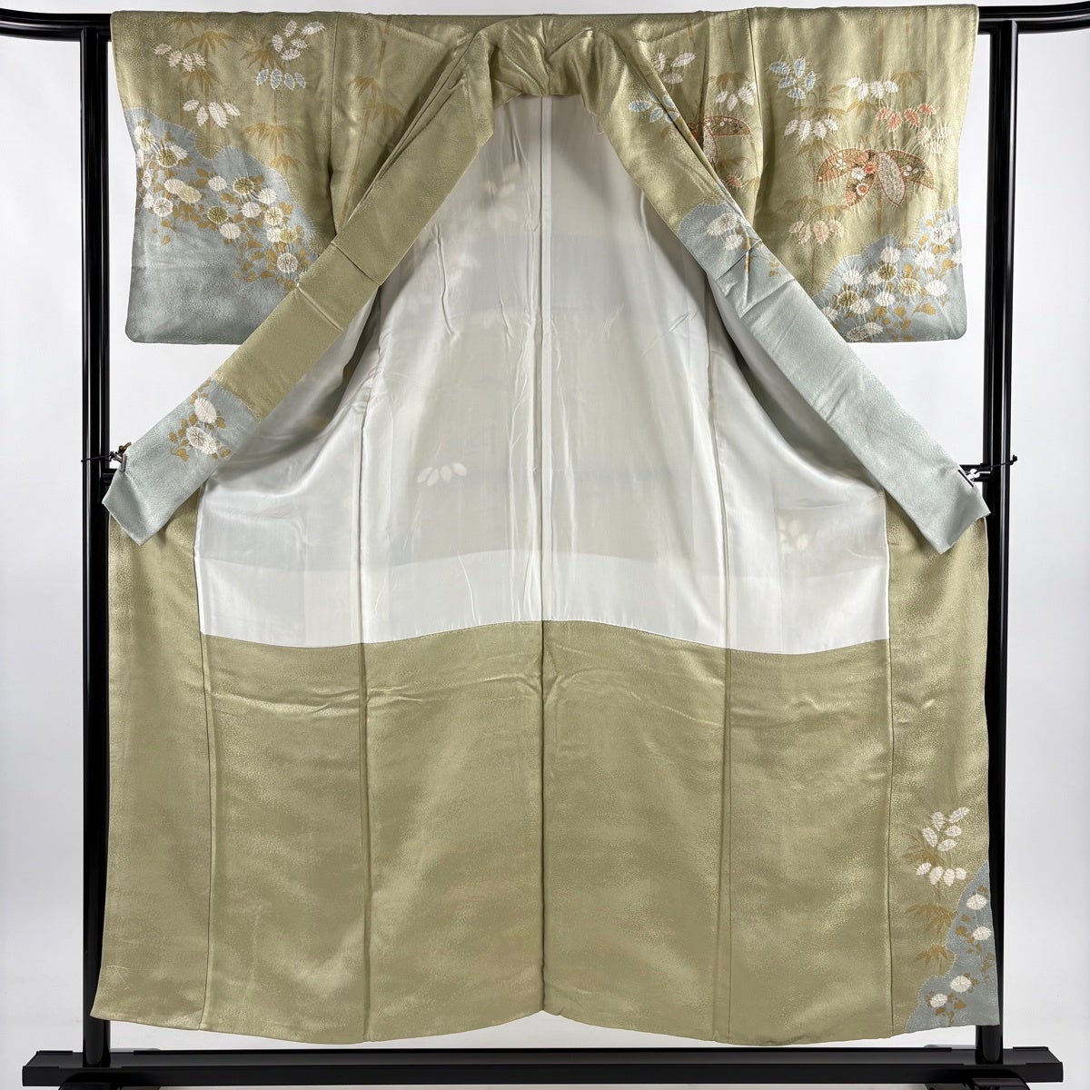 訪問着 身丈161.5cm 裄丈63cm S 袷 菊 松梅 金糸 金彩 鶯色 正絹 秀品