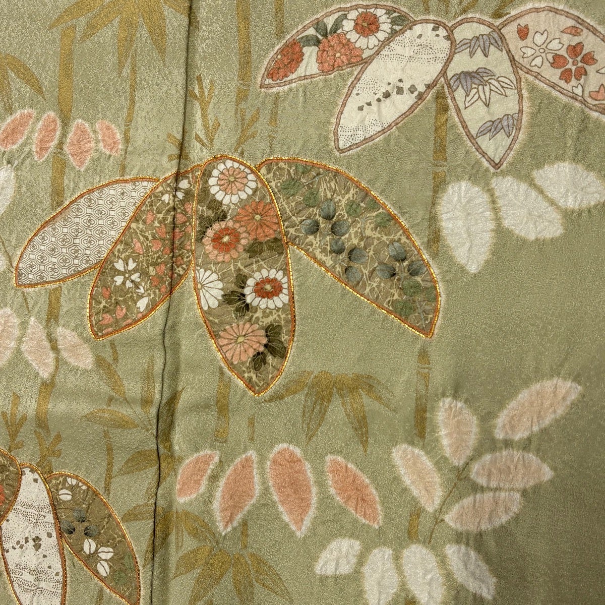 訪問着 身丈170cm 裄丈68cm L 袷 童 草花 刺繍 薄緑 正絹 名品 一つ紋