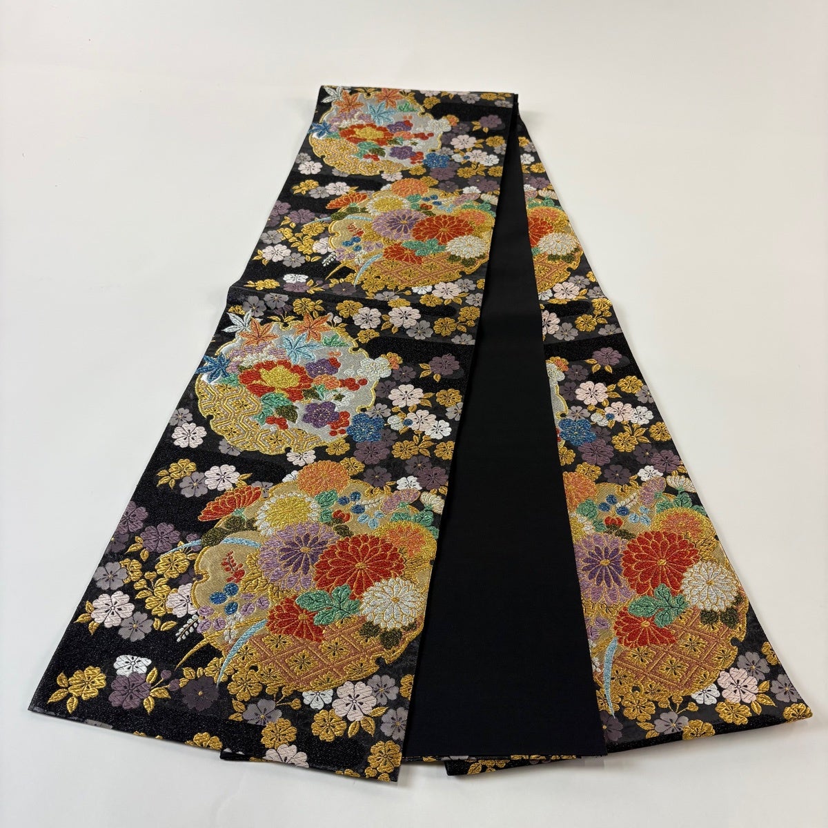 【美品】 袋帯 秀品 振袖向き 桜 桜の花びら 金糸 箔 黒 六通 正絹