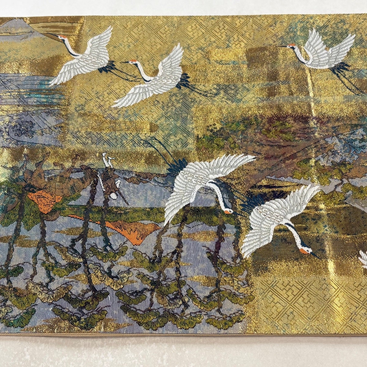 【美品】 袋帯 秀品 鶴 松竹梅 金糸 箔 灰緑 六通 正絹