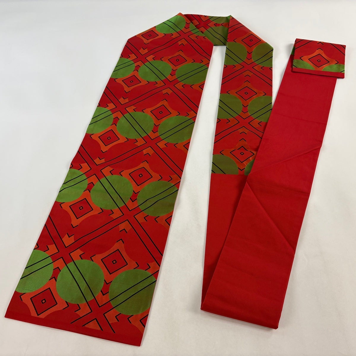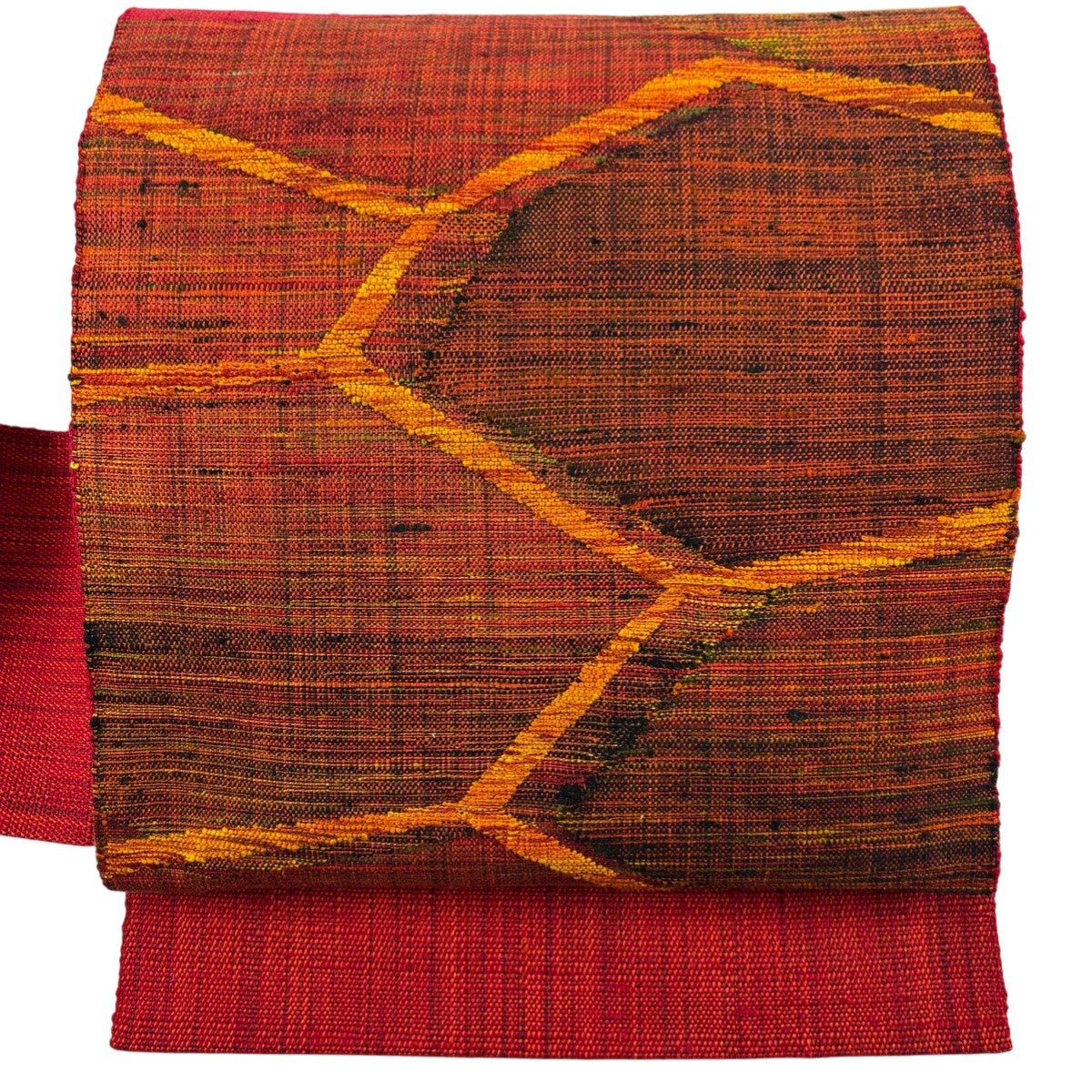 【美品】 名古屋帯 優品 入子菱 幾何学模様 赤 正絹