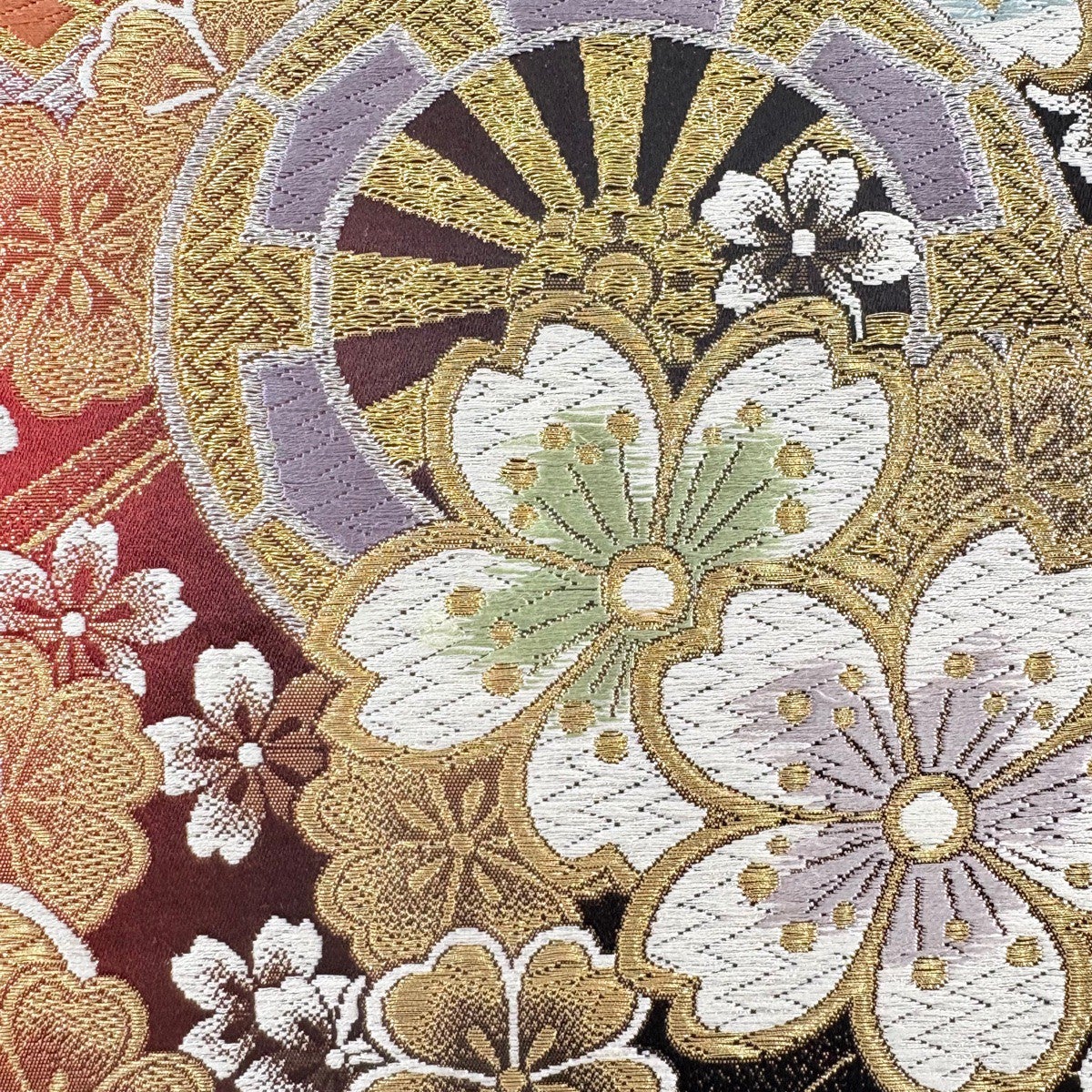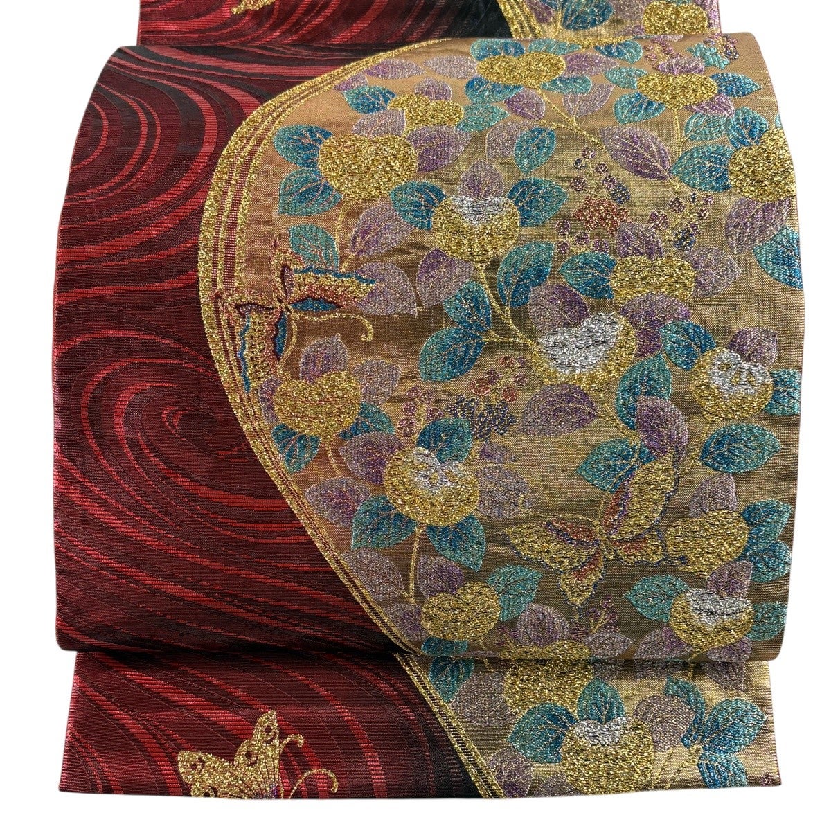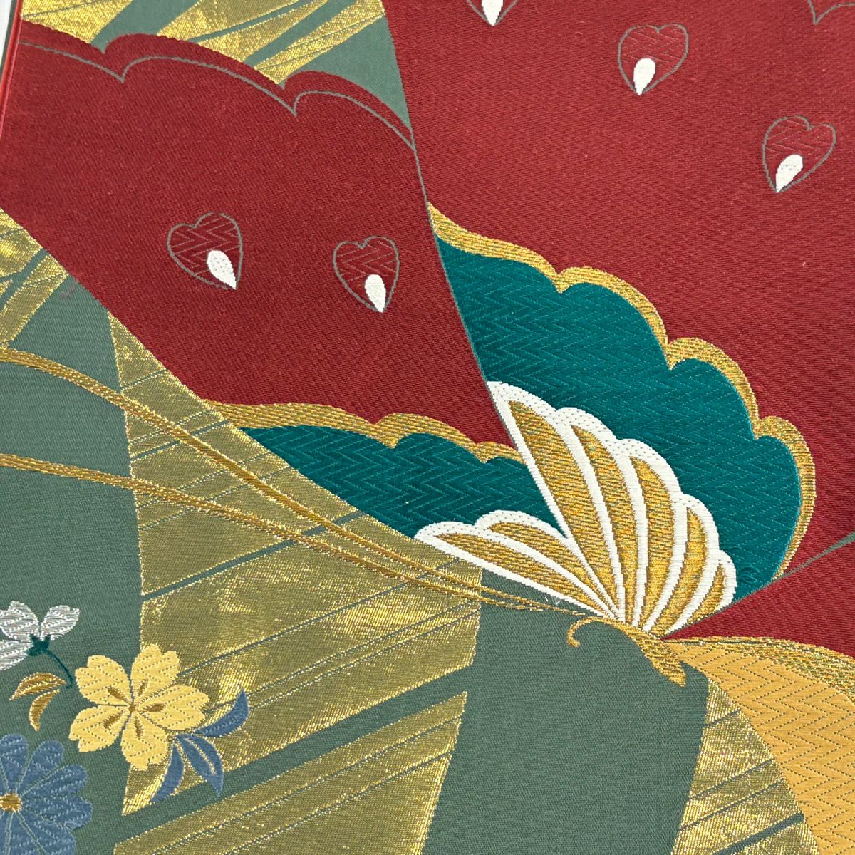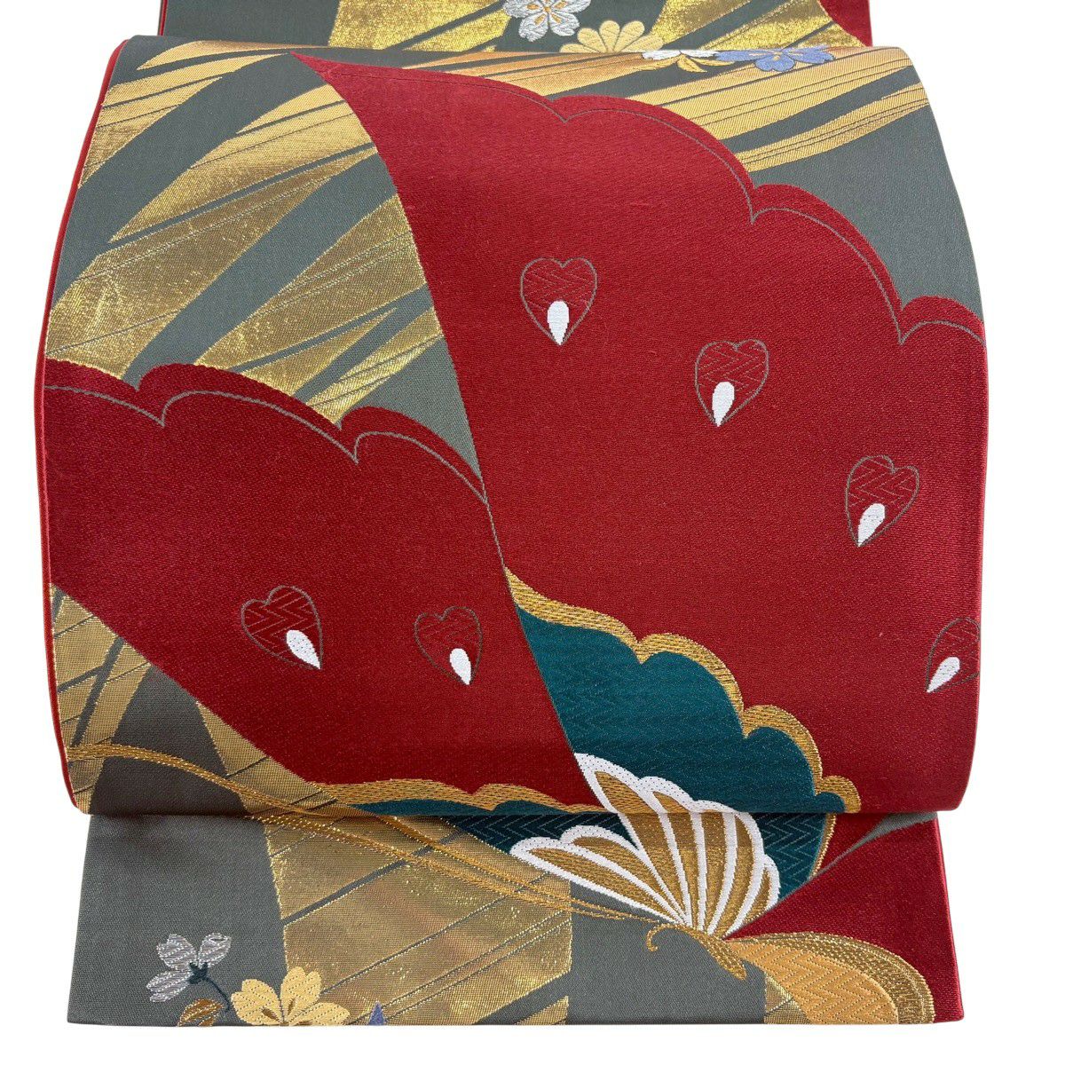 30%OFF 名古屋帯 秀品 団扇 草花 箔 唐織 赤 正絹 K30