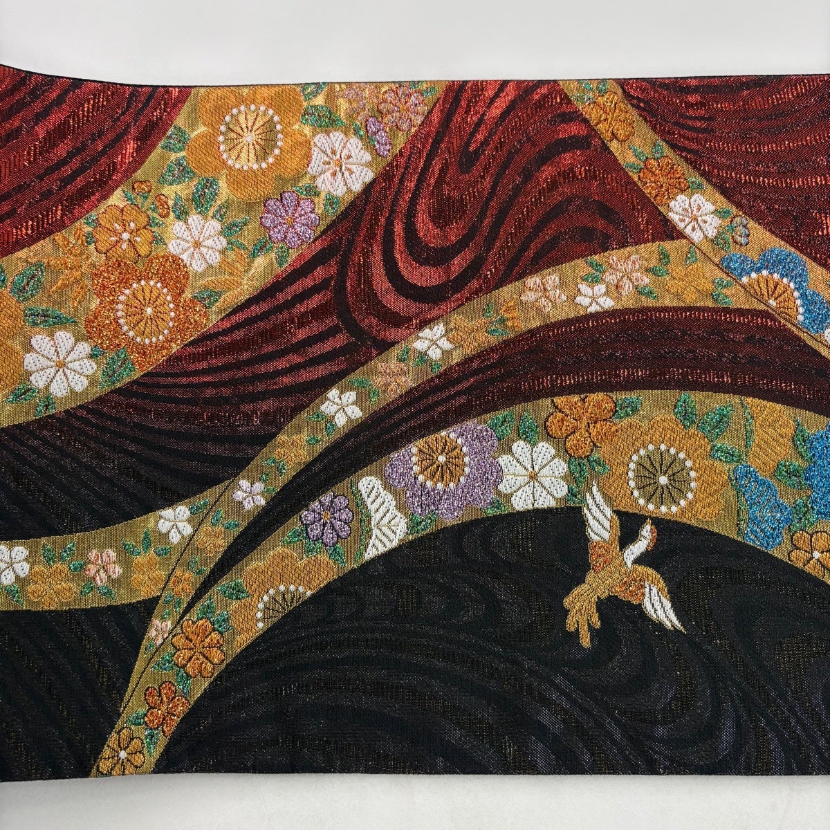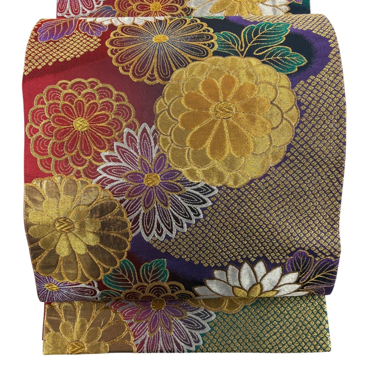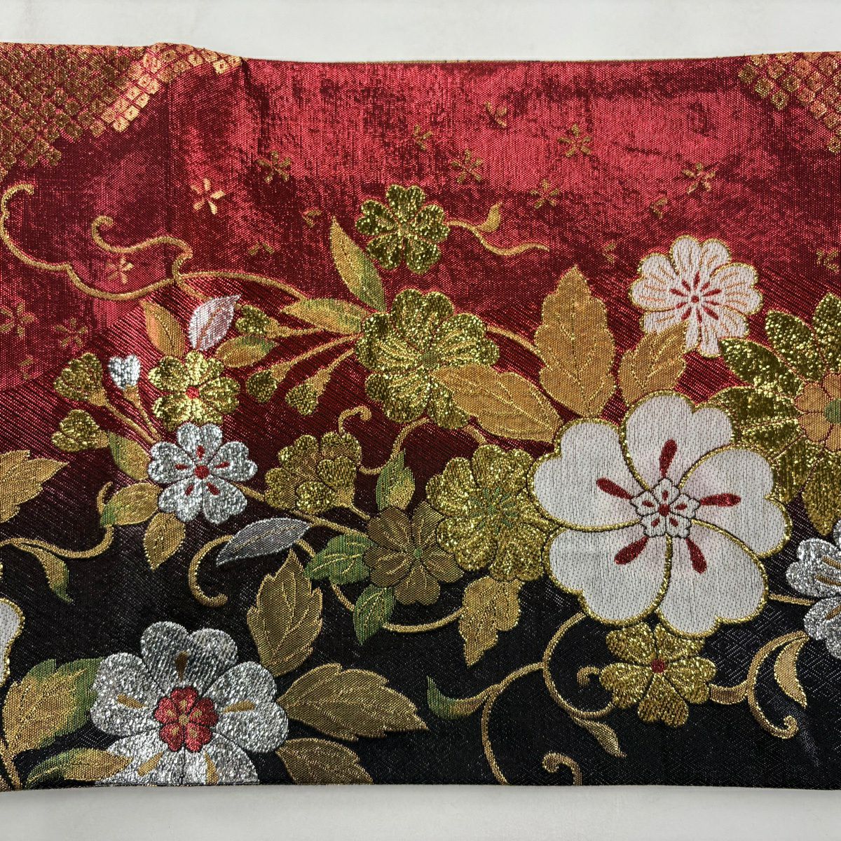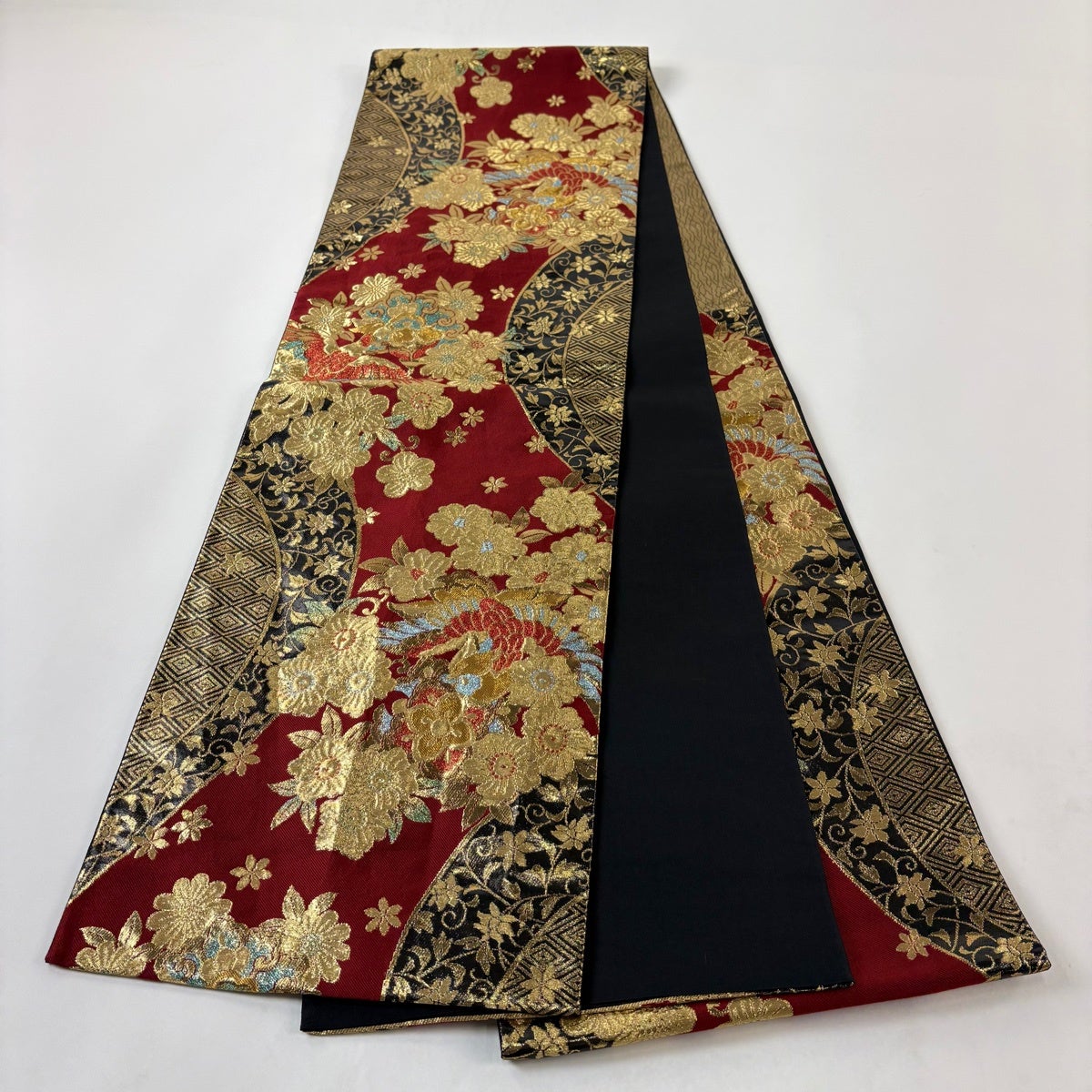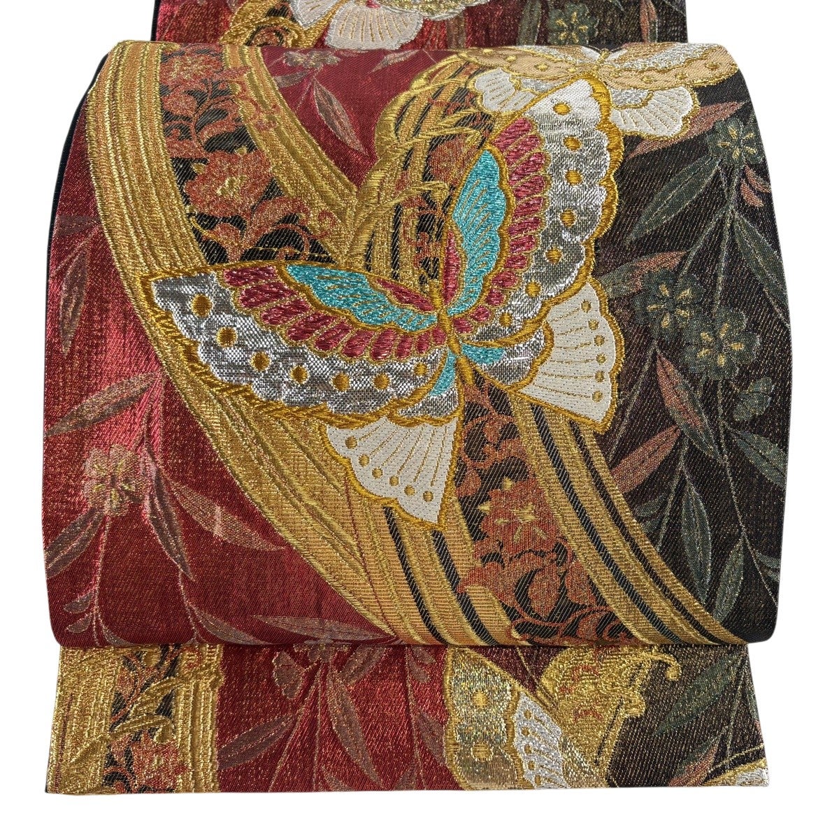 30%OFF 名古屋帯 秀品 団扇 草花 箔 唐織 赤 正絹 K30