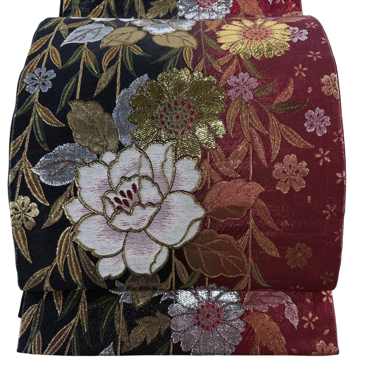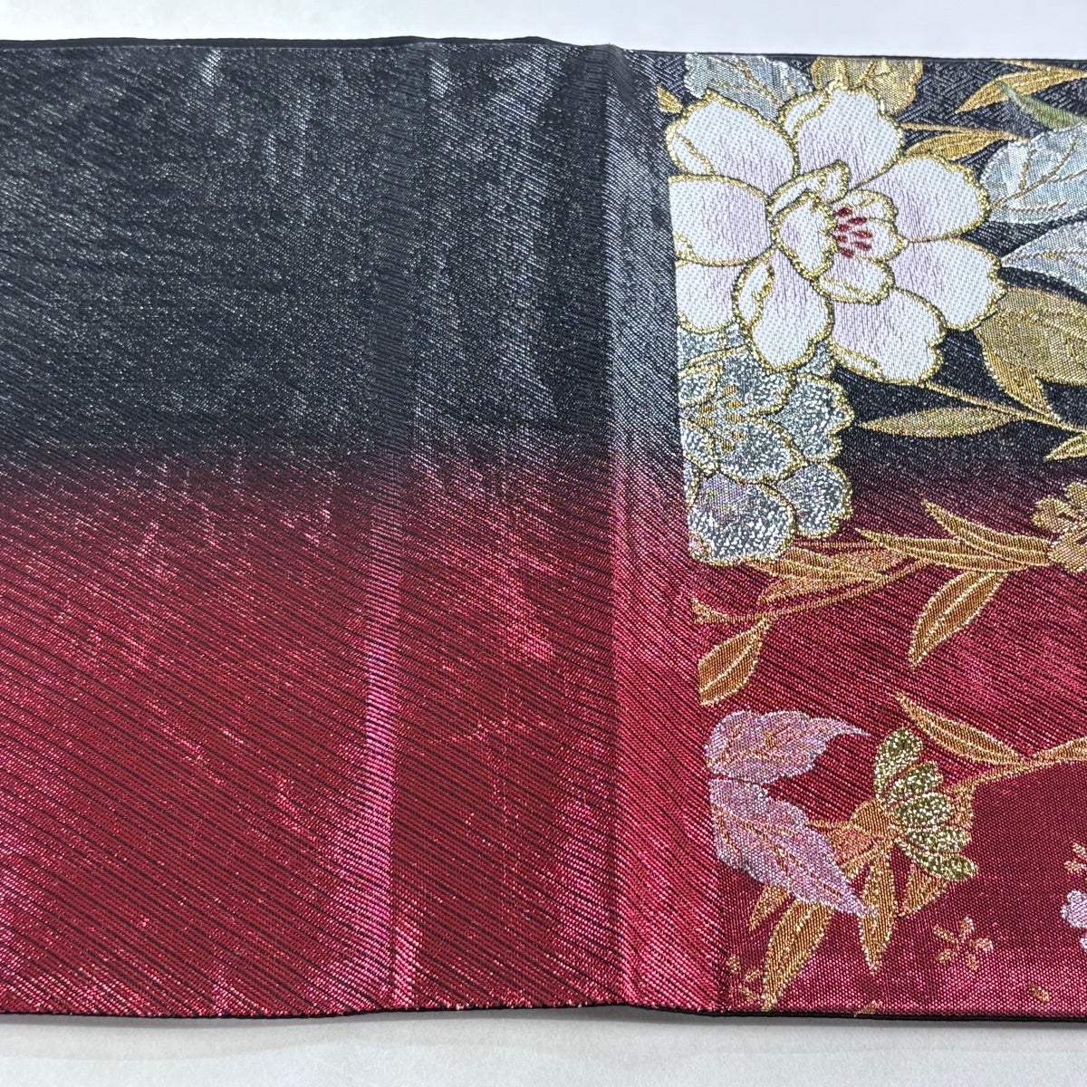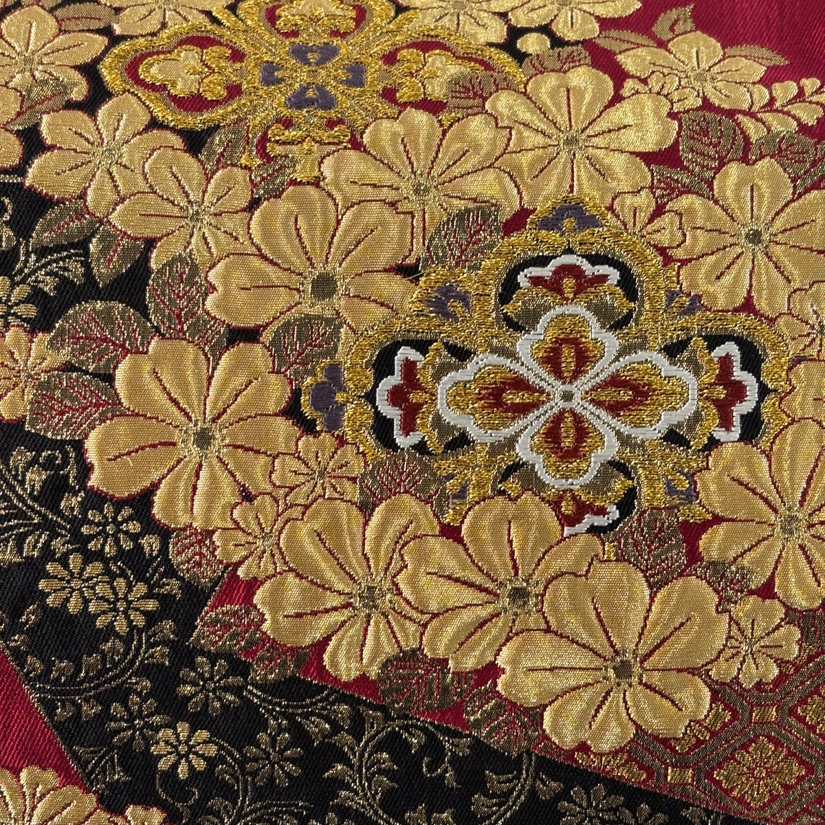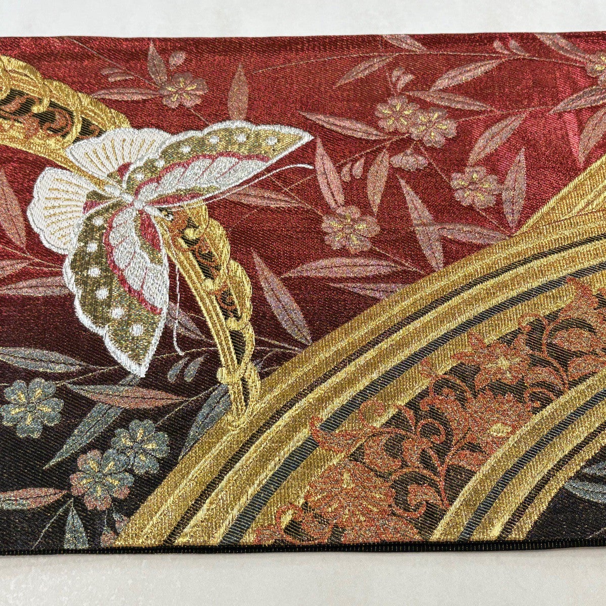 30%OFF 名古屋帯 秀品 団扇 草花 箔 唐織 赤 正絹 K30