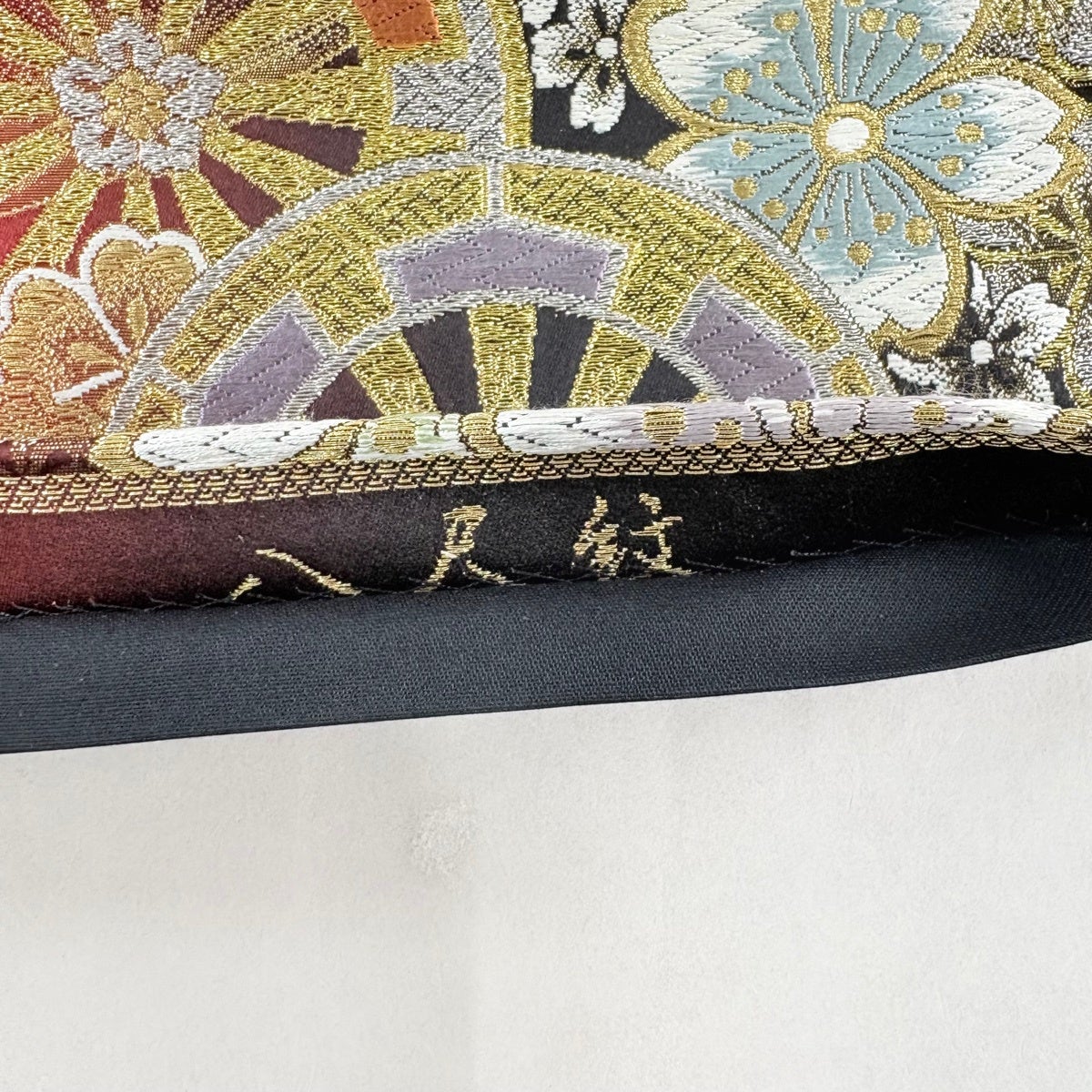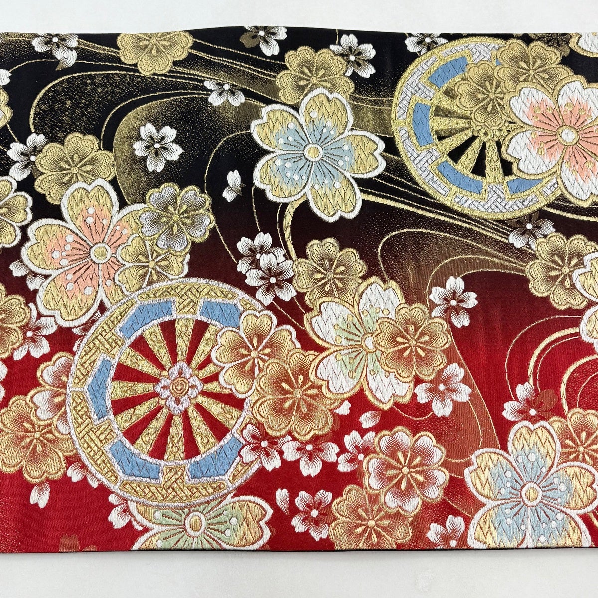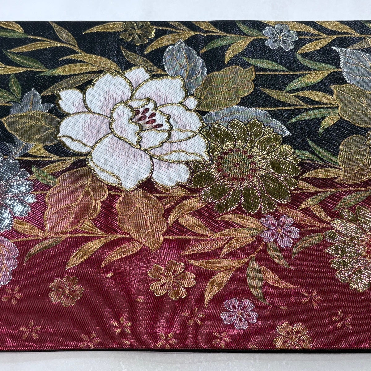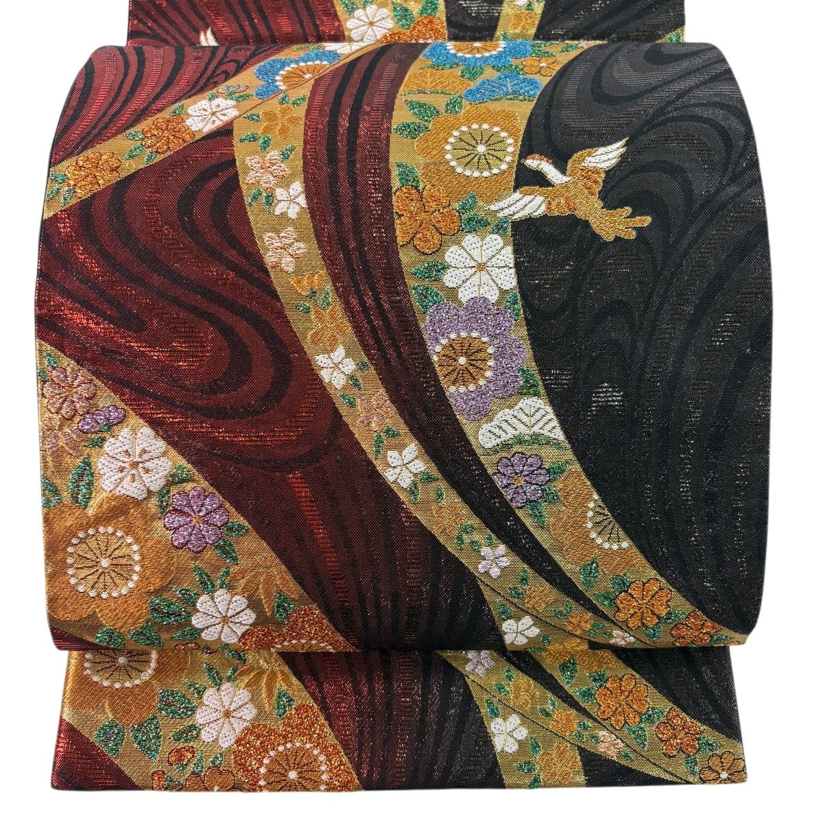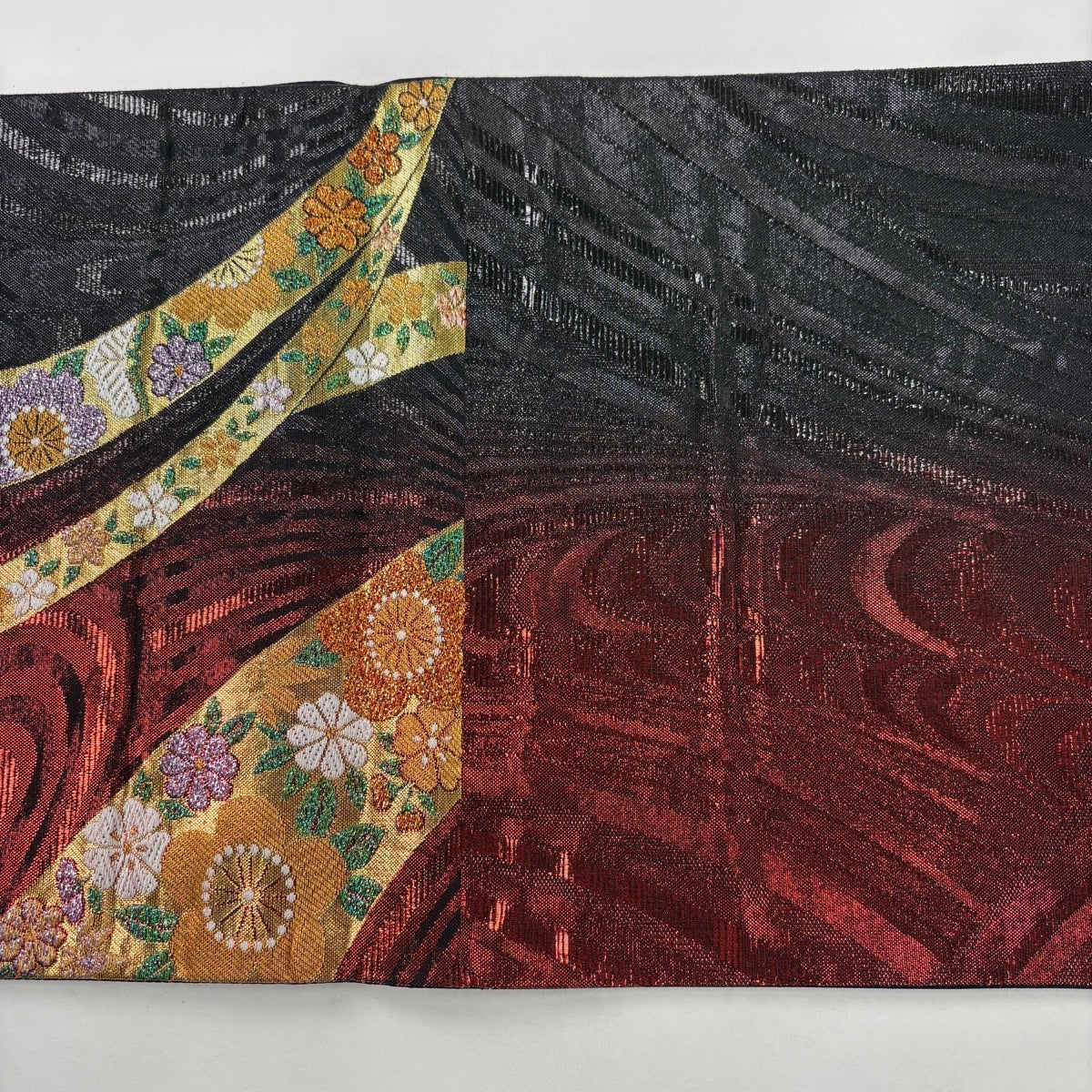 30%OFF 名古屋帯 秀品 団扇 草花 箔 唐織 赤 正絹 K30