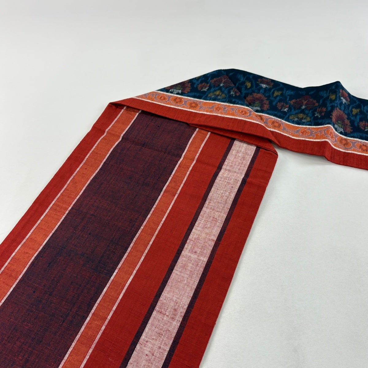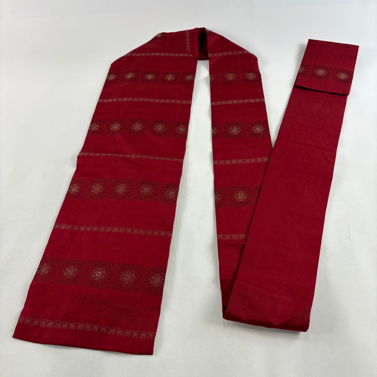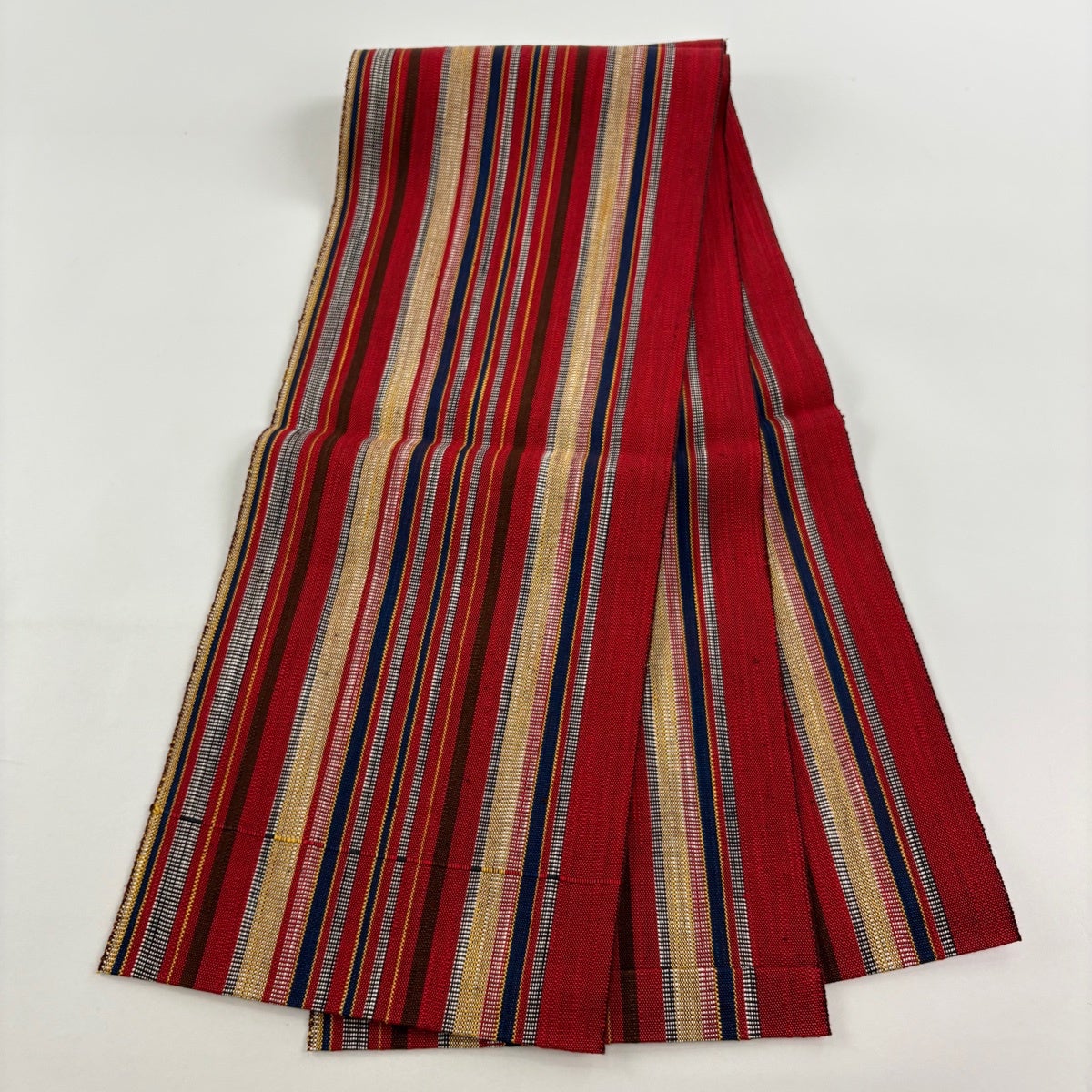 【美品】 名古屋帯 優品 紬地 関西仕立て 草花 縞 赤 正絹