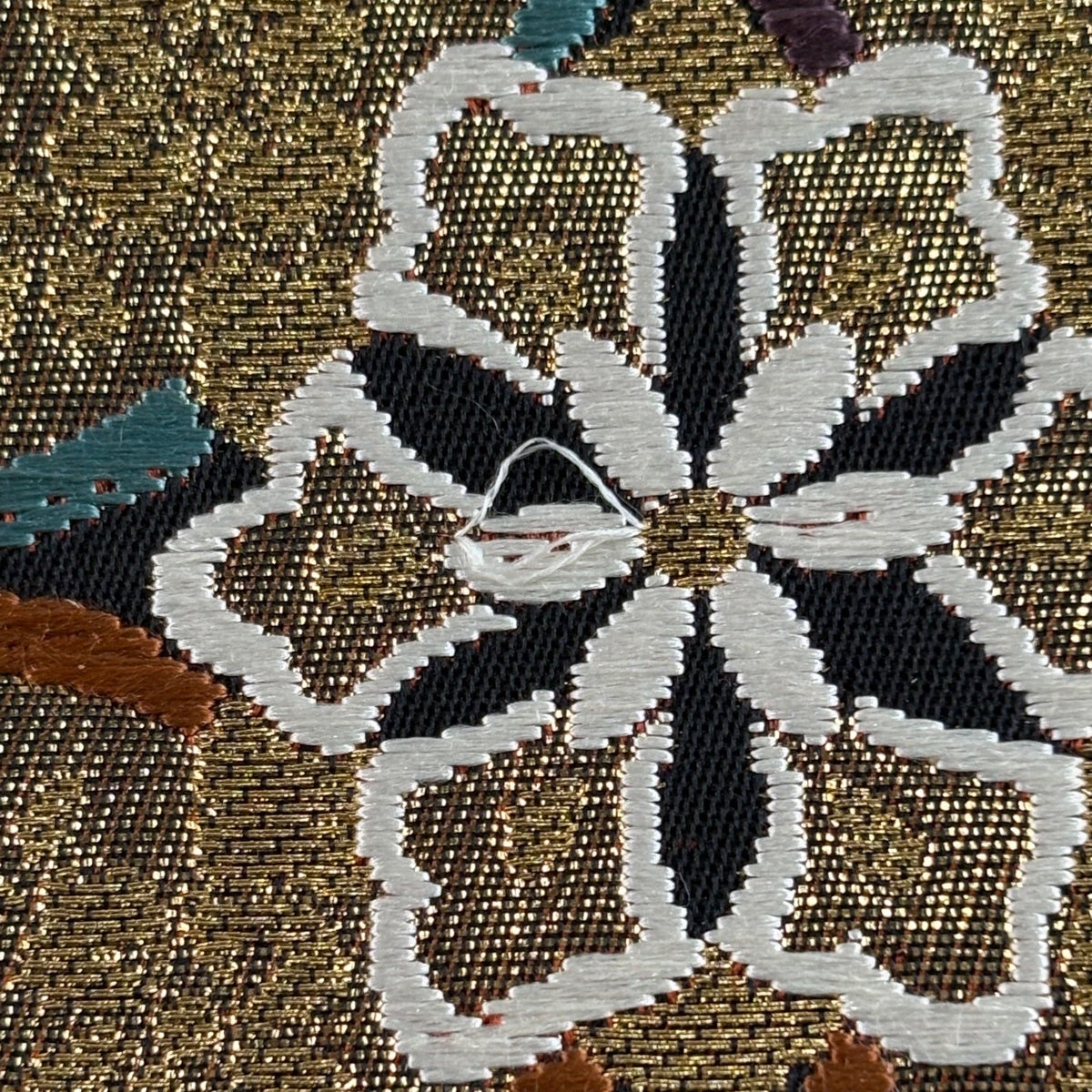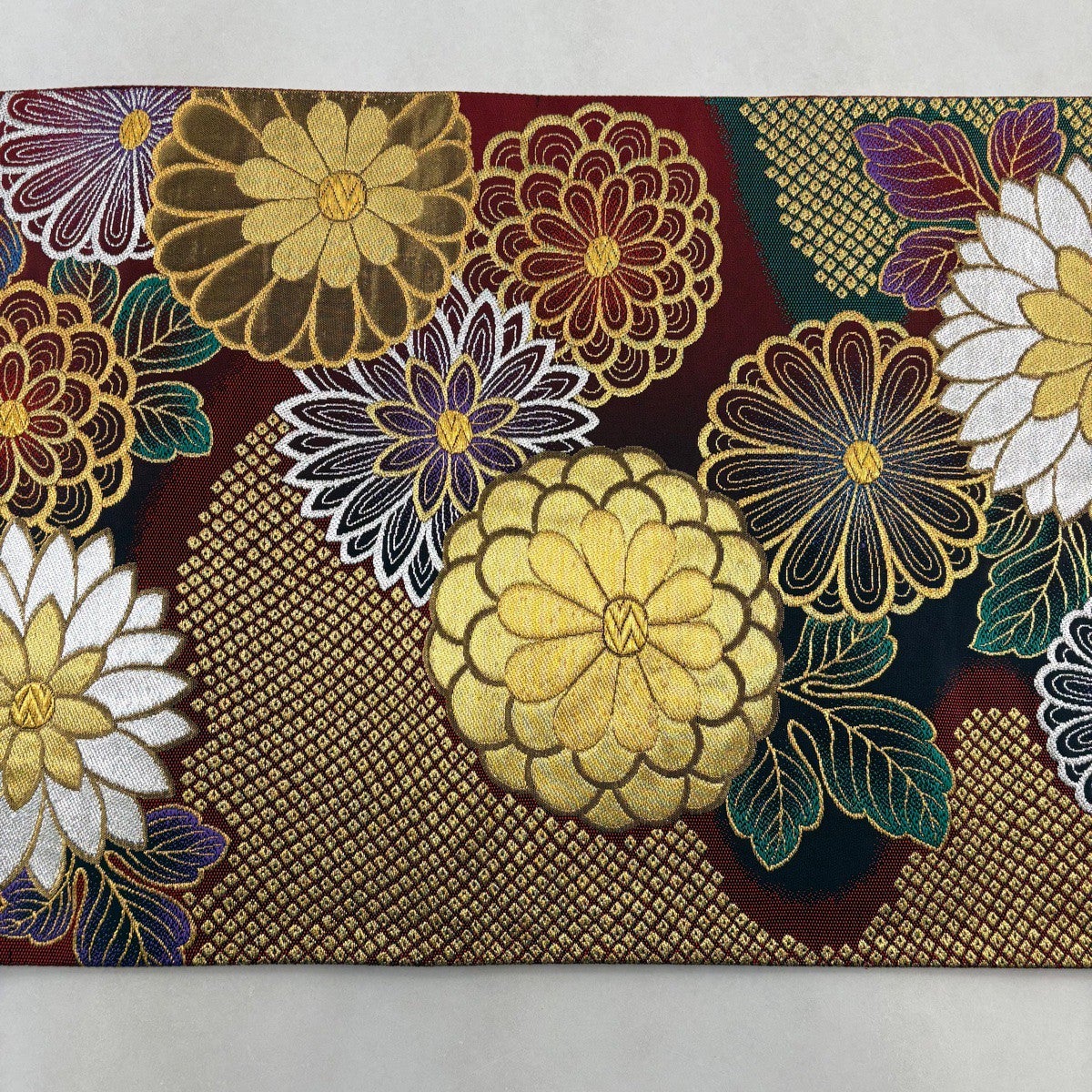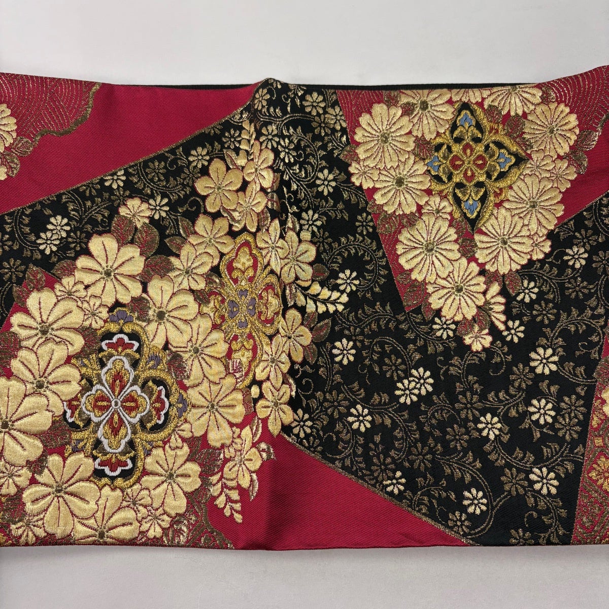 【美品】 袋帯 秀品 振袖向き 菊 霞 箔 金糸 赤 六通 正絹