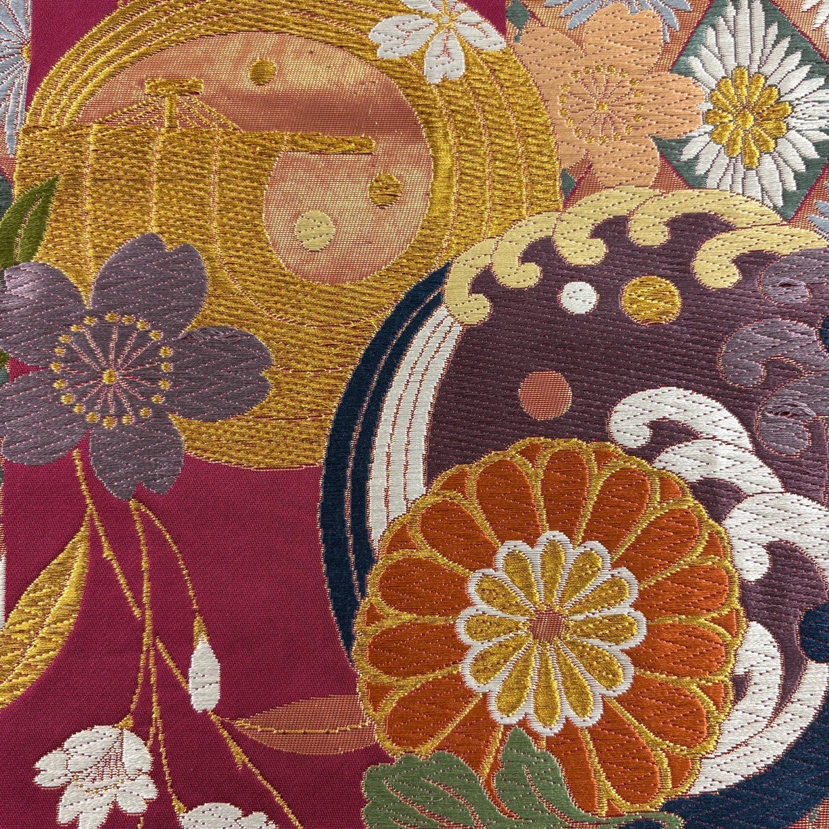 袋帯 秀品 花丸文 桜 唐織 金糸 赤紫 六通 正絹