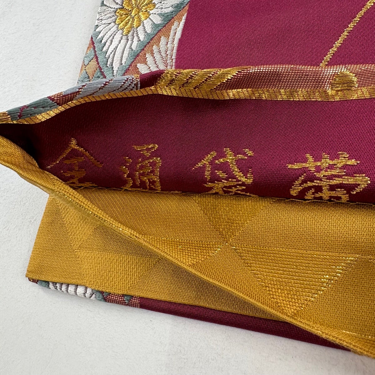袋帯 名品 霞 幾何学模様 金糸 赤紫 お太鼓柄 正絹