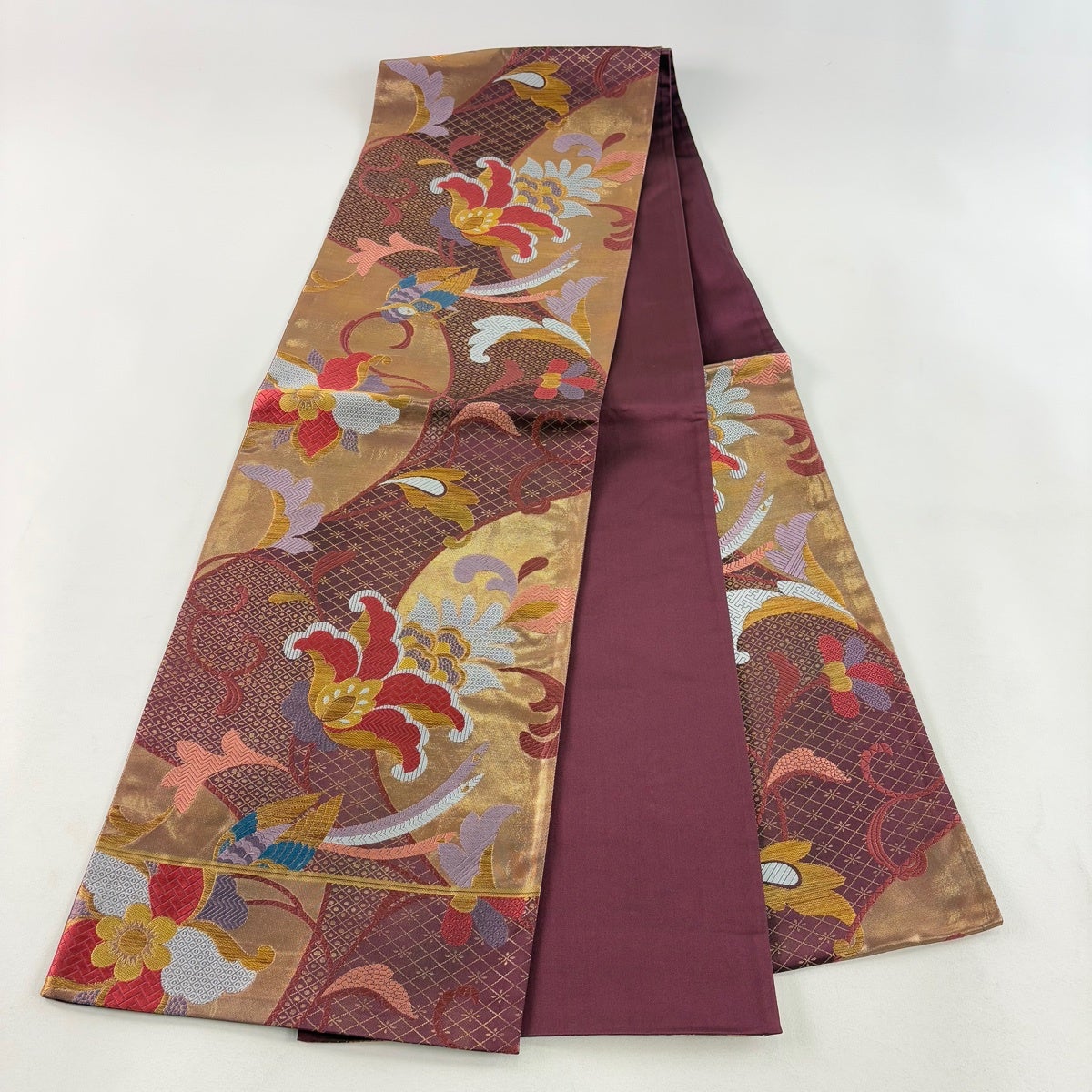 【美品】 袋帯 秀品 流水 金通し 箔 赤紫 六通 正絹