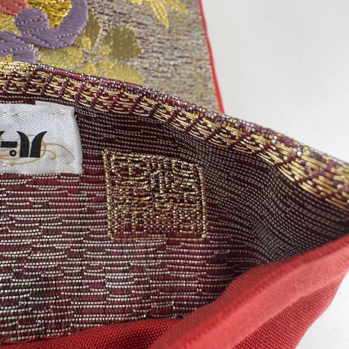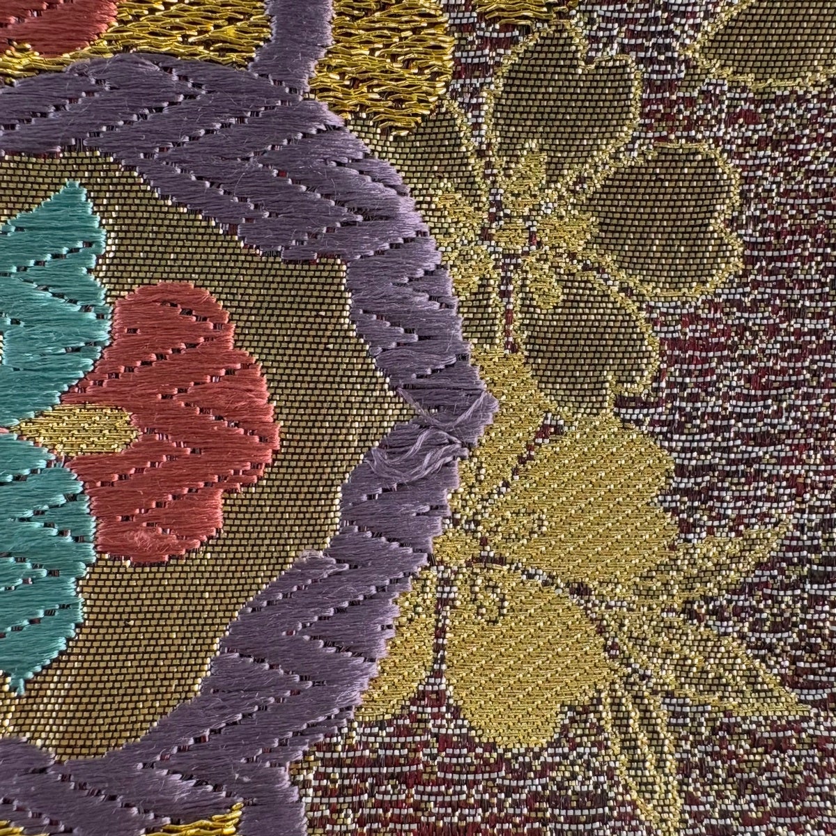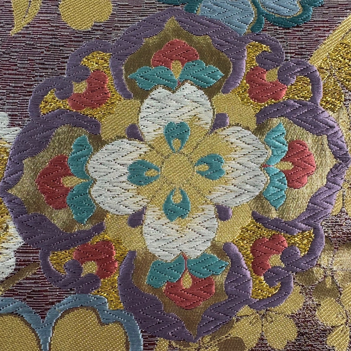 【美品】 袋帯 秀品 草花 幾何学模様 金銀糸 赤紫 お太鼓柄 正絹