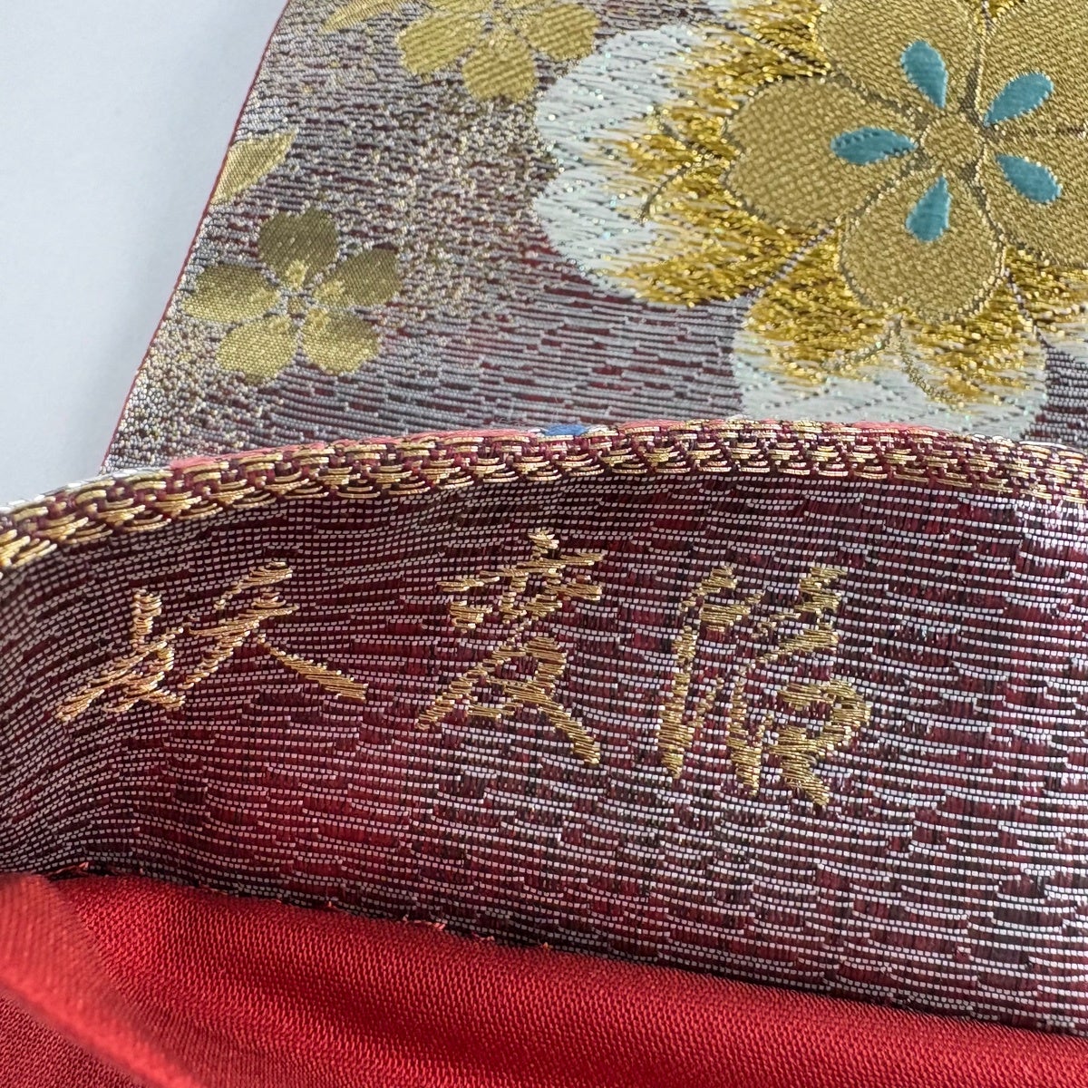 【美品】 袋帯 秀品 落款あり 草花 箔 赤紫 お太鼓柄 正絹