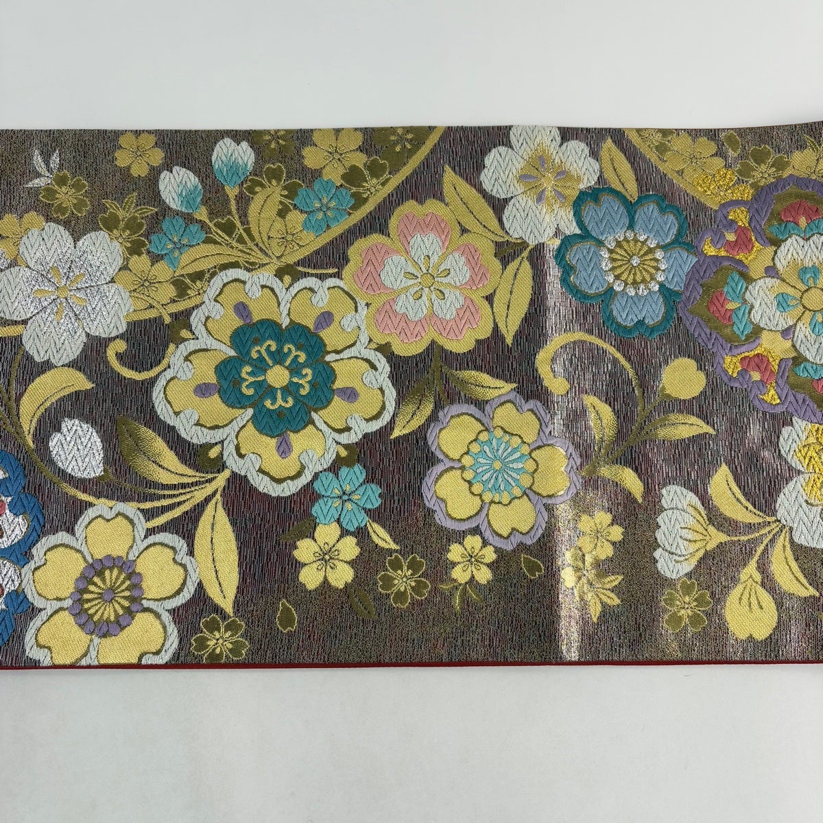 【美品】 袋帯 秀品 やまと 草花 格子 金糸 箔 赤紫 六通 正絹