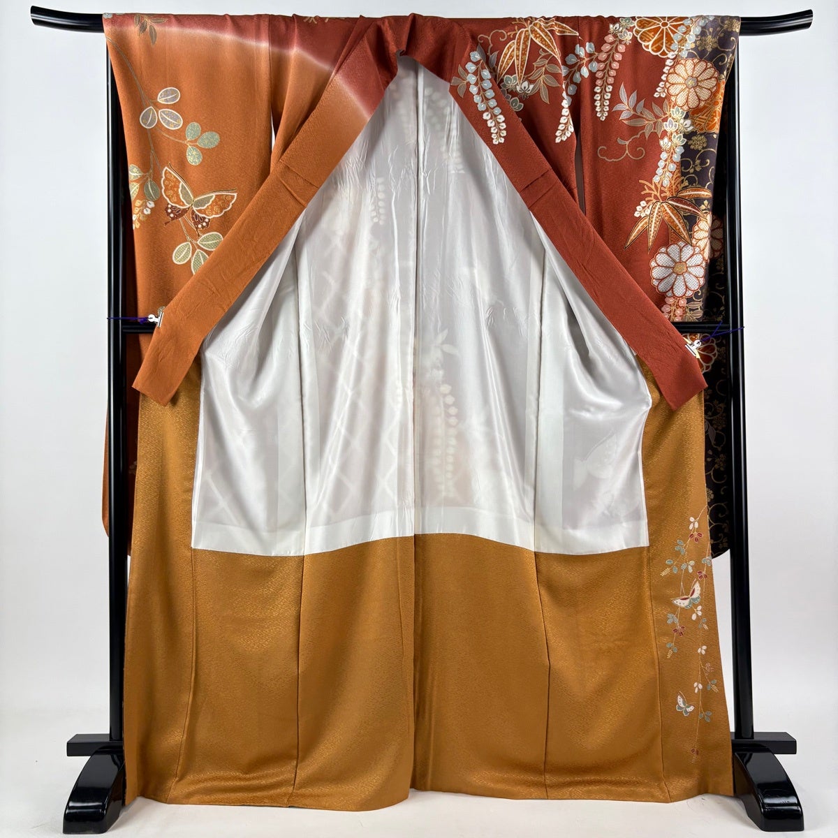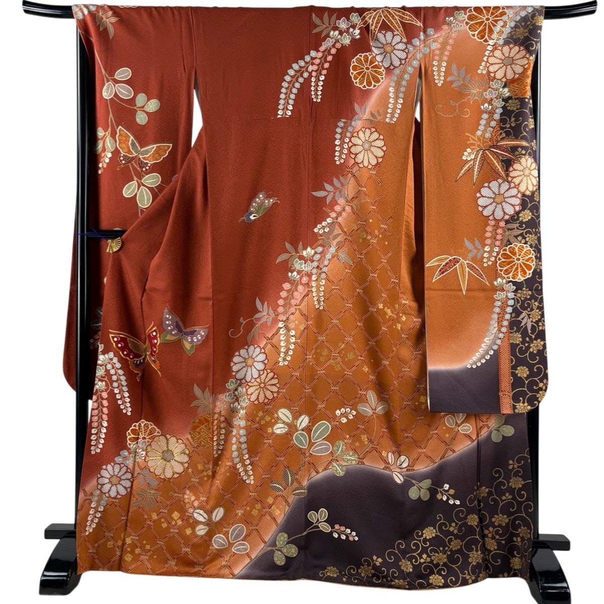 他の画像を見る 30%OFF 【美品】 振袖 身丈168.5cm 裄丈69.5cm L 袷 山本寛斎 落款あり 蝶 菊 金糸 金彩 赤茶 正絹 秀品 K30 当店通常価格 ¥ 11,800 ¥ 8,260 税込