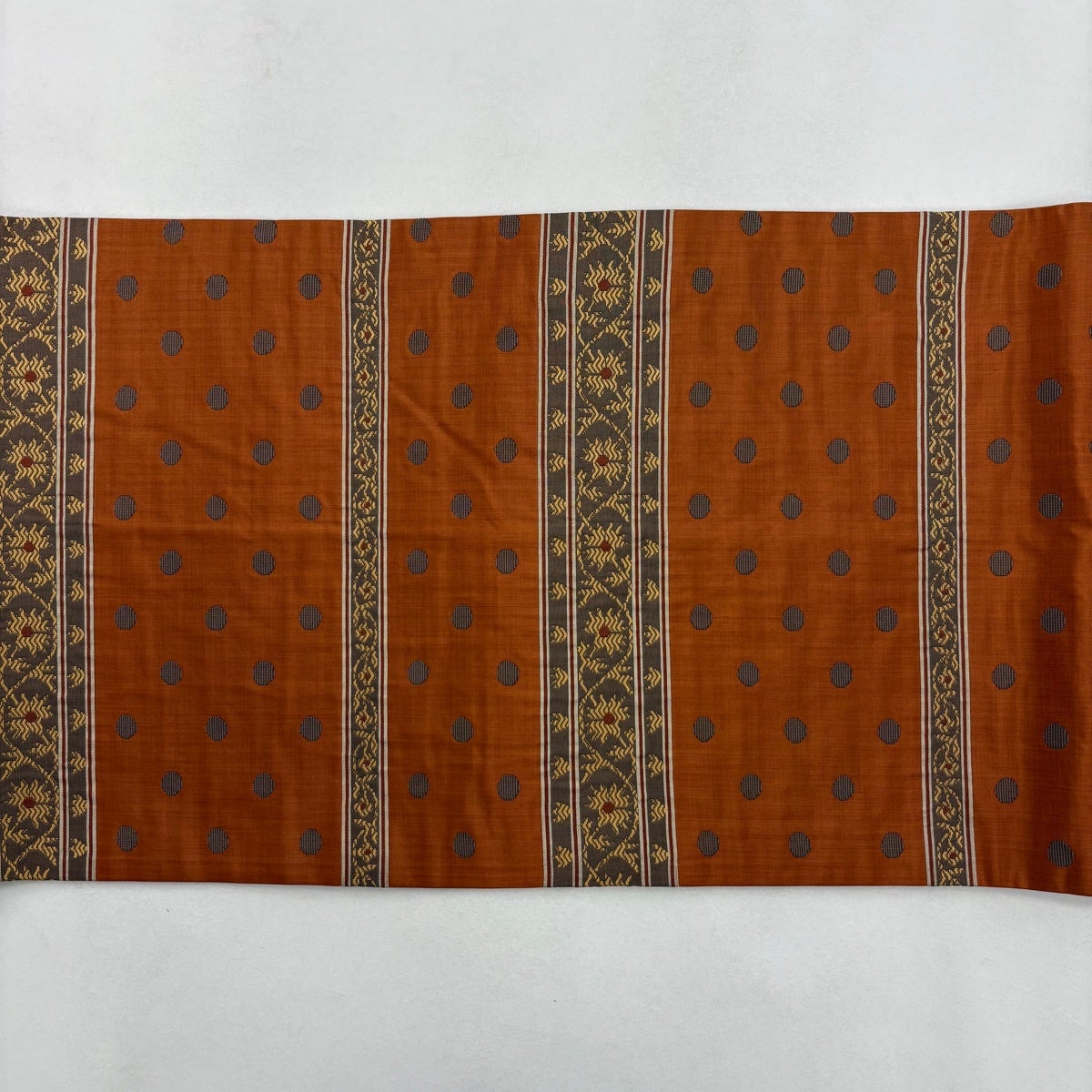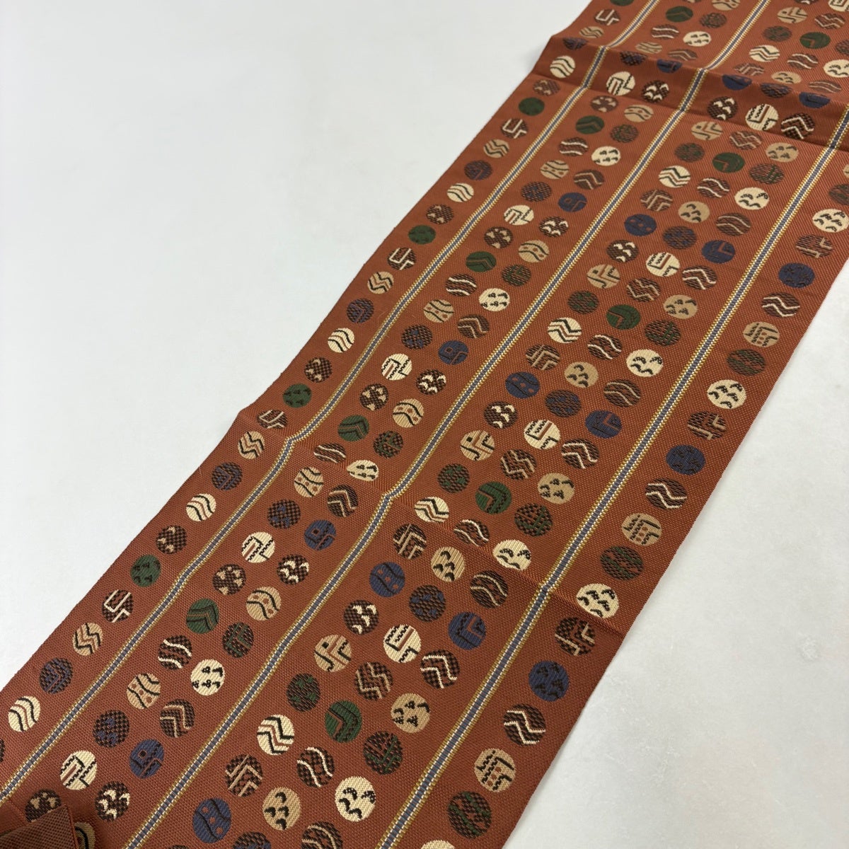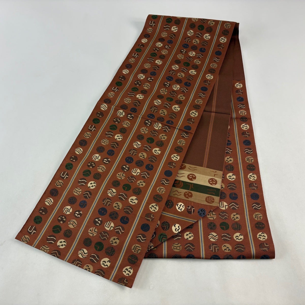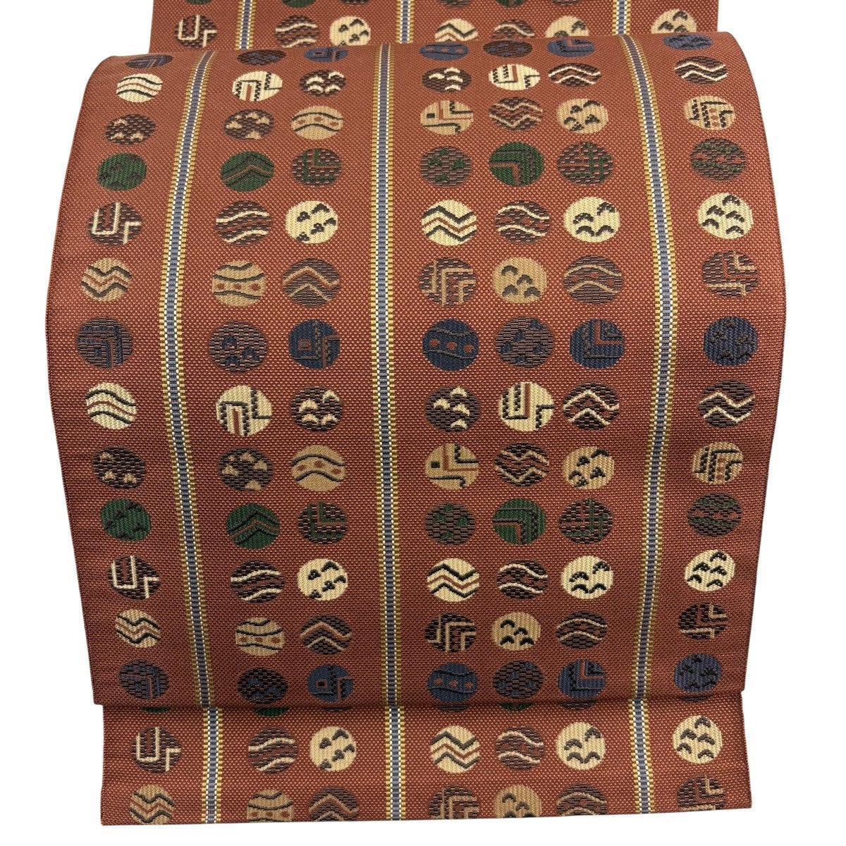【美品】 名古屋帯 名品 松葉仕立て 八寸名古屋帯 丸文 幾何学 赤茶 正絹