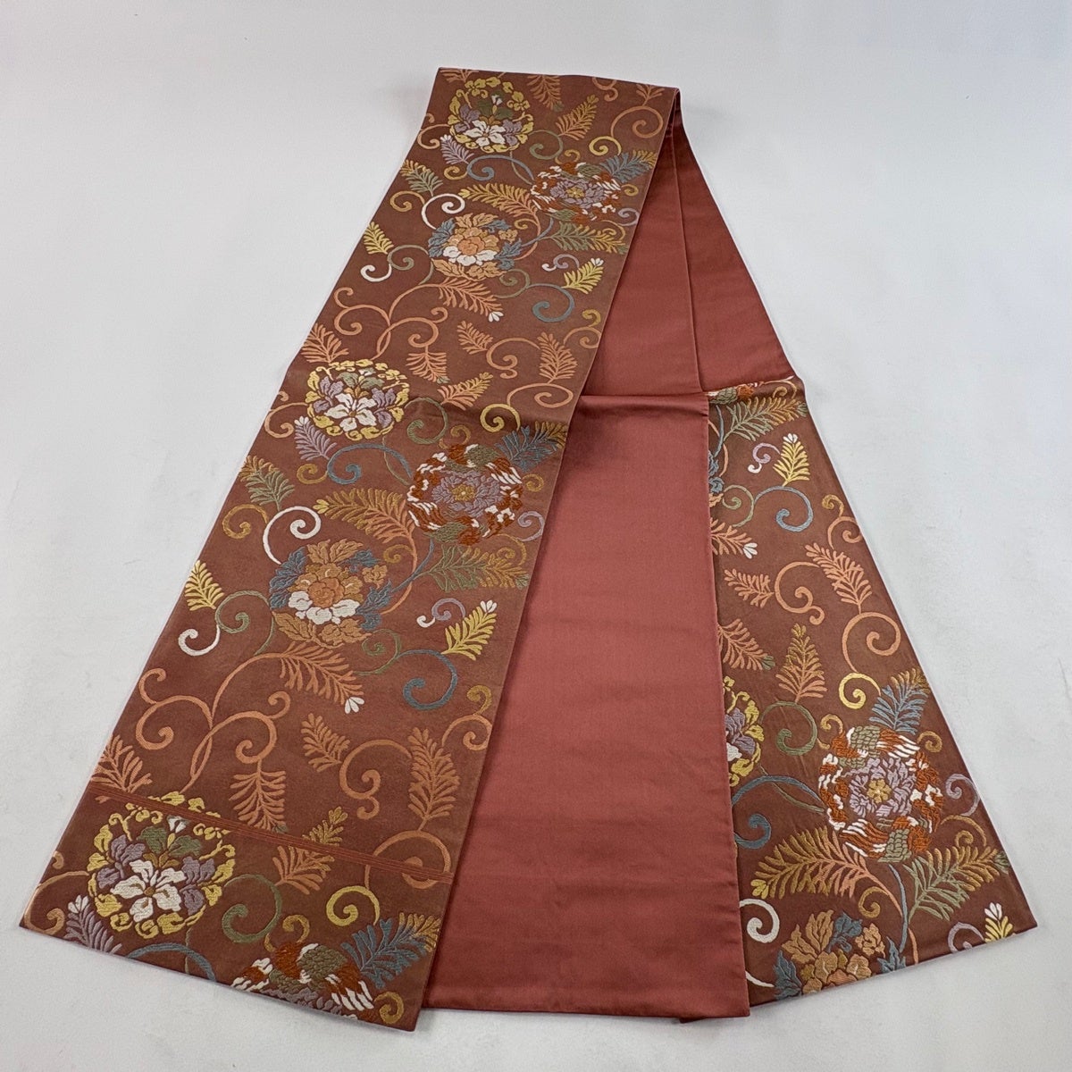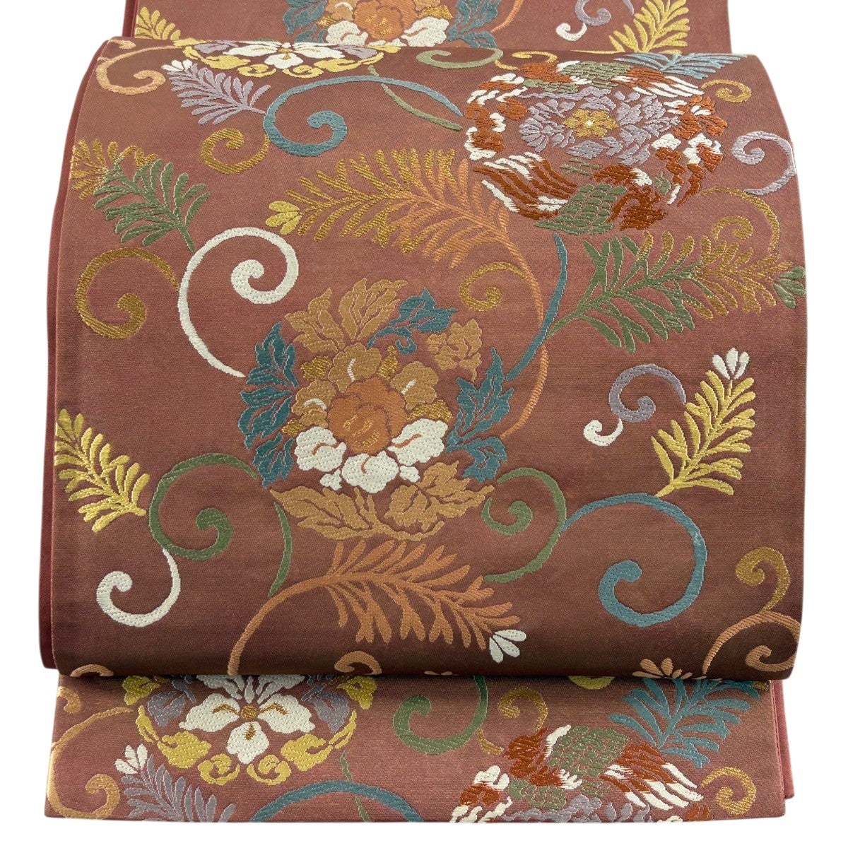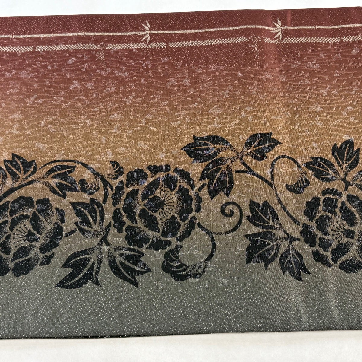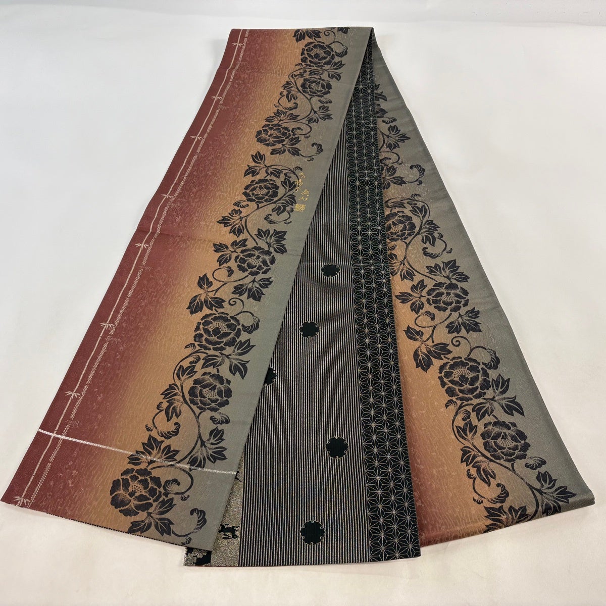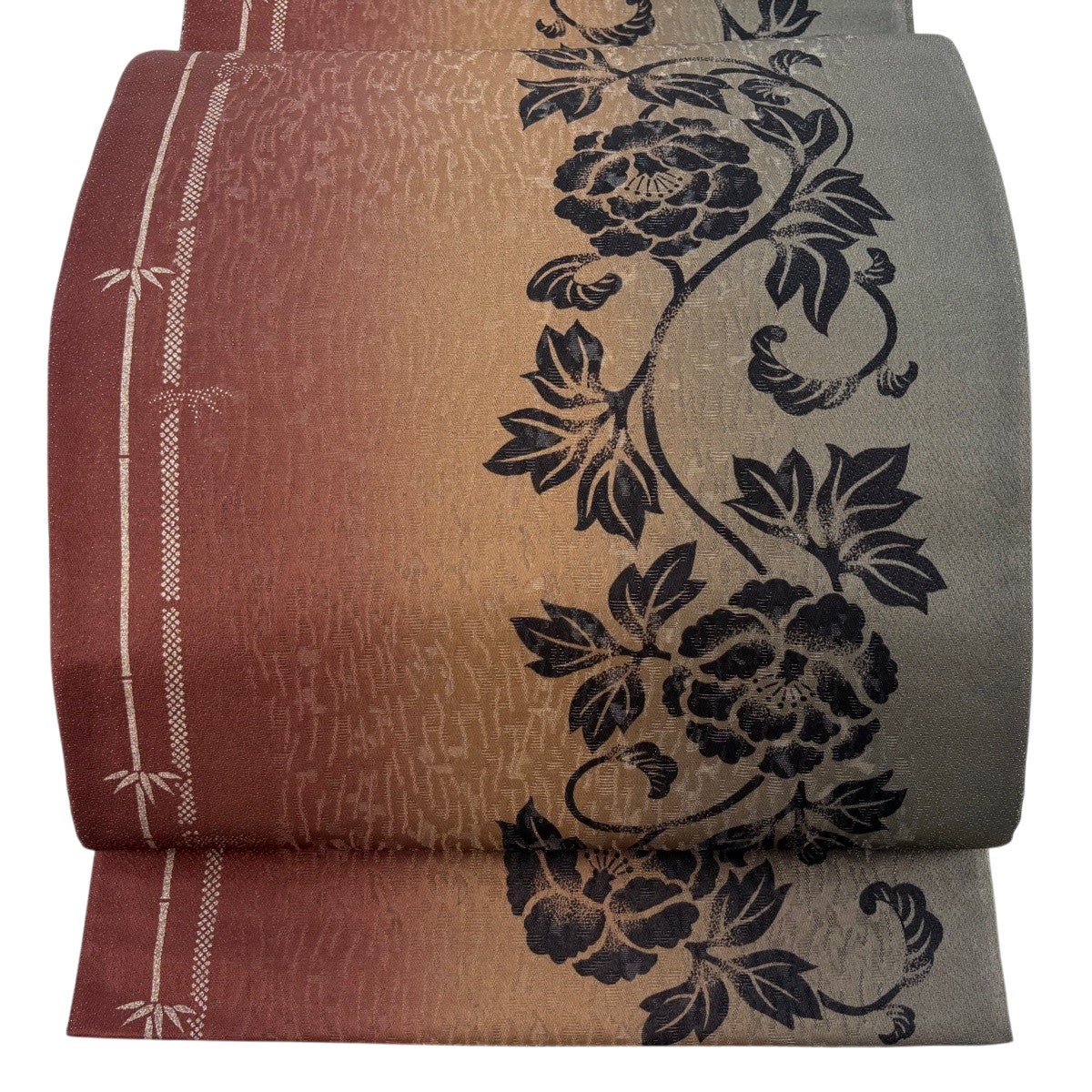 50%OFF 名古屋帯 秀品 草花 縮緬 ぼかし 赤茶 正絹 K50