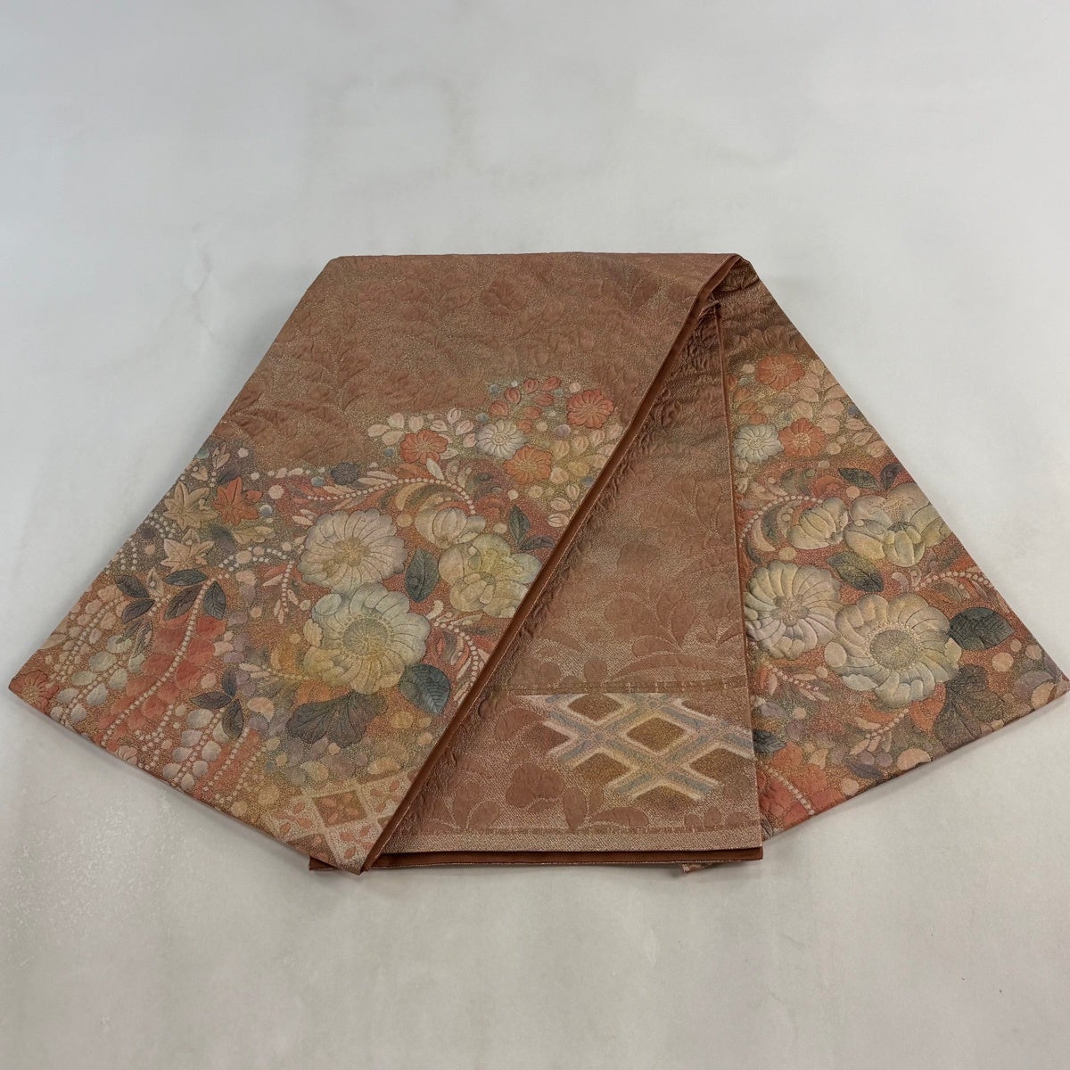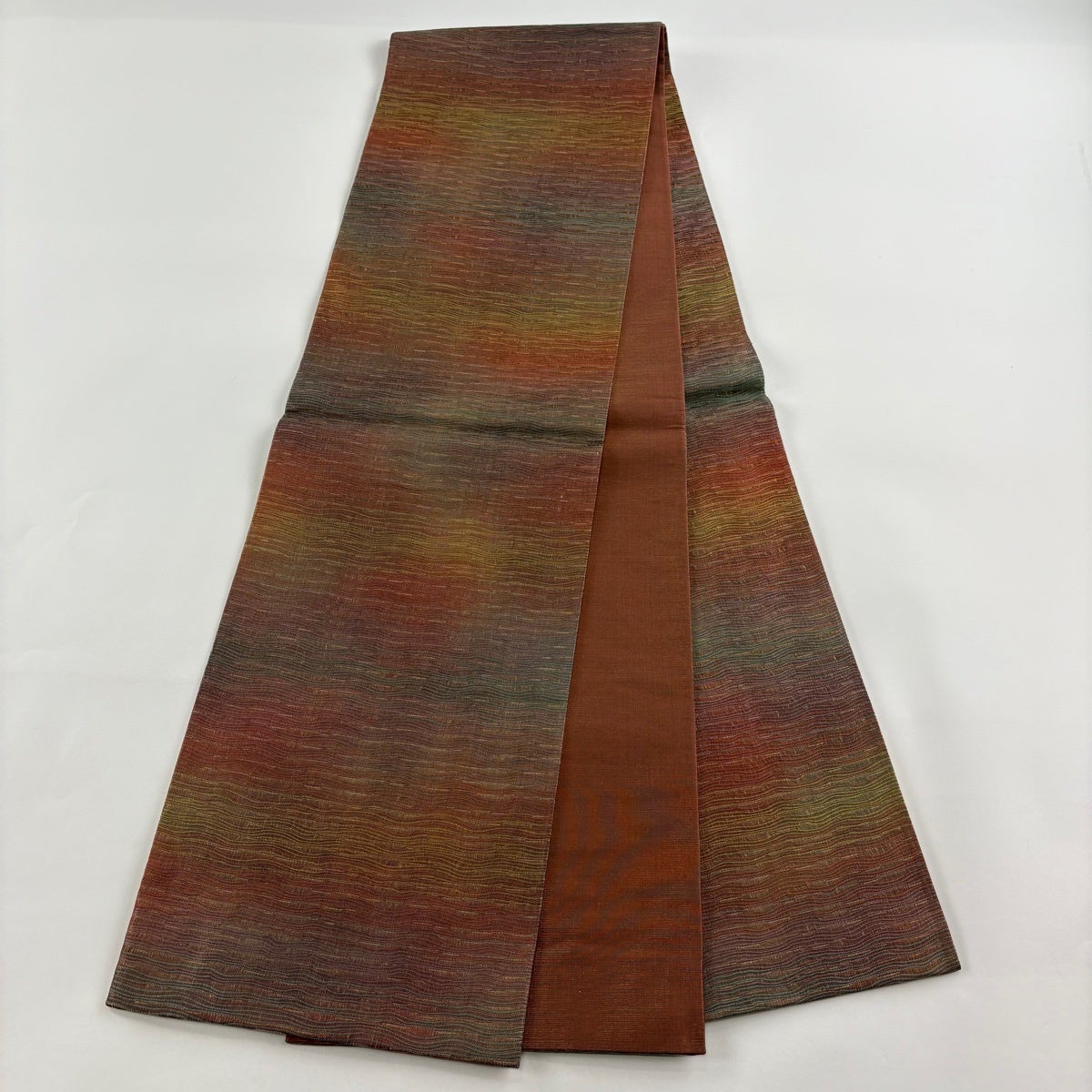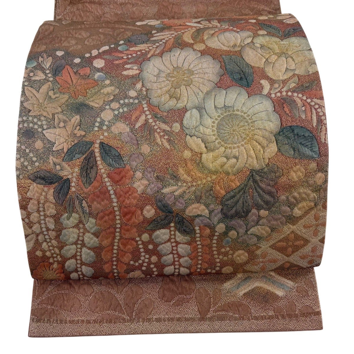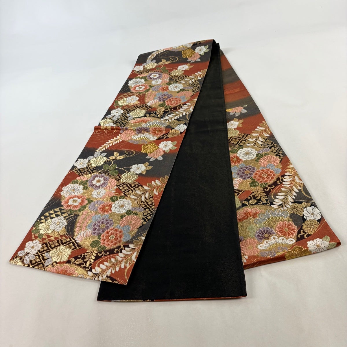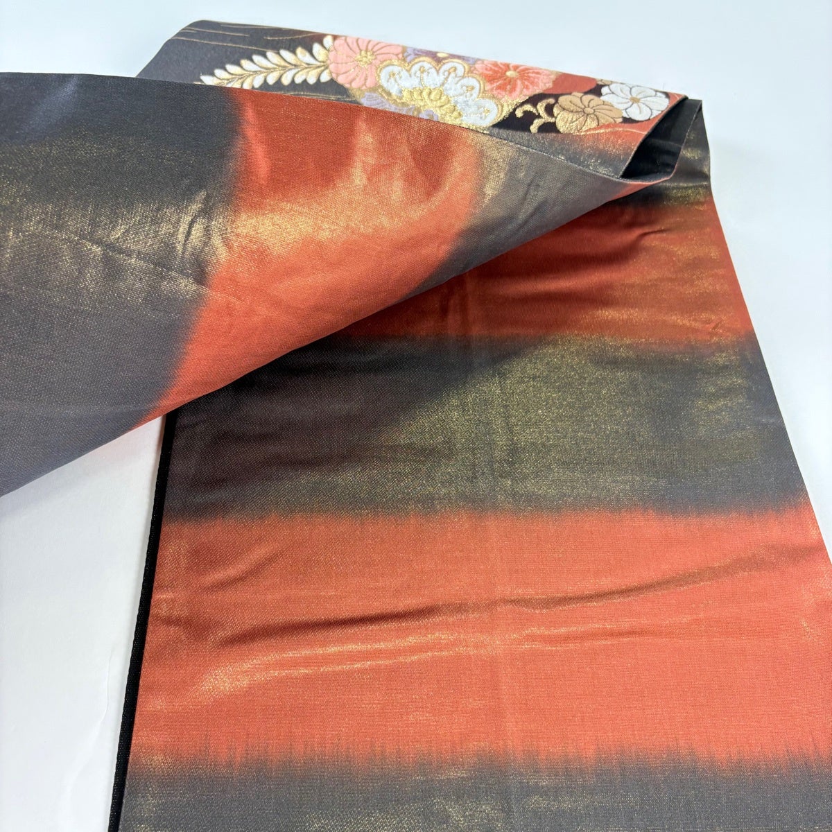 50%OFF 名古屋帯 秀品 草花 縮緬 ぼかし 赤茶 正絹 K50