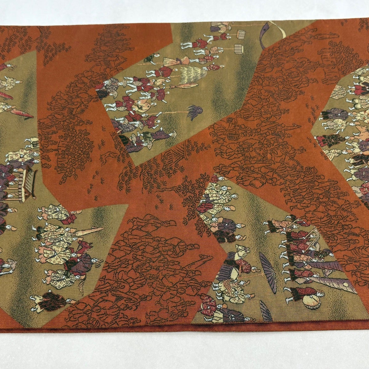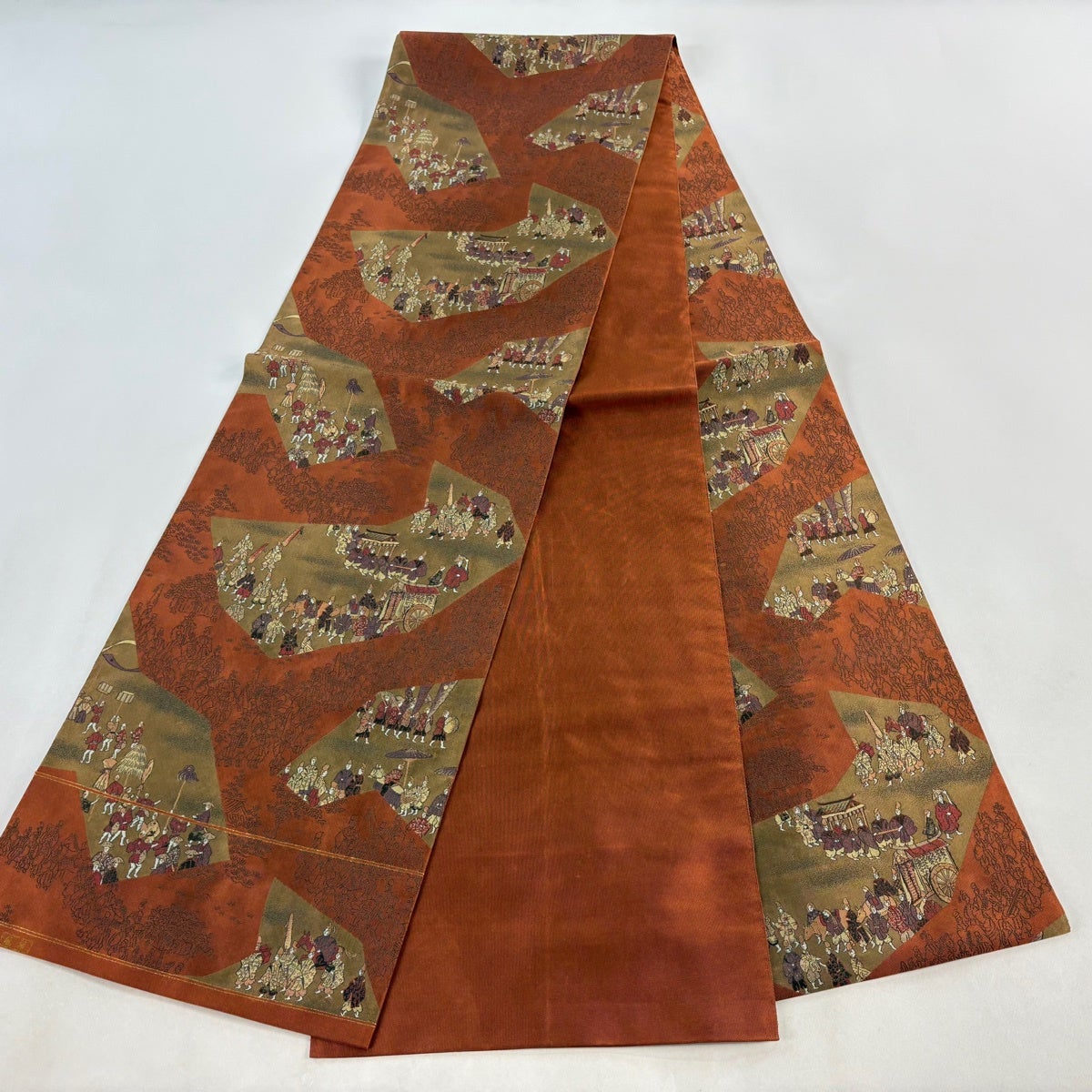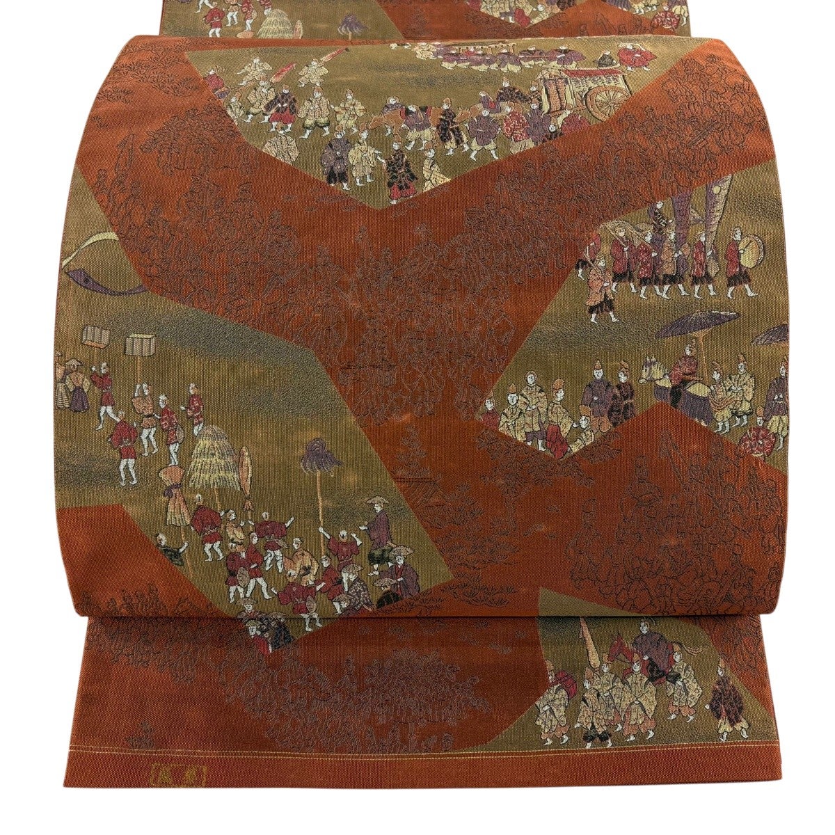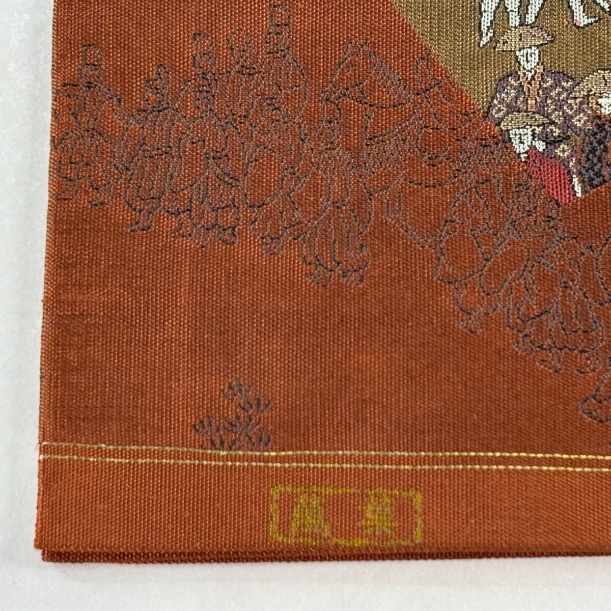 袋帯 秀品 落款あり 萬葉 関西仕立て 風景 人物 赤茶 全通 正絹
