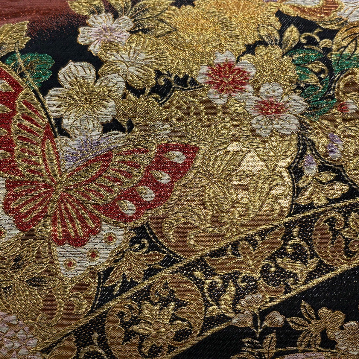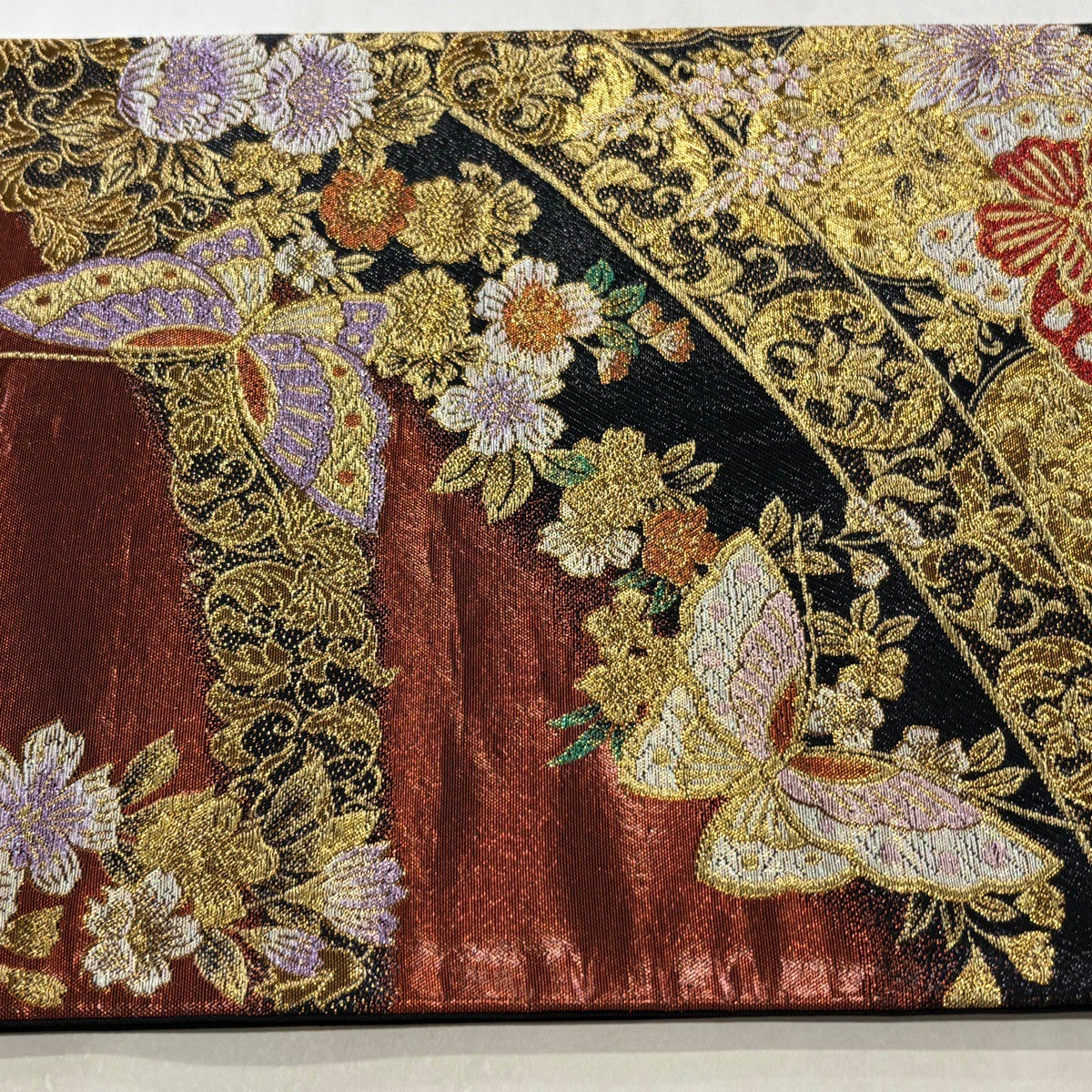 【美品】 袋帯 秀品 振袖向き 蝶 草花 箔 金糸 赤茶 六通 正絹