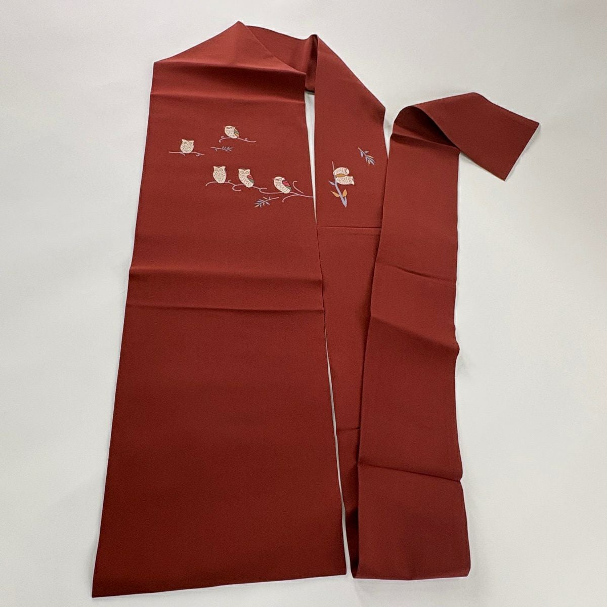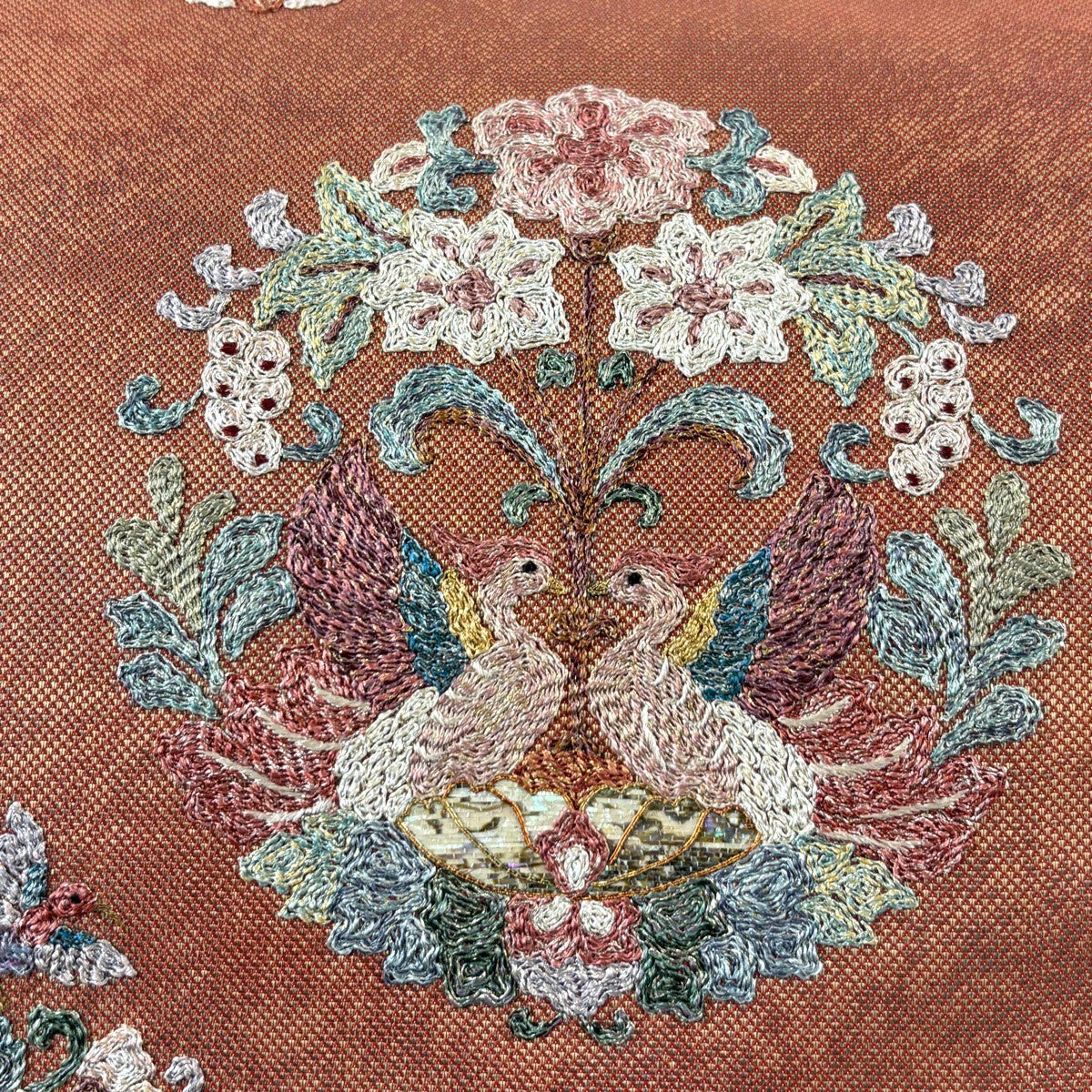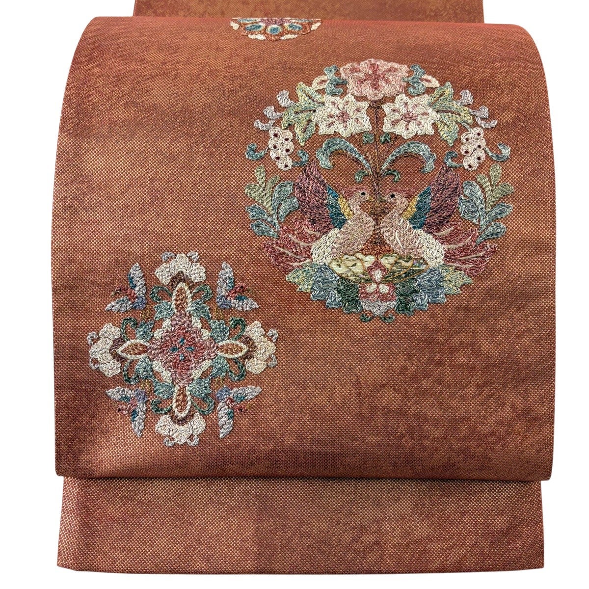 【美品】 袋帯 秀品 向かい鳥 華文 刺繍 箔 赤茶 お太鼓柄 正絹