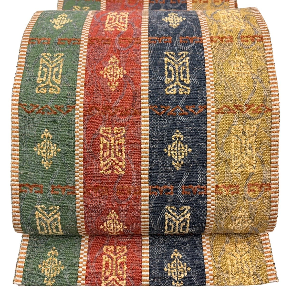 50%OFF 袋帯 秀品 華文 縞 金彩 赤茶 全通 正絹 K50