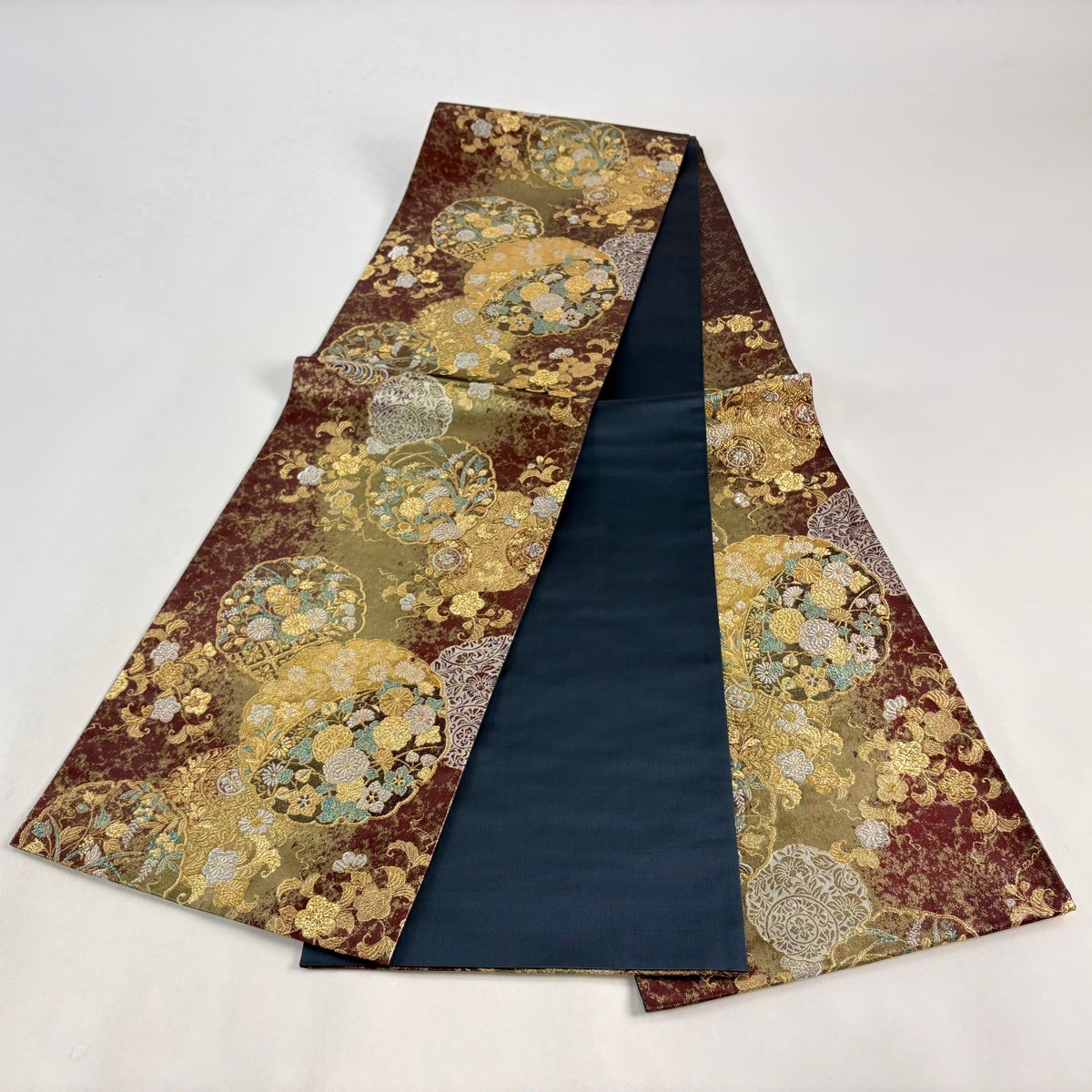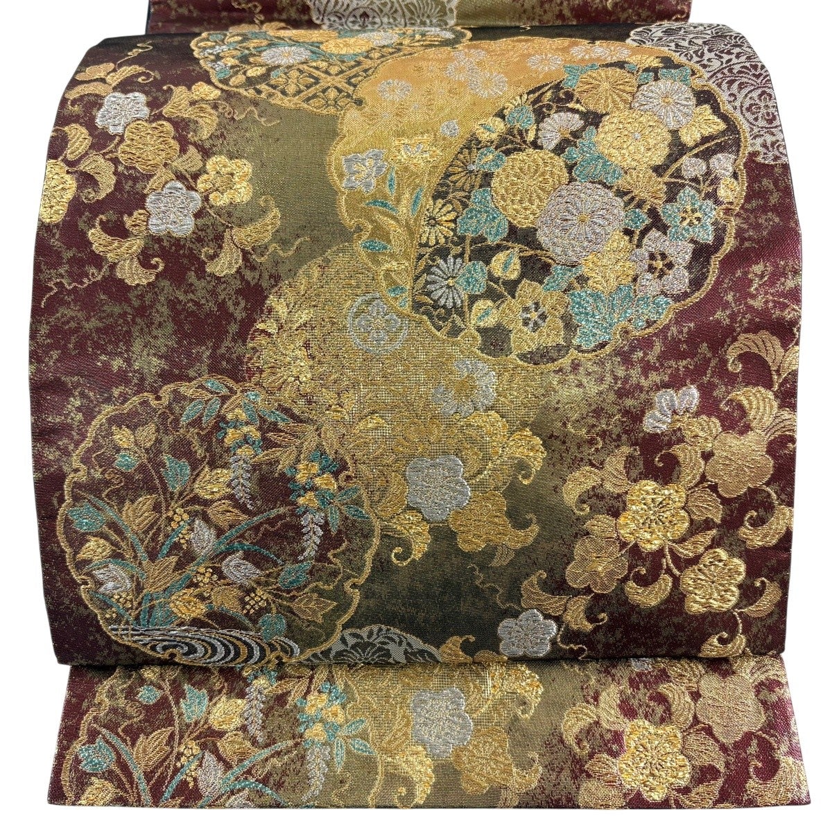 30%OFF 袋帯 秀品 華文 草花 箔 赤茶 六通 正絹 K30