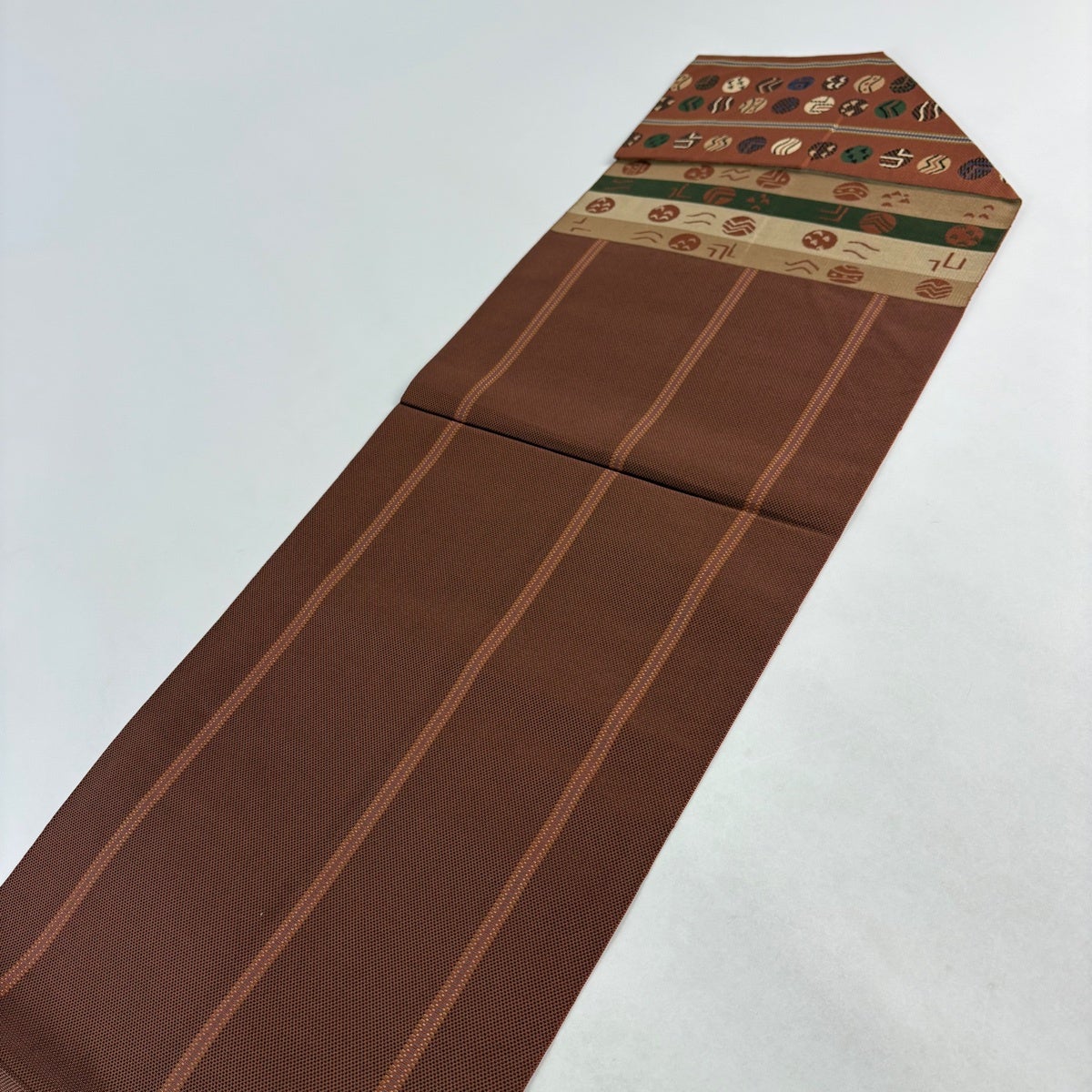 【美品】 名古屋帯 優品 八寸名古屋帯 松葉仕立て 草花 縞 赤茶 正絹