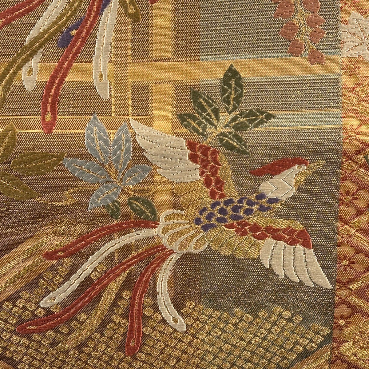 【美品】 名古屋帯 優品 落款あり 花鳥 器物 金糸 箔 赤茶 正絹