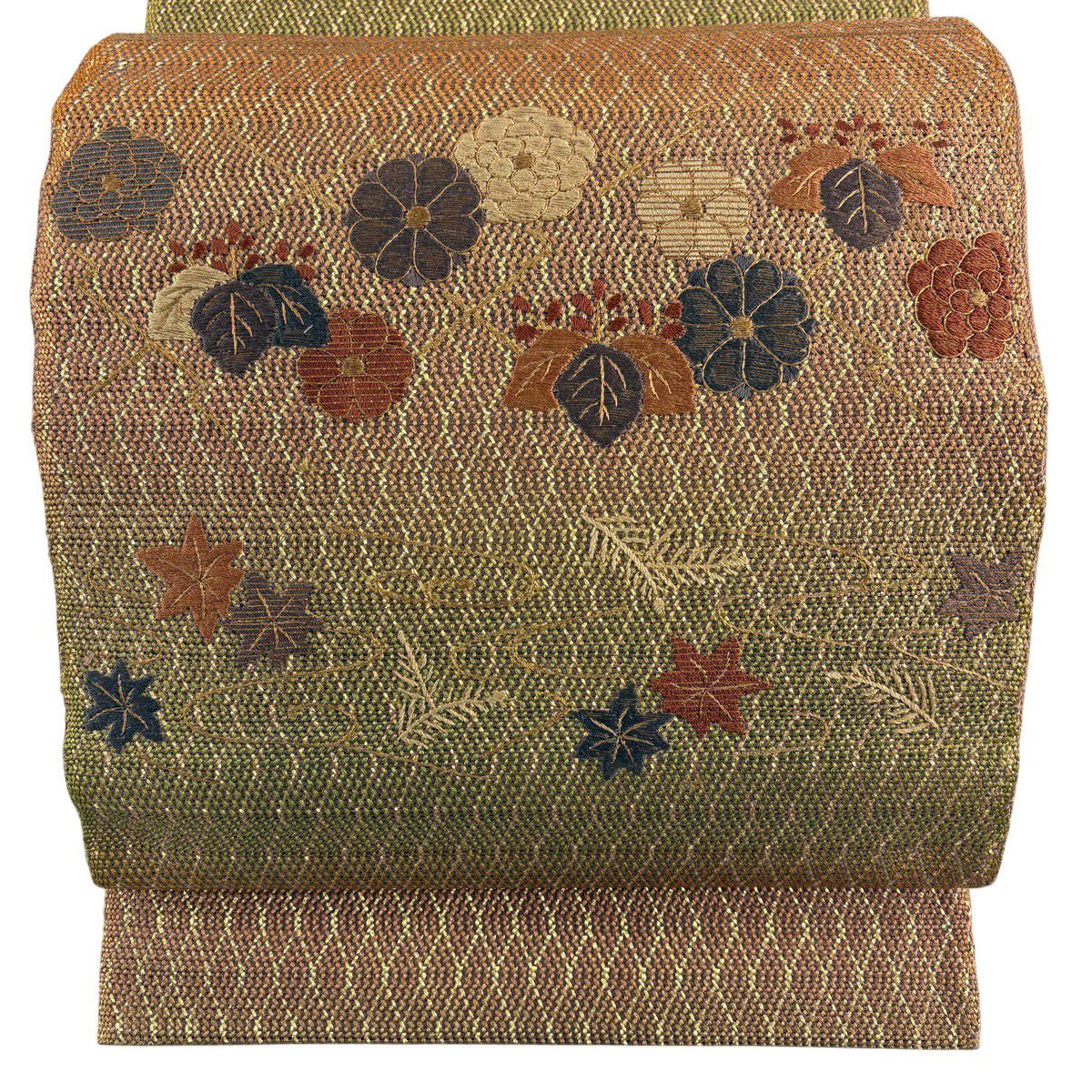 袋帯 秀品 段縞 草花 螺鈿 箔 赤茶 お太鼓柄 正絹