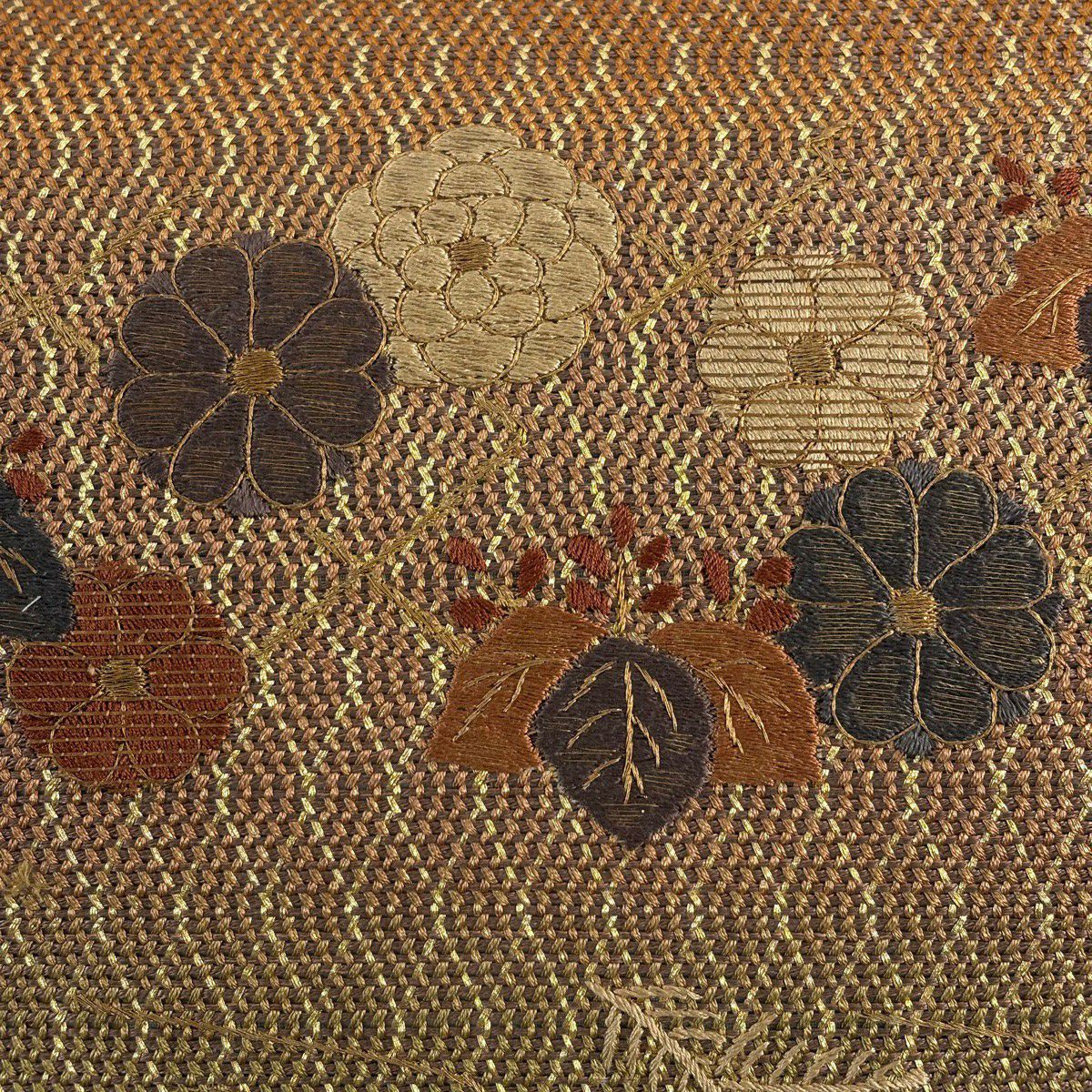 【美品】 名古屋帯 秀品 草花 刺繍 金彩 赤茶 正絹