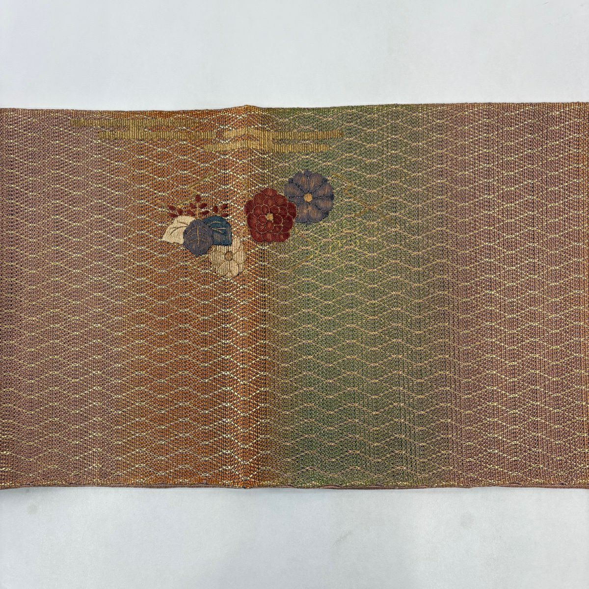 袋帯 秀品 花籠 青海波 唐織 金糸 赤茶 六通 正絹