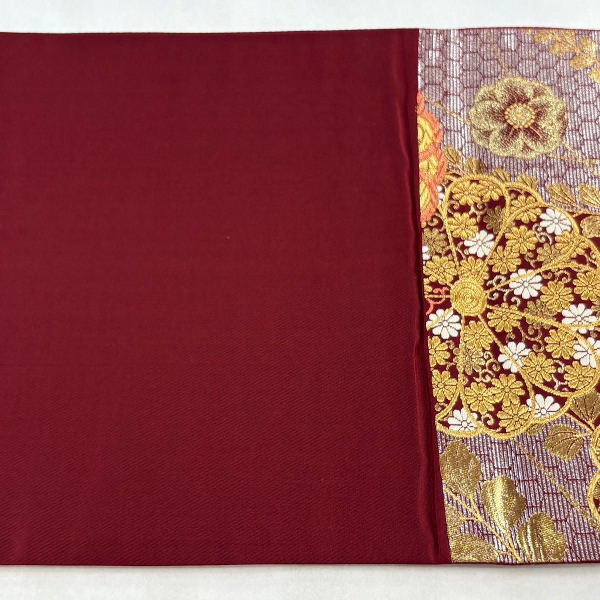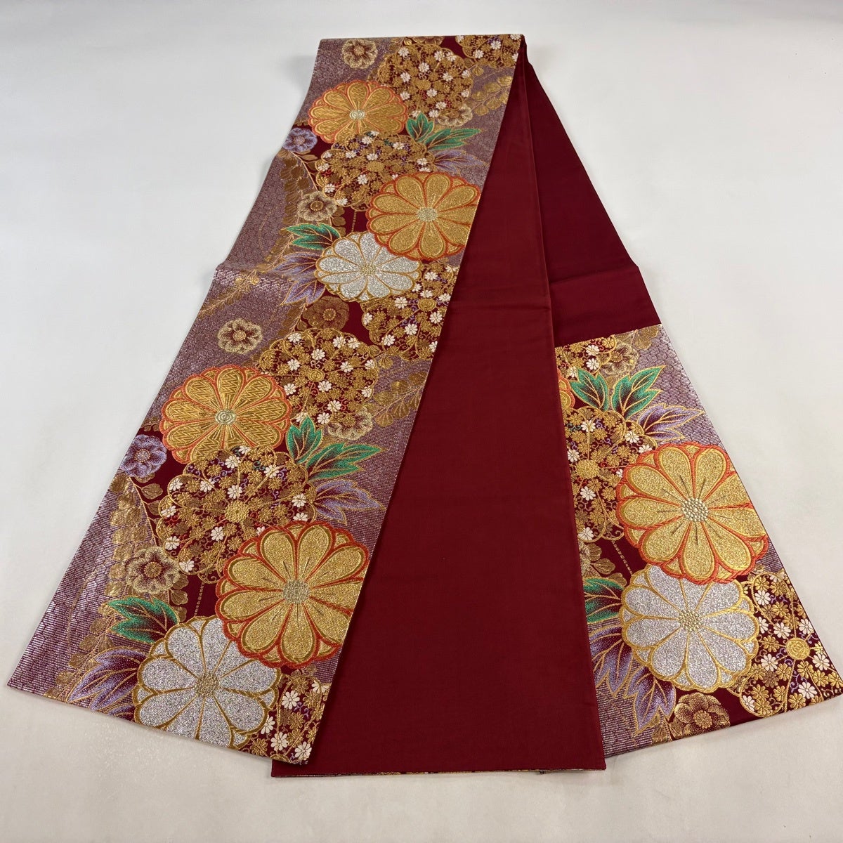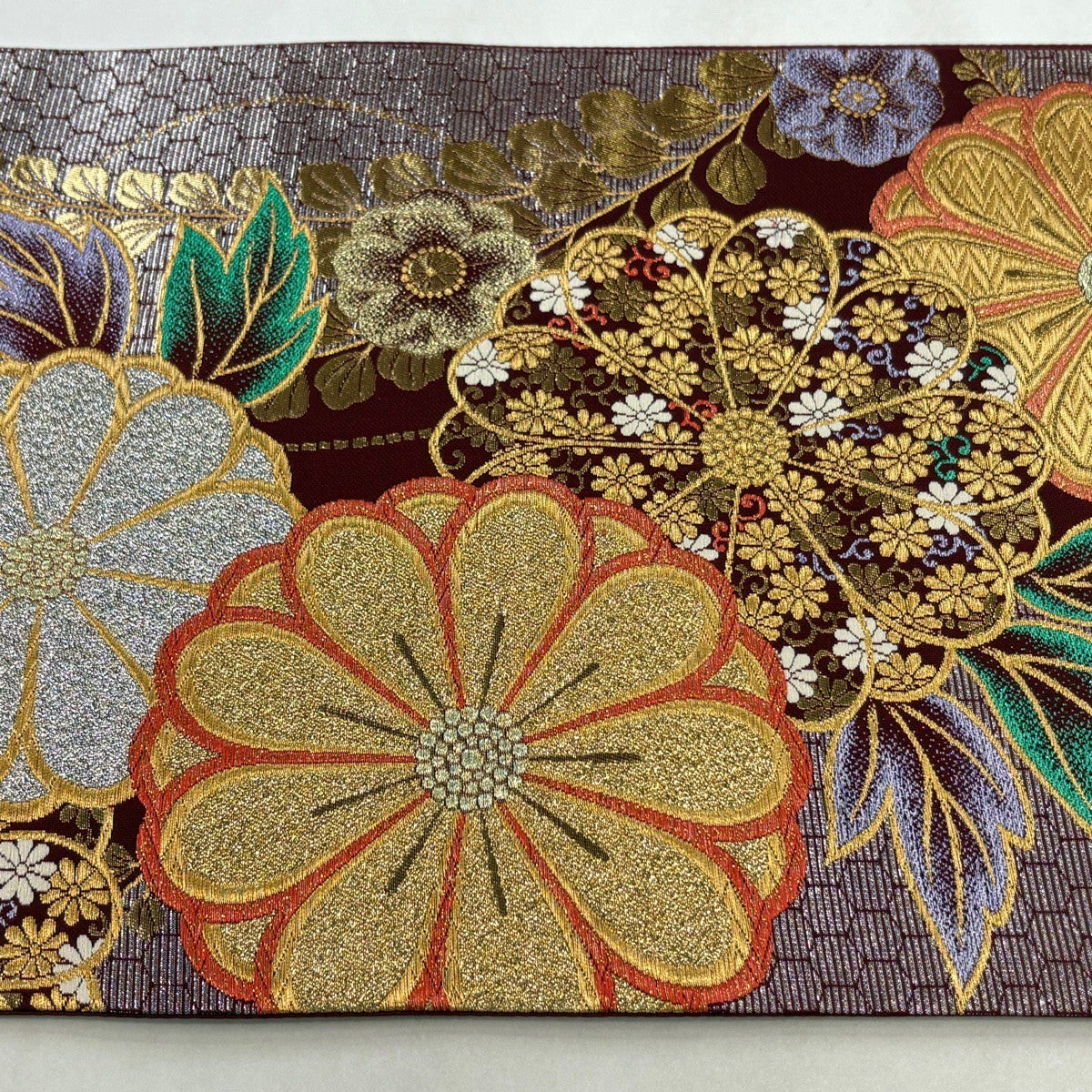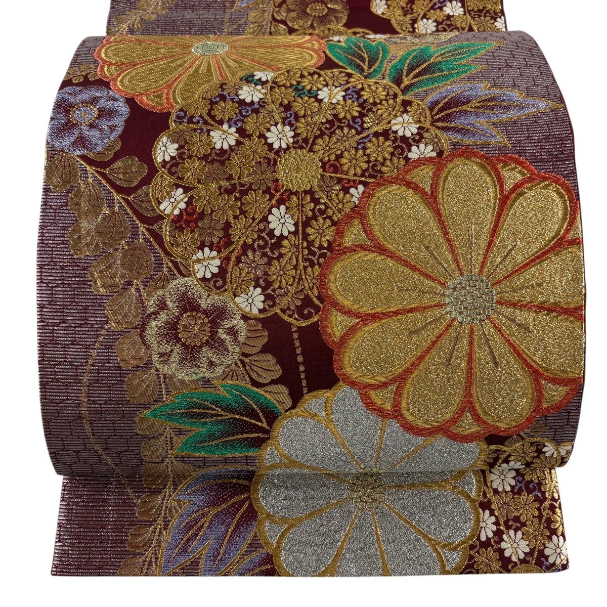 【美品】 袋帯 秀品 菊 草花 金糸 箔 赤紫 六通 正絹