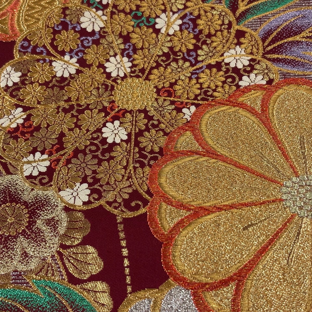 【美品】 袋帯 秀品 牡丹 菊 箔 金糸 赤紫 六通 正絹
