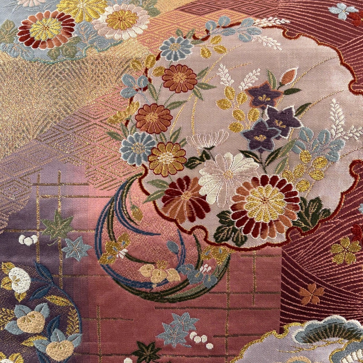 袋帯 名品 落款あり 草花 楓 箔 銀糸 赤紫 お太鼓柄 正絹