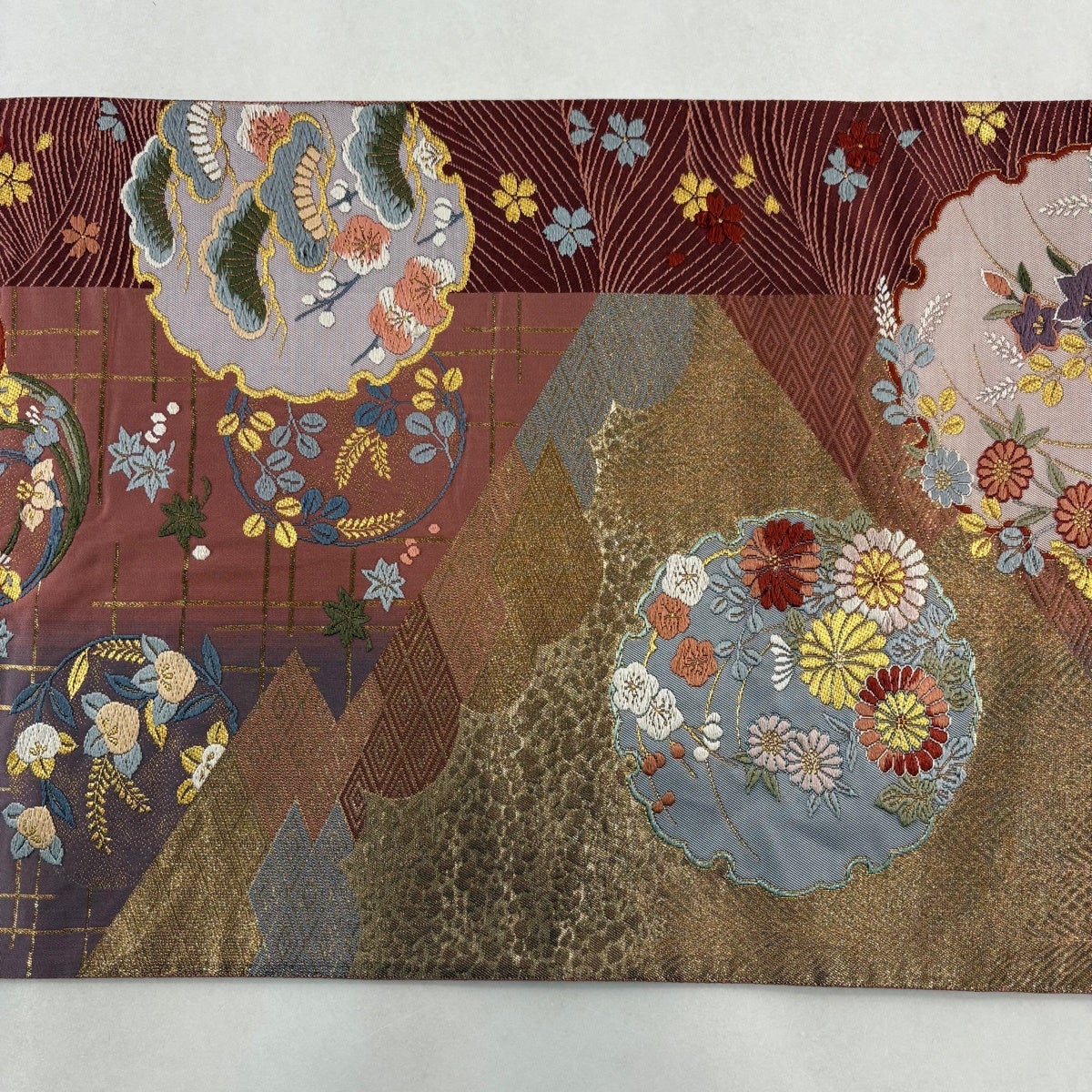 袋帯 秀品 関西仕立て 扇面 蝶 金糸 唐織 赤茶 六通 正絹