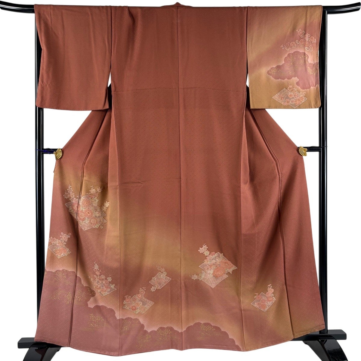 【美品】 訪問着 身丈166cm 裄丈68cm L 袷 御所車 牡丹 金彩 ぼかし 赤茶 正絹 優品