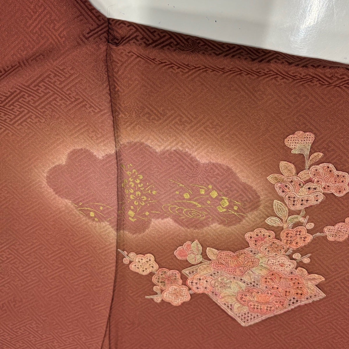 【美品】 付下げ 身丈165.5cm 裄丈65cm M 袷 華文 蔓帯 刺繍 ぼかし 赤茶 正絹 秀品