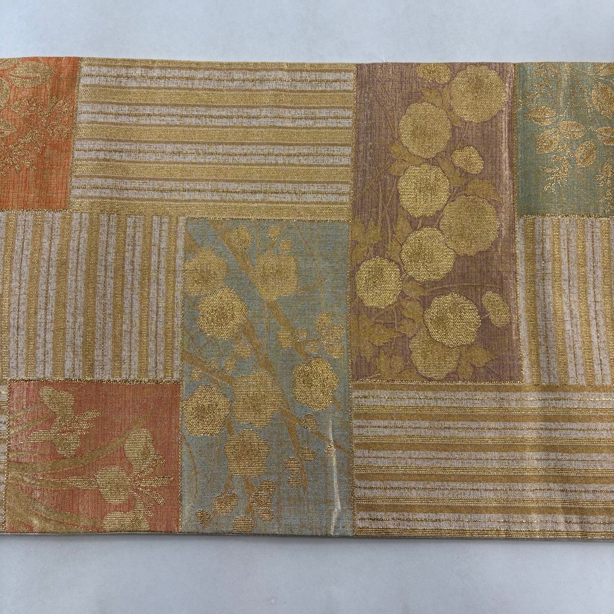 【美品】 袋帯 秀品 枝梅 縞 箔 薄オレンジ 六通 正絹