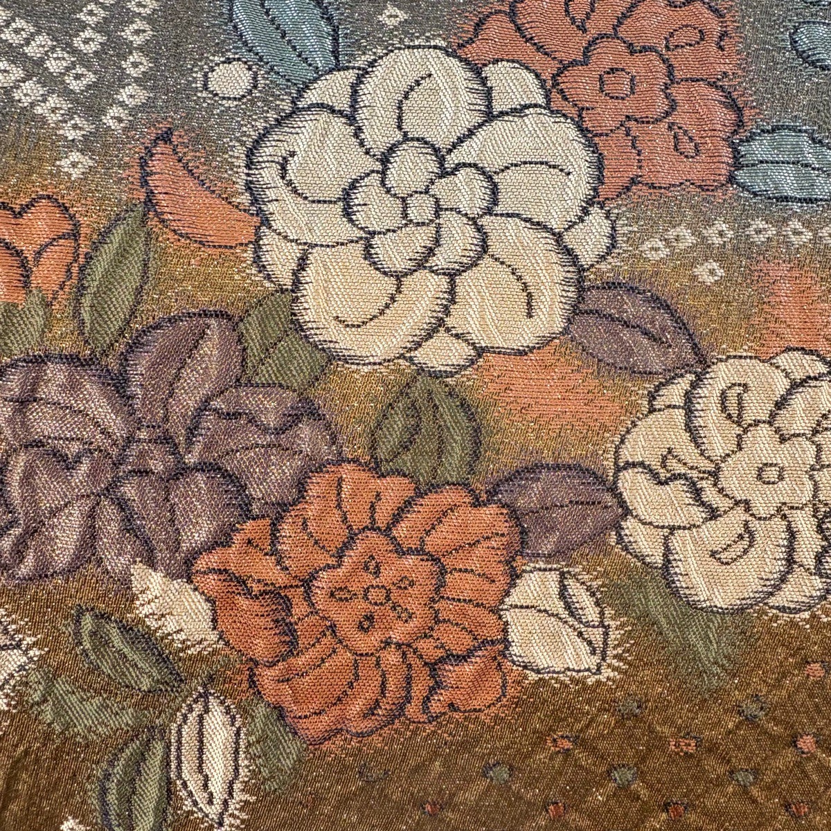 【美品】 袋帯 秀品 彩辻が花 草花 辻が花 箔 茶緑色 六通 正絹